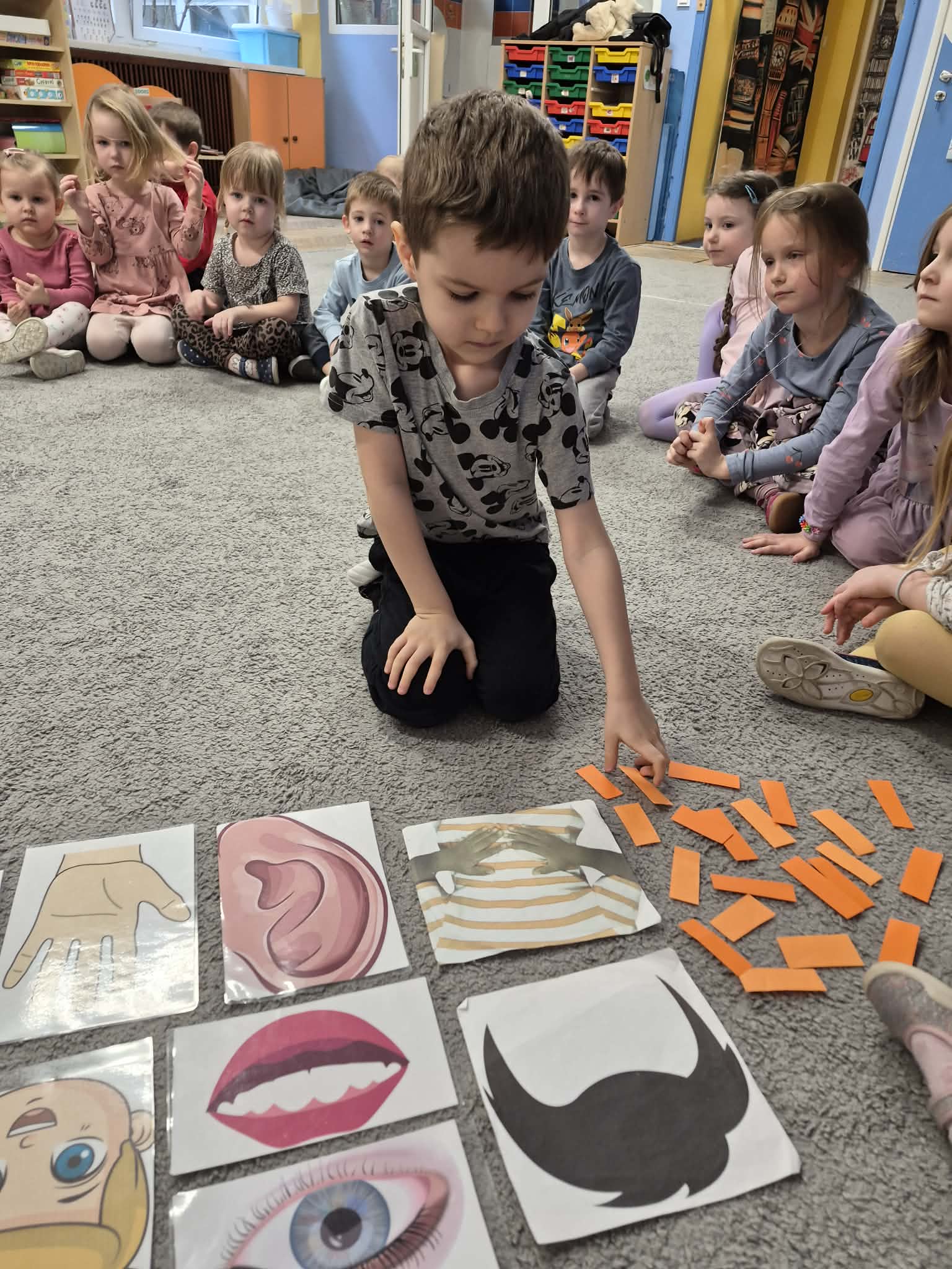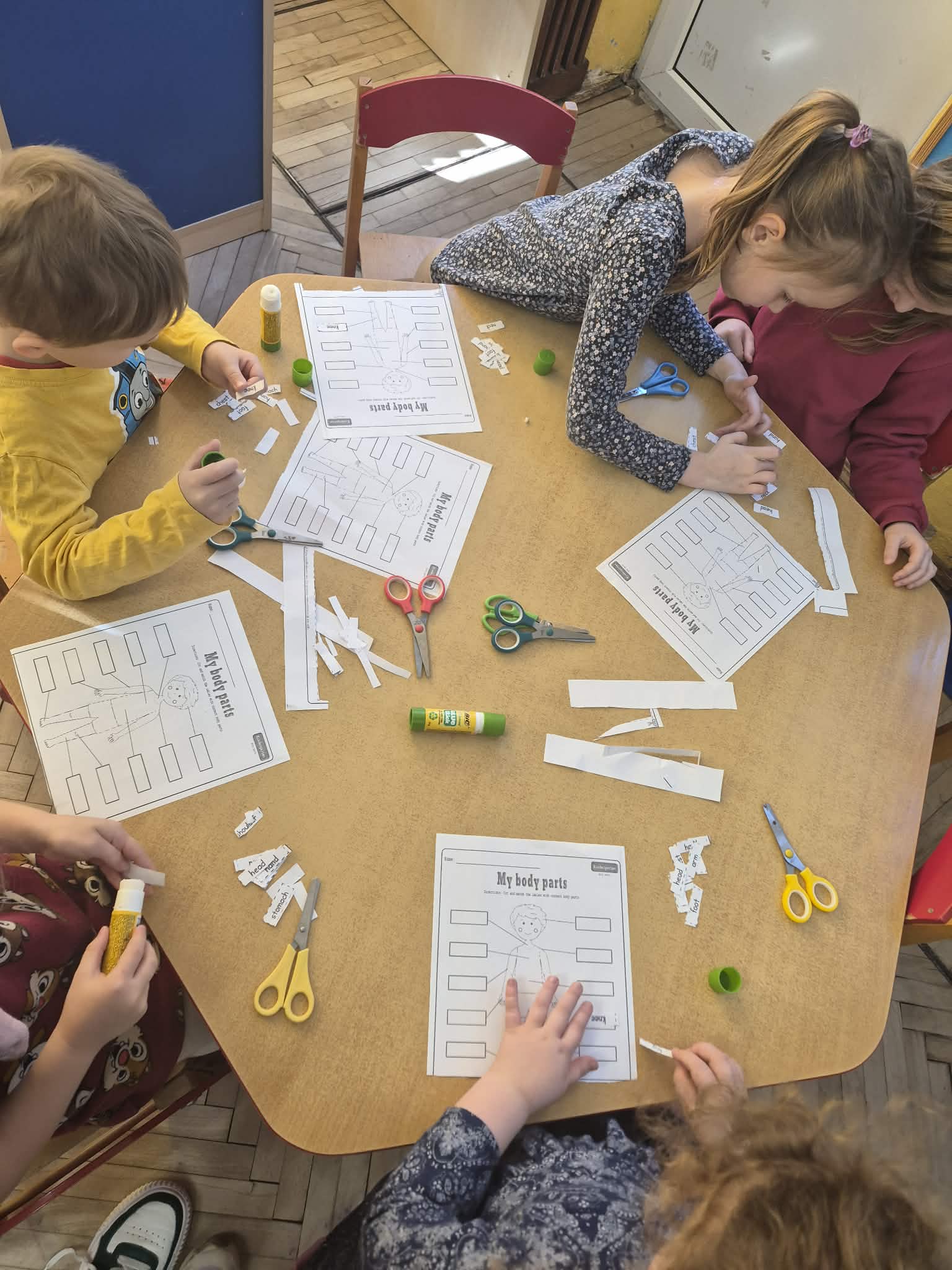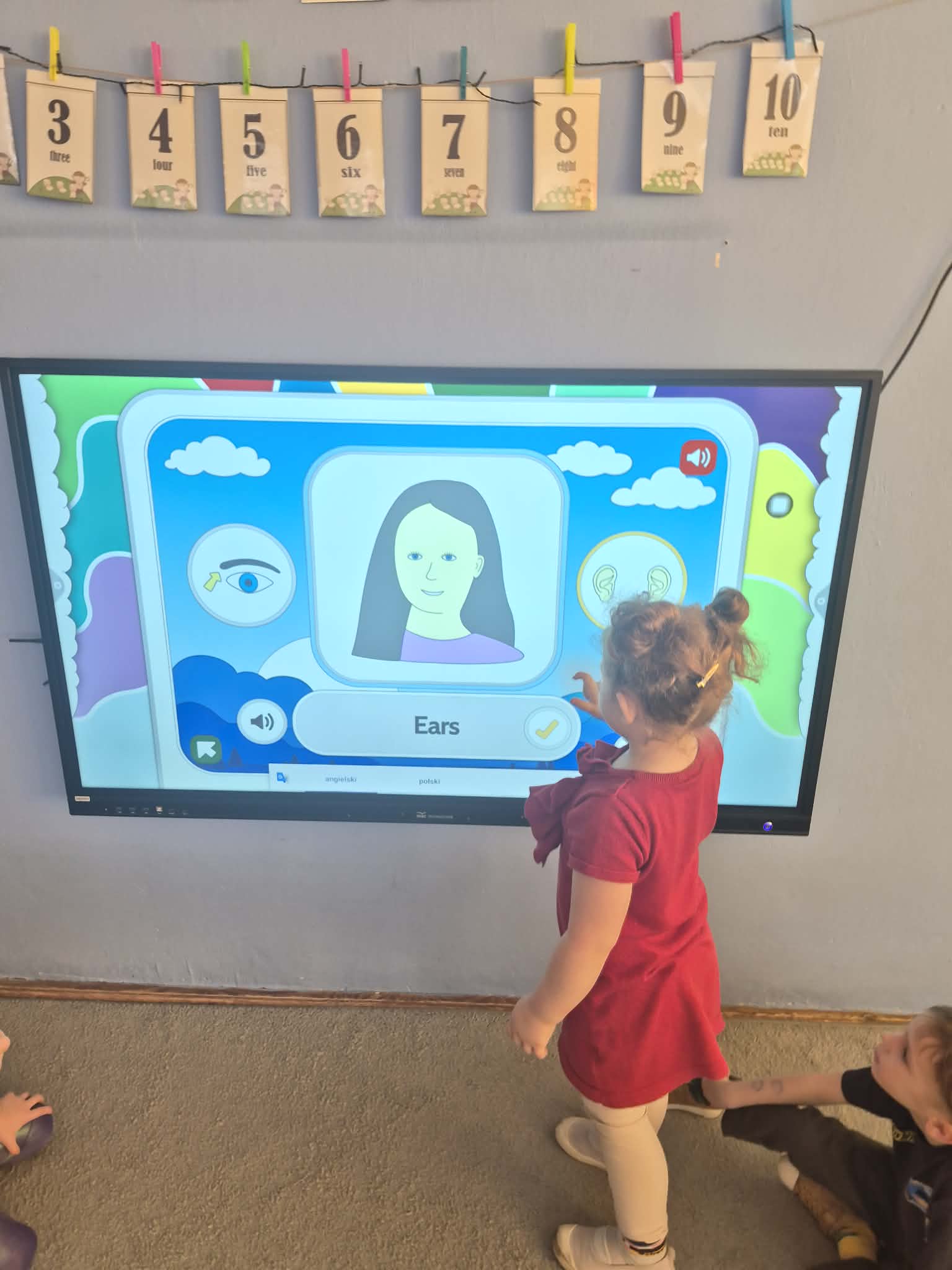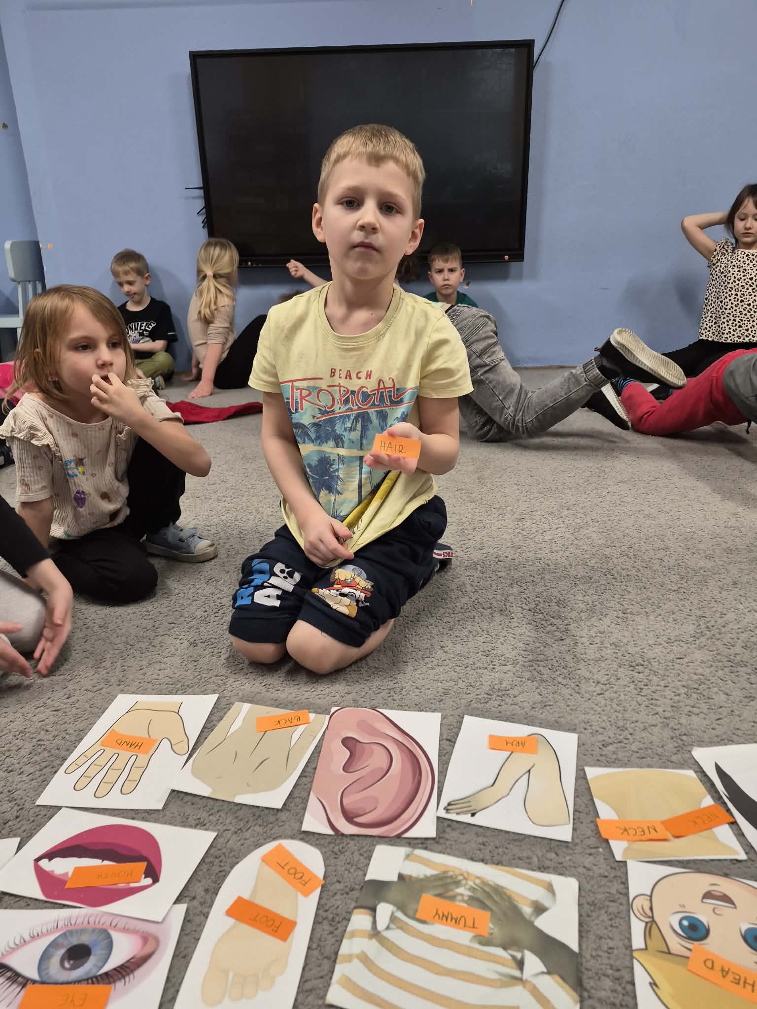 W tym tygodniu dzieci uczyły się następujących słówek: head – głowa, leg- noga, arm – ręka, tummy – brzuszek,back - plecy,eye - oko,ear – ucho,mouth – buzia, foot - stopa,nose – nos.Najwięcej radości przyniosły dzieciom ćwiczenia gimnastyczne i zabawa „Simon says…”. Bawiliśmy się też do piosenki "Head, shoulders, knees and toes". Cały tydzień nauki podsumowaliśmy podczas Wielkiego Quizu na tablicy multimedialnej.