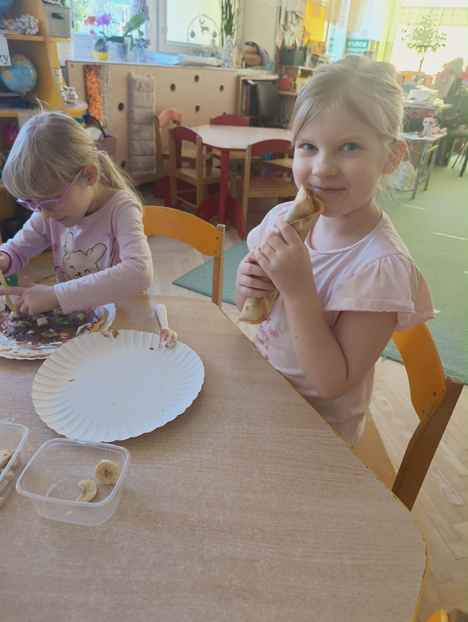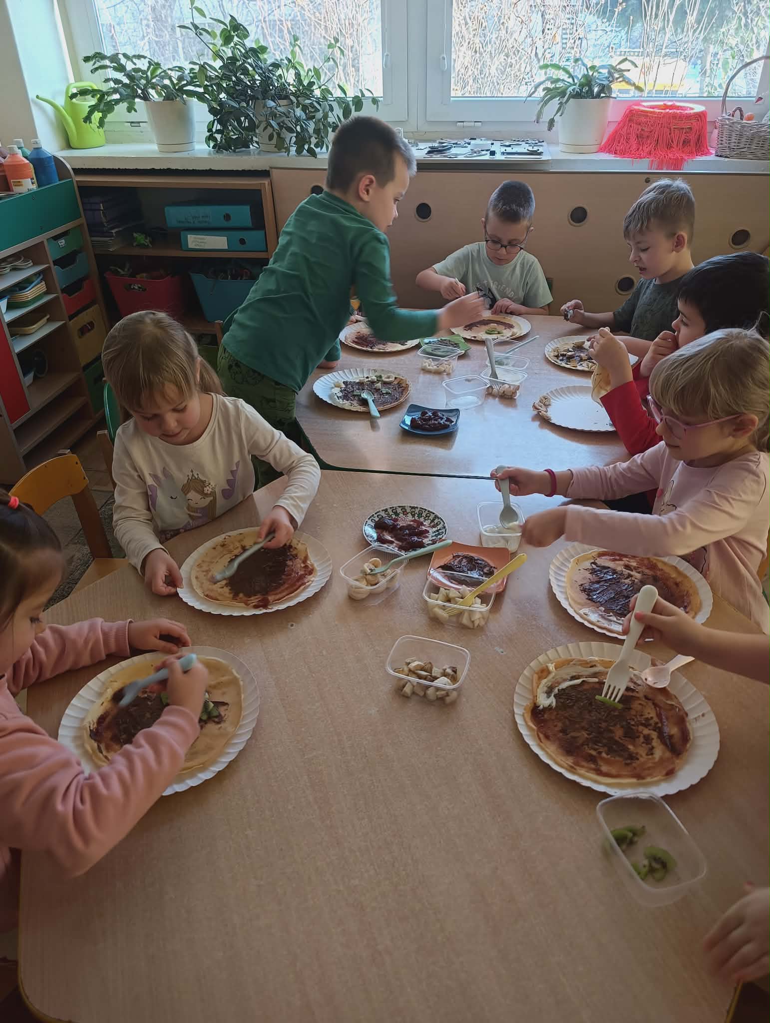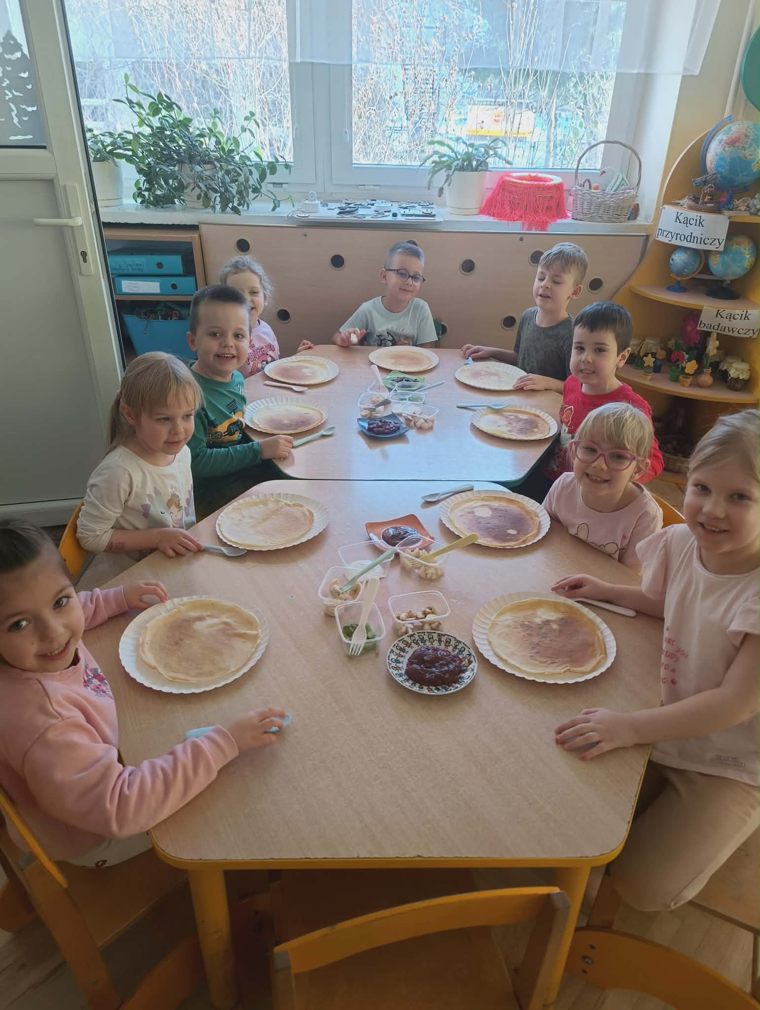 Obchodziliśmy dziś wyjątkowy Dzień Naleśnika. Było smacznie, wesoło i bardzo aktywnie! Dzieci miały okazję samodzielnie przygotować swoje naleśniki. Każdy mógł wybrać ulubione dodatki – dżem, Nutellę, serek czy świeże owoce. Najwięcej radości sprawiło oczywiście dekorowanie i tworzenie własnych, pysznych kompozycji. Nie zabrakło również zabaw ruchowych związanych z tematem dnia. Przedszkolaki z dużym zaangażowaniem brały udział w zabawie „Zwijanie naleśnika”, która dostarczyła wszystkim dużo śmiechu i dobrej energii. To był bardzo radosny dzień pełen smaków, zabawy i wspólnego działania. Takie chwile uczą dzieci samodzielności, współpracy oraz sprawiają, że nauka przez zabawę staje się jeszcze przyjemniejsza.
