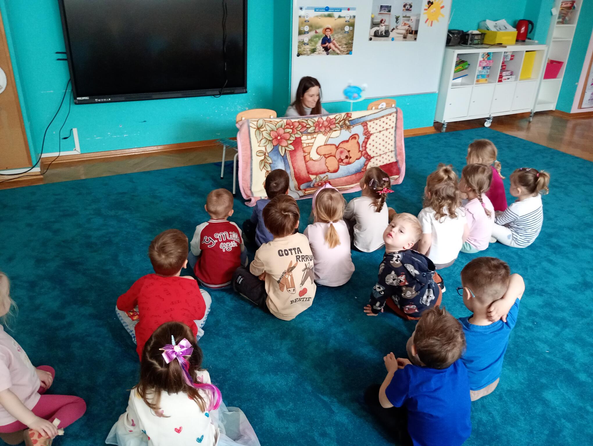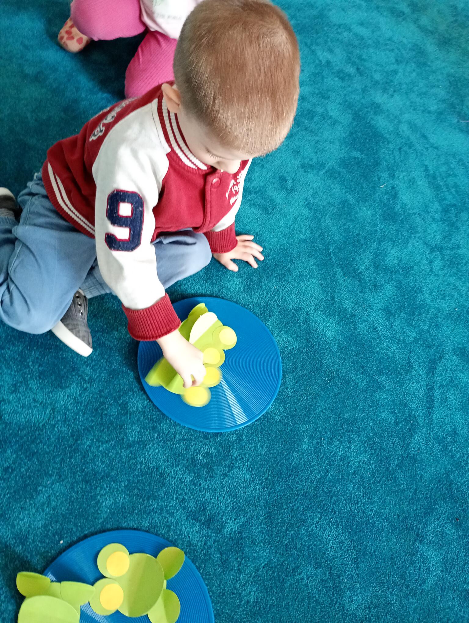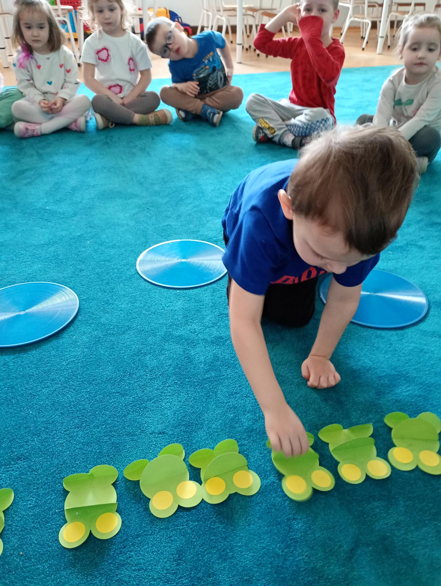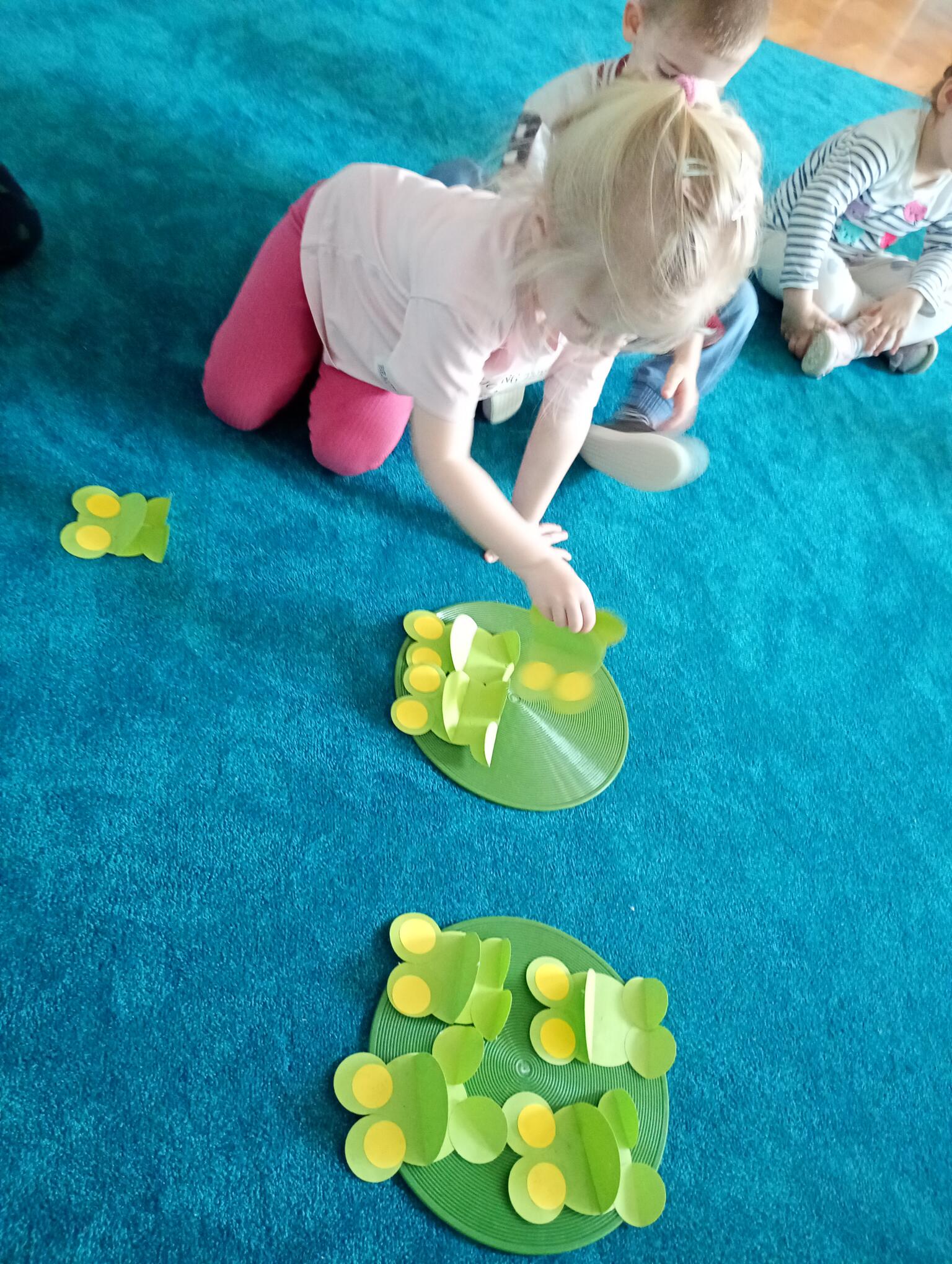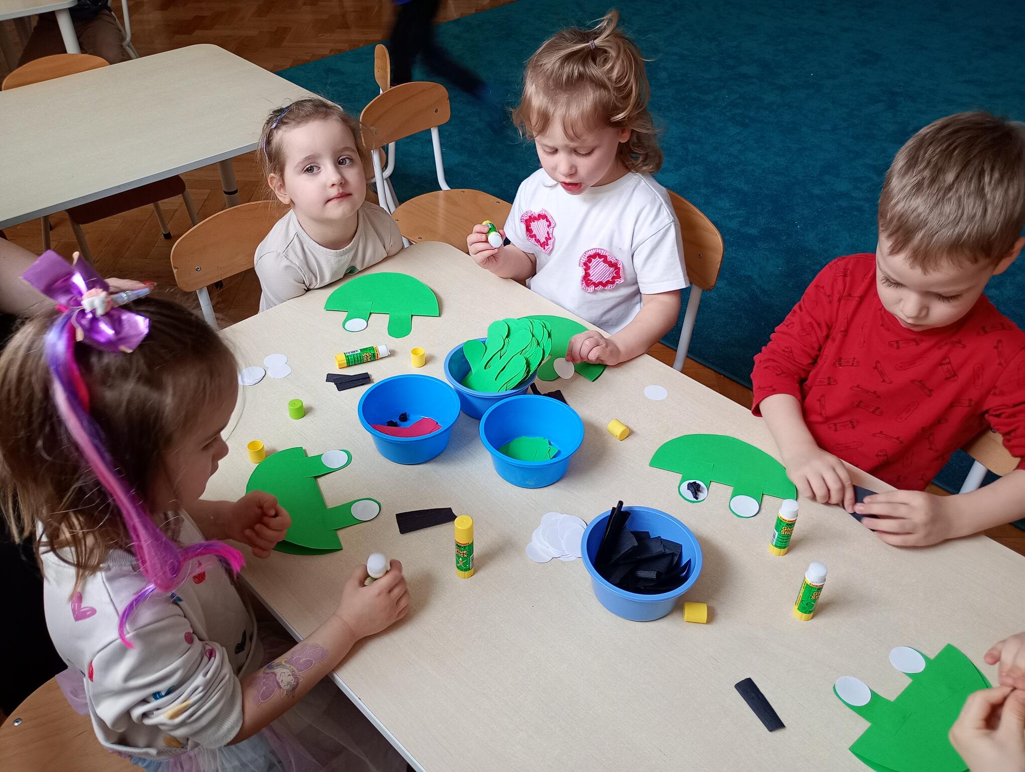 Dzisiaj w grupie "Kotków" dzieci świętowały Dzień Żaby. Maluszki słuchały wiersza "Zielona żabka" B. Formy ilustrowanego sylwetami bohaterów podczas teatrzyku, bawiły się w zabawy matematyczne z sylwetami żabek i w zabawy ruchowe. Na koniec maluszki wykonały tematyczną pracę plastyczną.