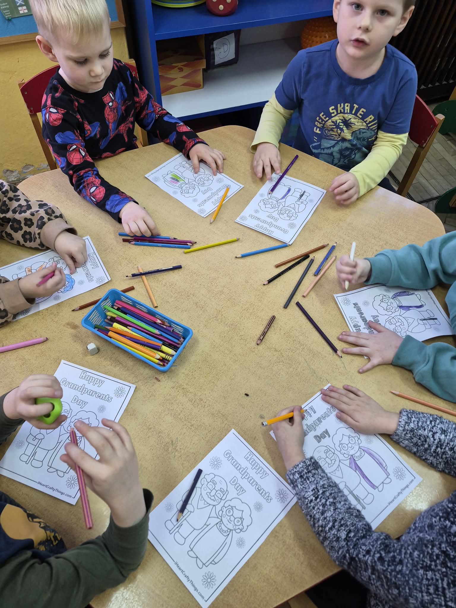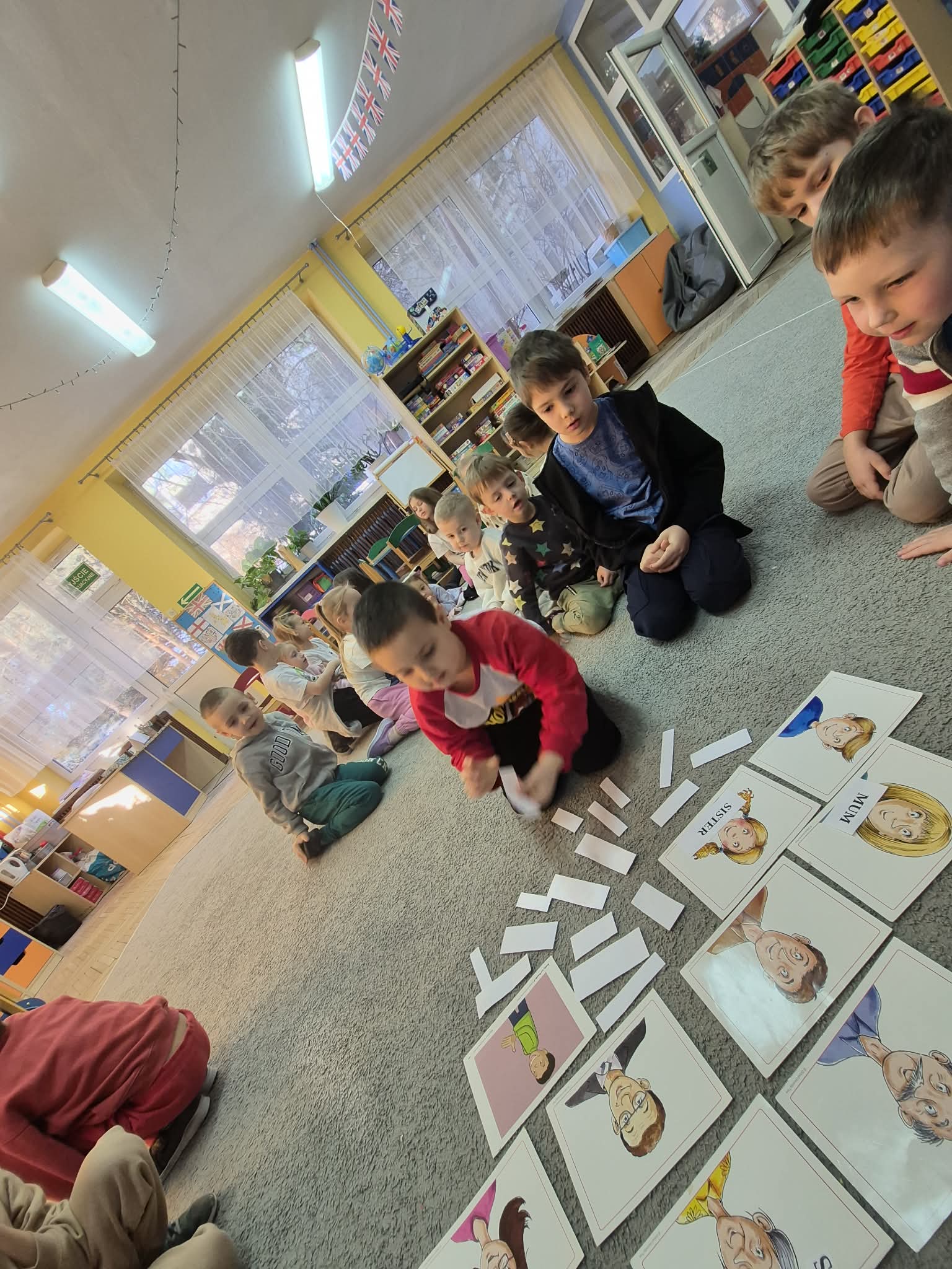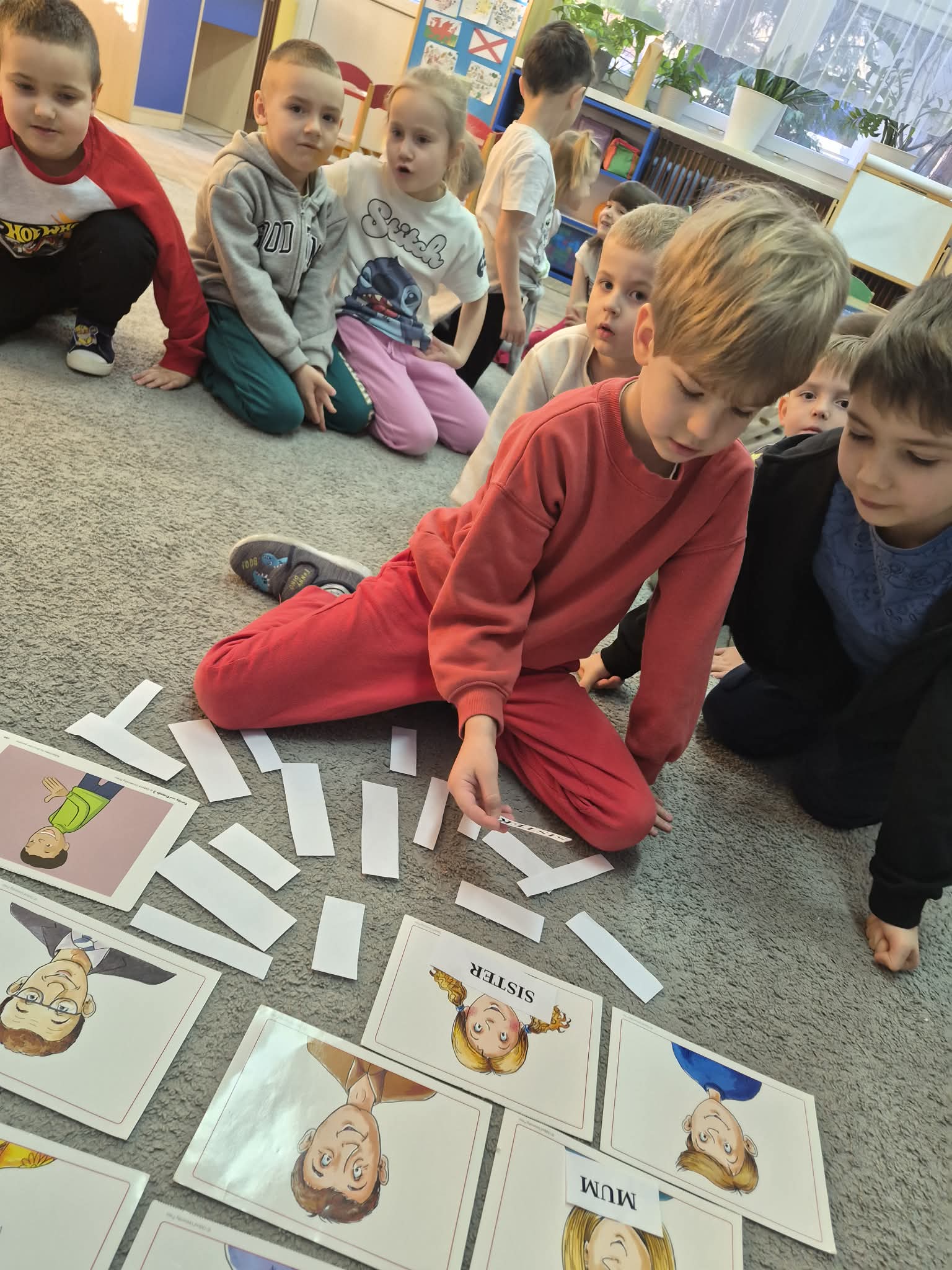 Poznaliśmy nazwy członków najbliższej rodziny. Dzieci chętnie opowiadały o swoich cudownych rodzinach i rysowały ich portrety. Wspólnie śpiewaliśmy piosnki "Baby shark" oraz "This is my family". Poznane słownictwo: mama - mom, tata - dad, babcia - grandma, dziadek - grandpa, siostra - sister, brat - brother, ciocia - aunt, wujek - uncle. Na koniec tygodnia wszystkie dzieci stworzyły piękne laurki dla swoich dziadków.