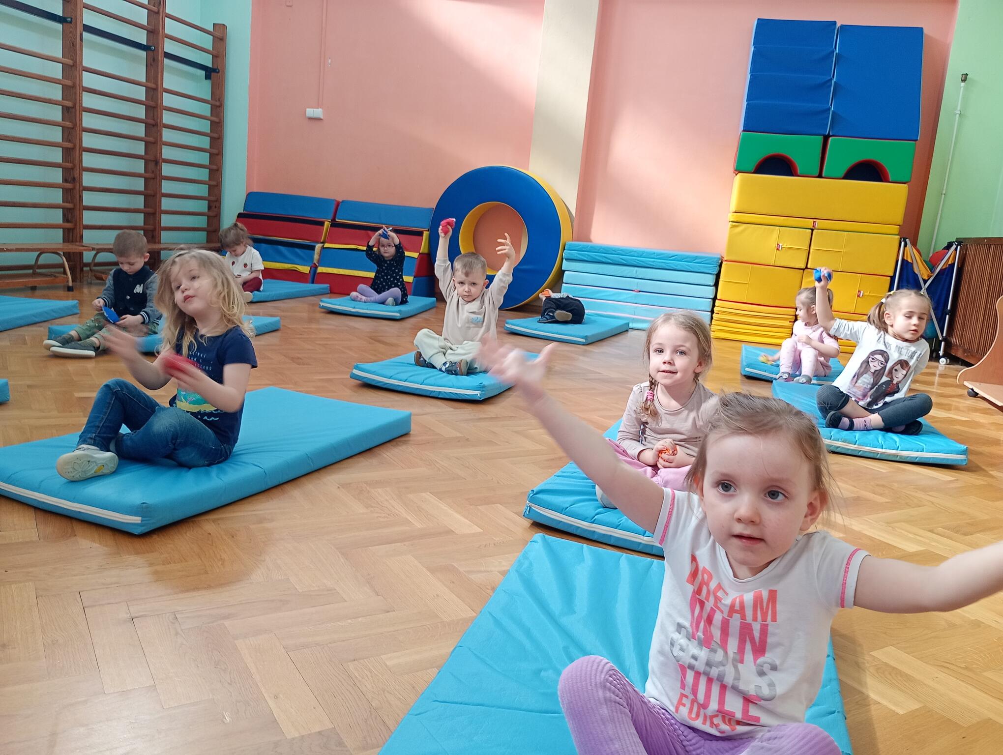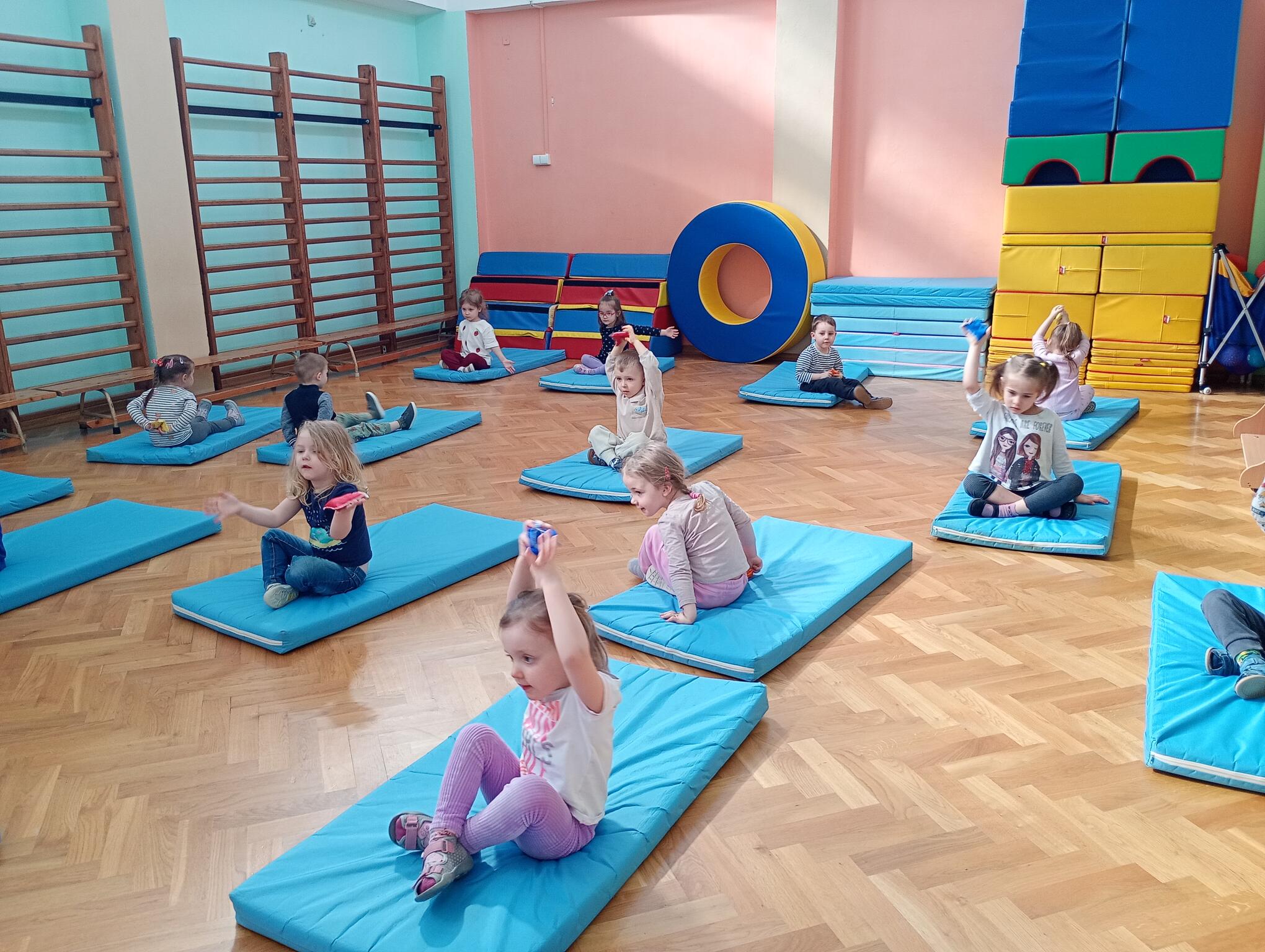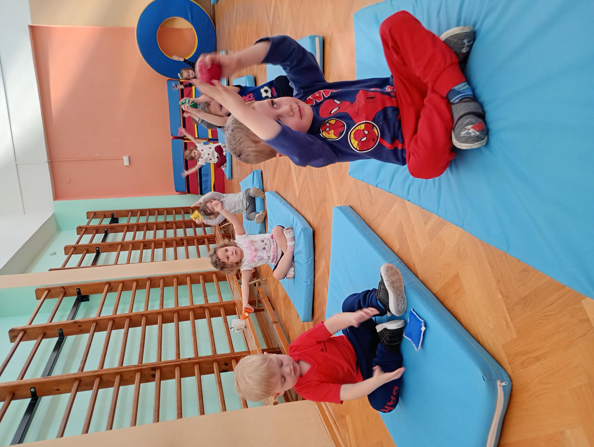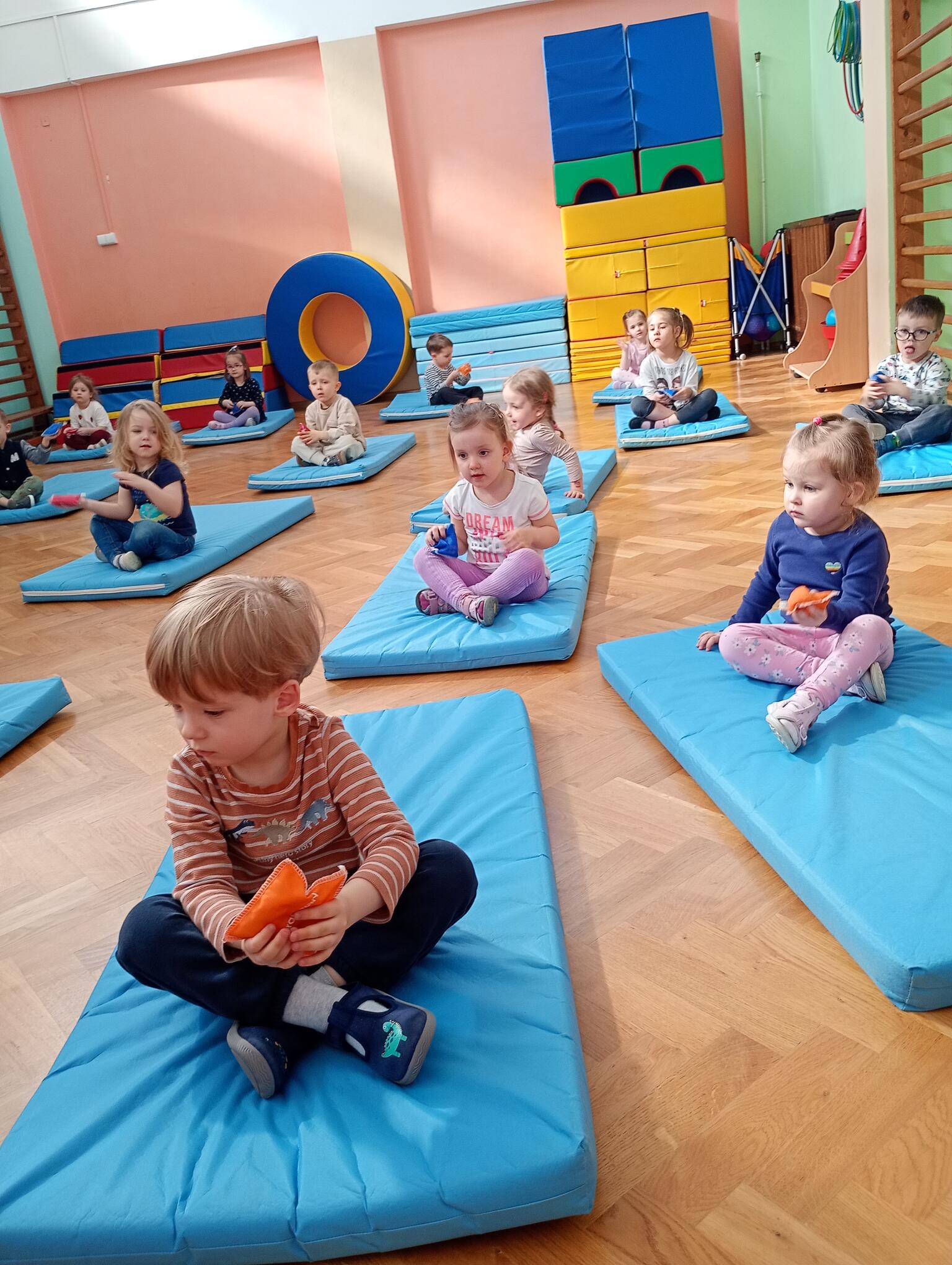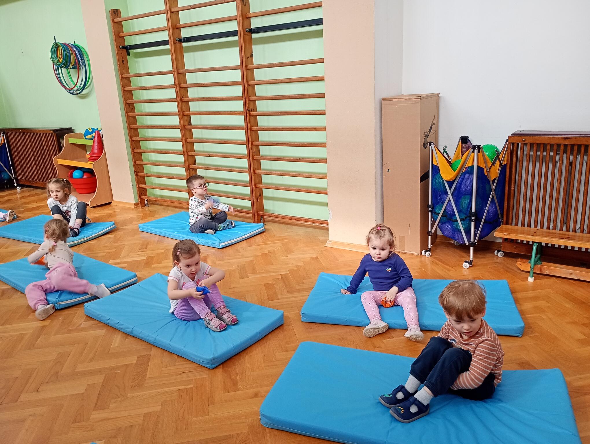 Dzisiaj maluszki uczestniczyły w zajęciach gimnastycznych. Każdy przedszkolak wykonywał różne ćwiczenia ciała na indywidualnym materacu. Dzieci ćwiczyły nogi, ramiona, dłonie, brzuszki, kręgosłup i odpowiednią postawę.