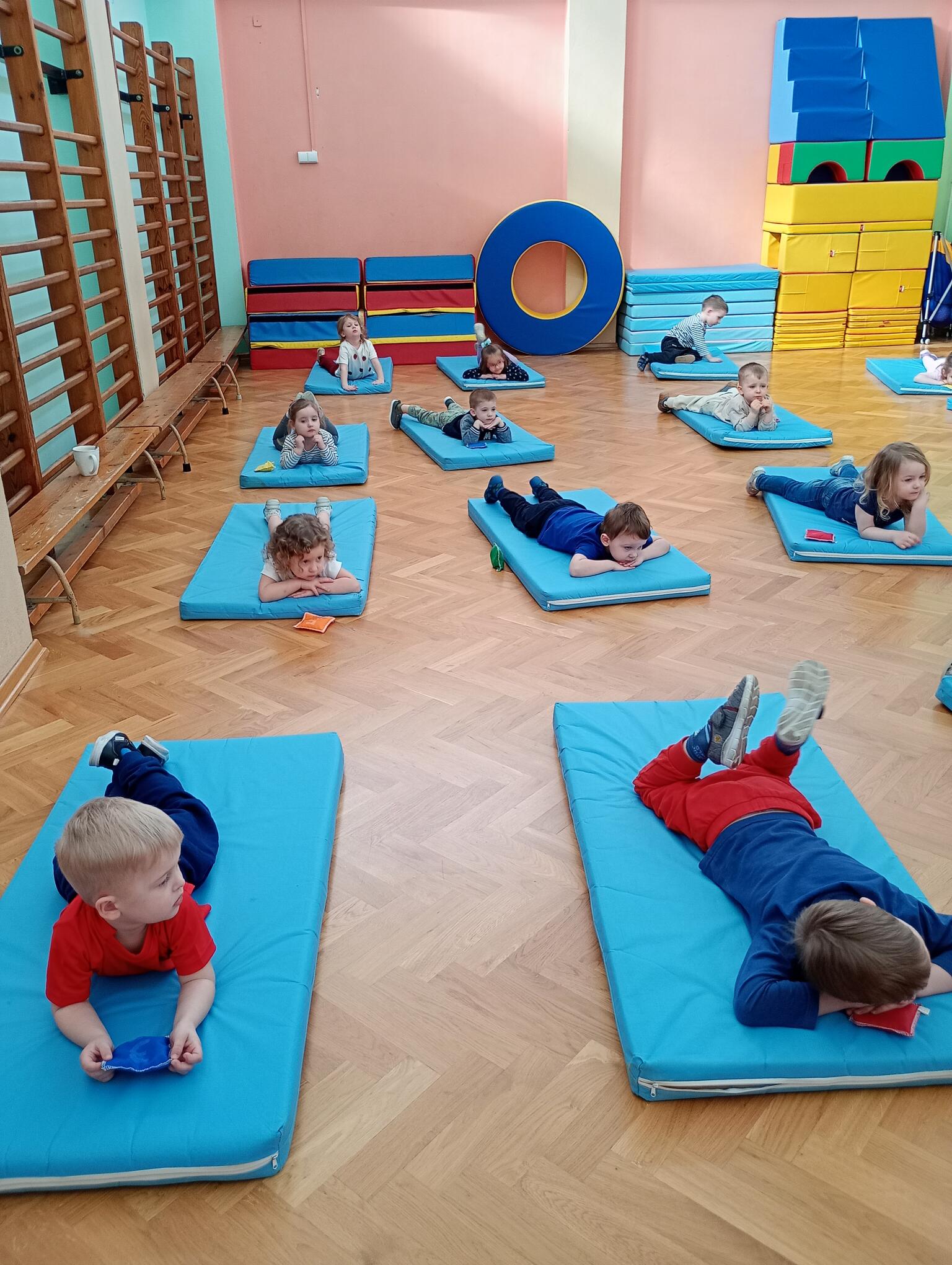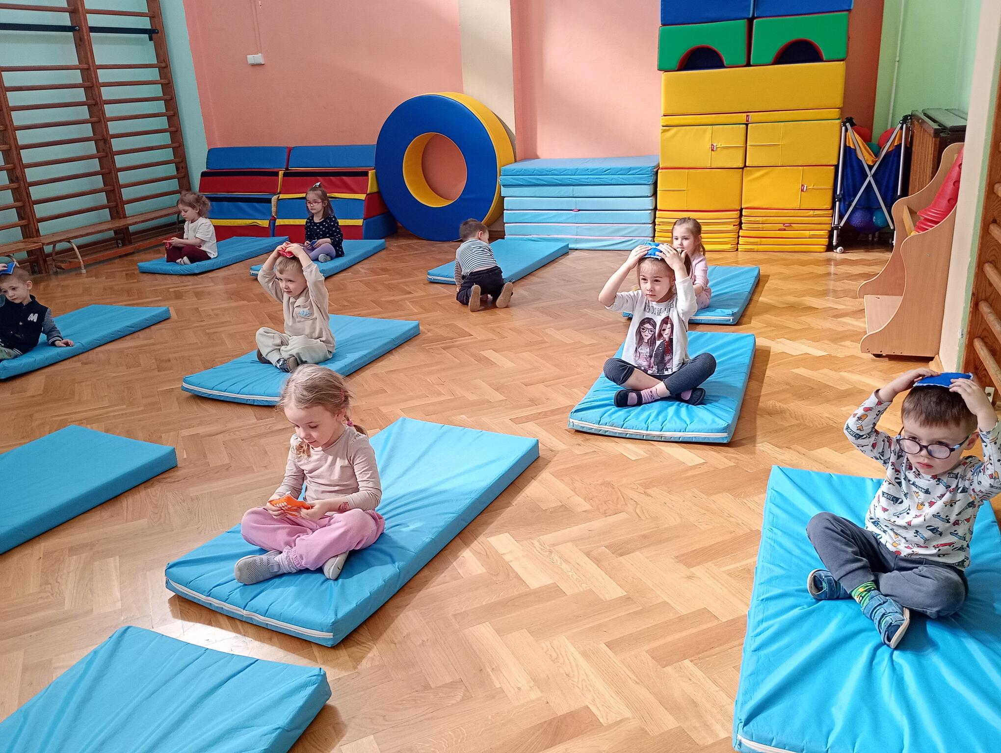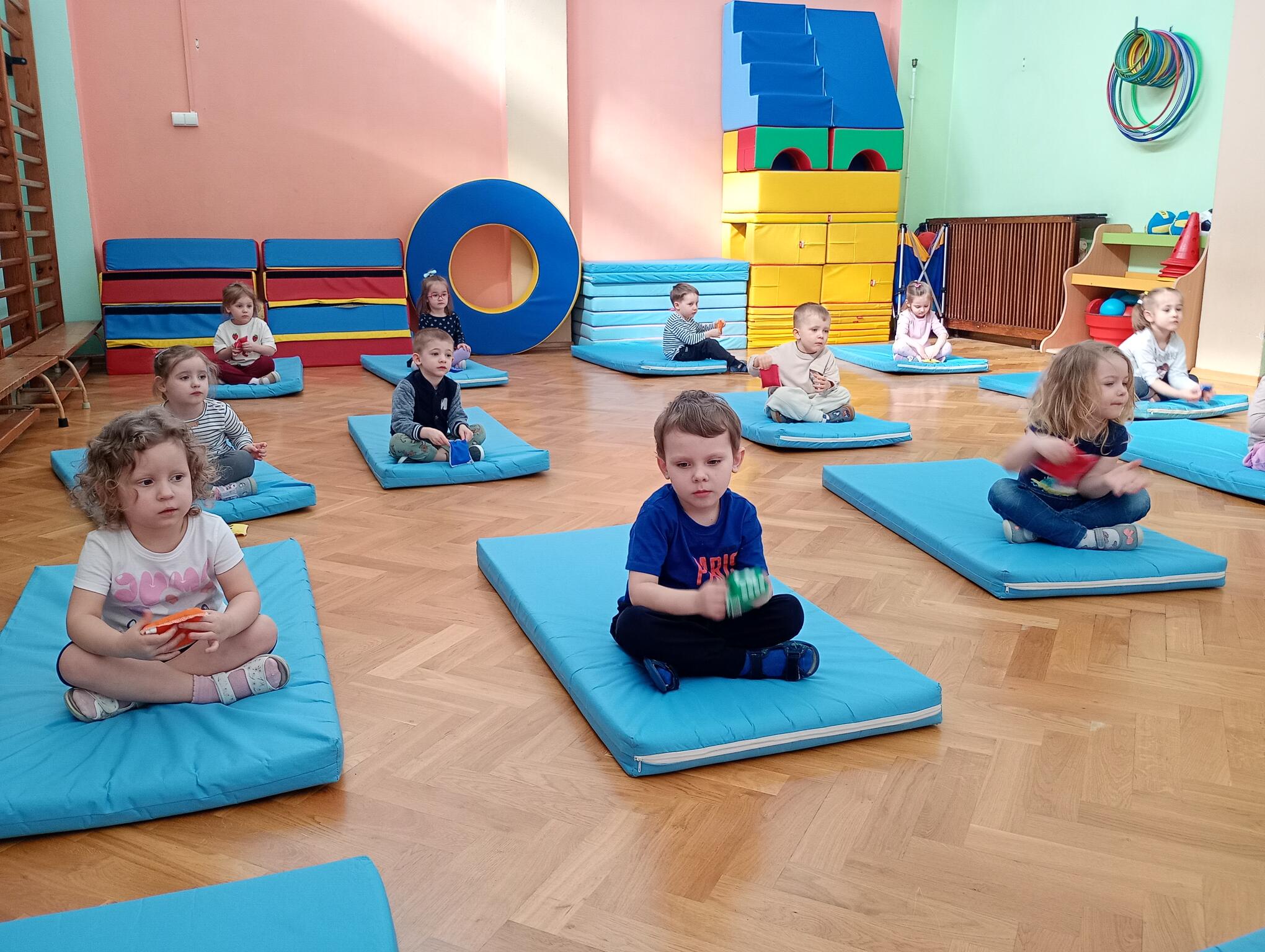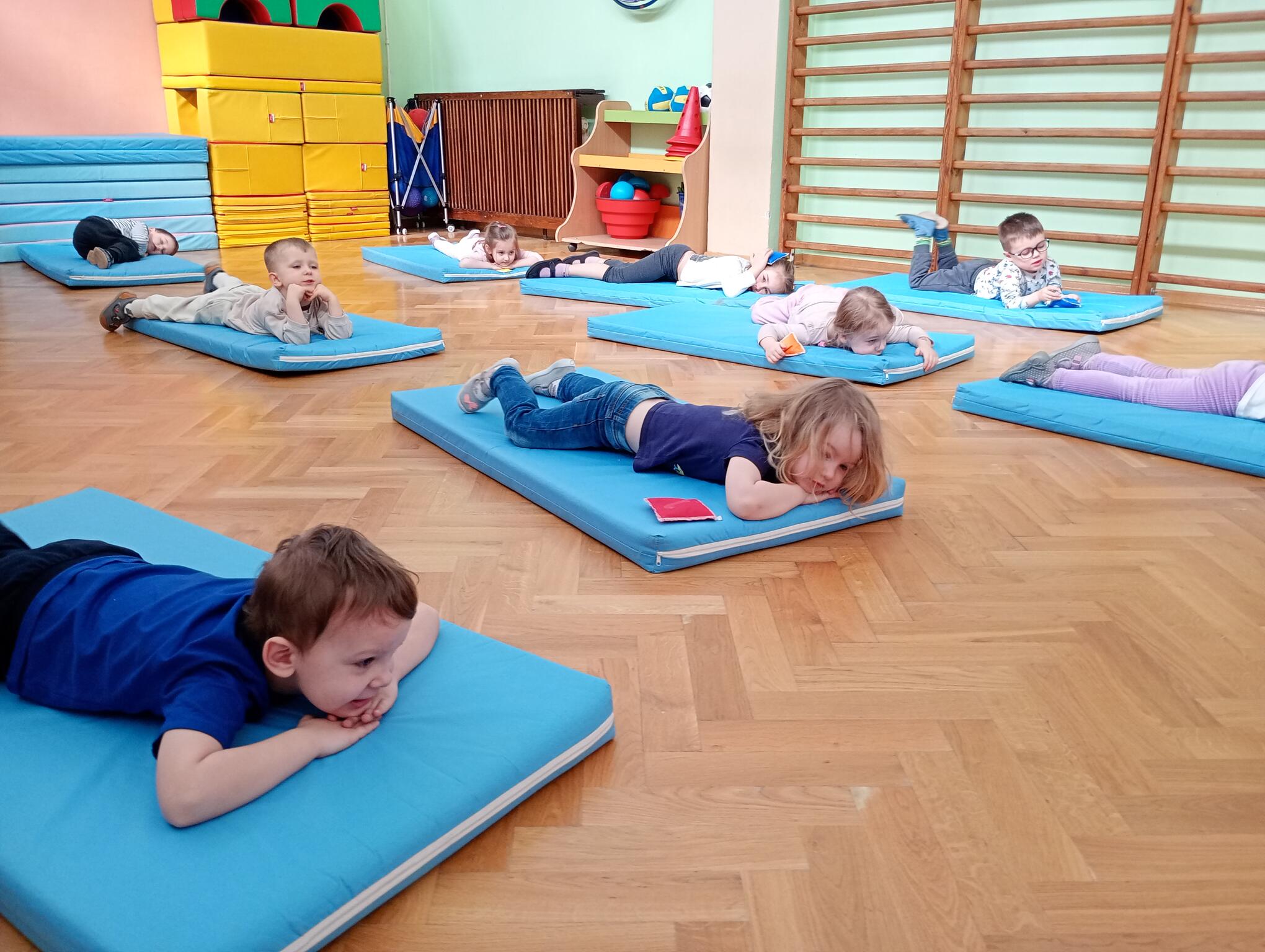Dzisiaj maluszki uczestniczyły w zajęciach gimnastycznych. Każdy przedszkolak wykonywał różne ćwiczenia ciała na indywidualnym materacu. Dzieci ćwiczyły nogi, ramiona, dłonie, brzuszki, kręgosłup i odpowiednią postawę.