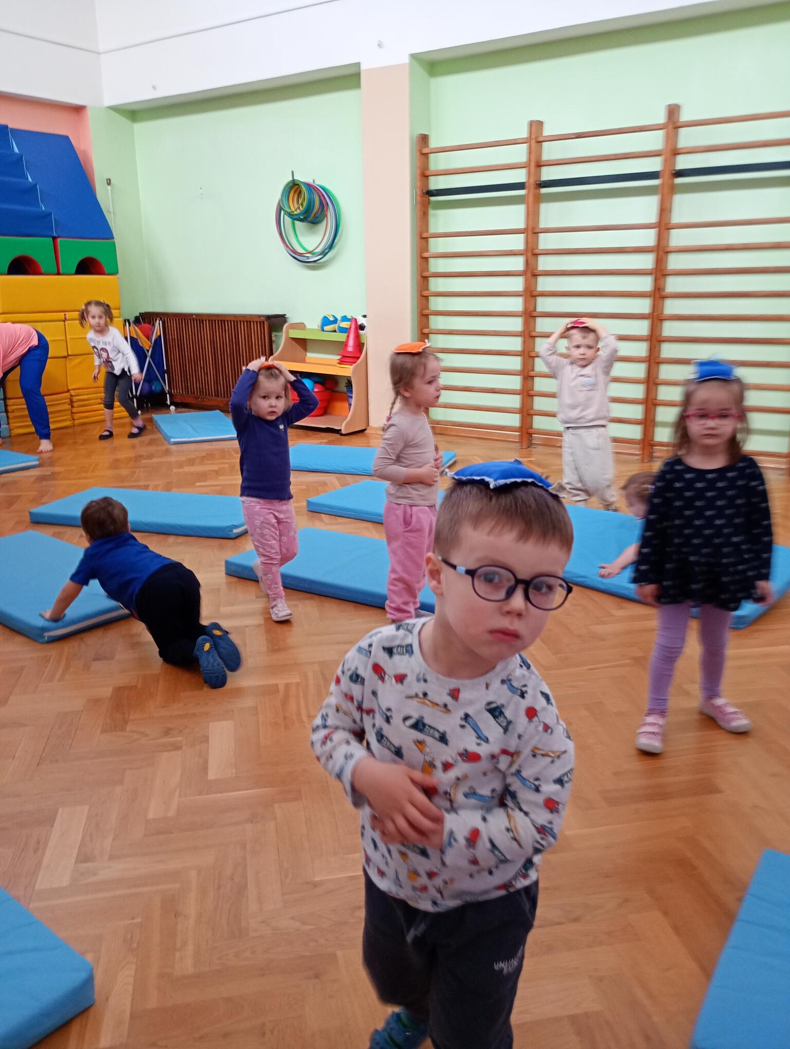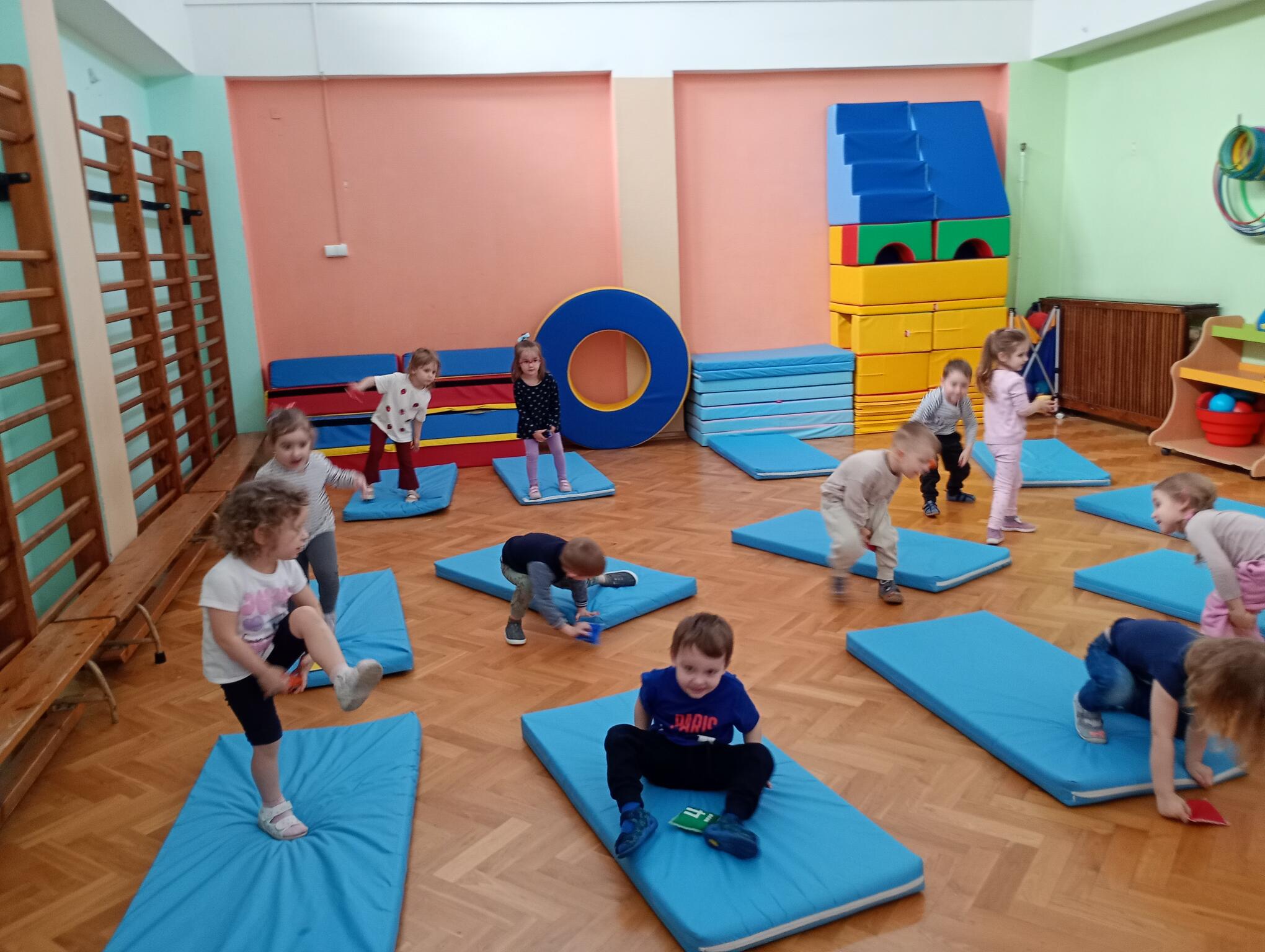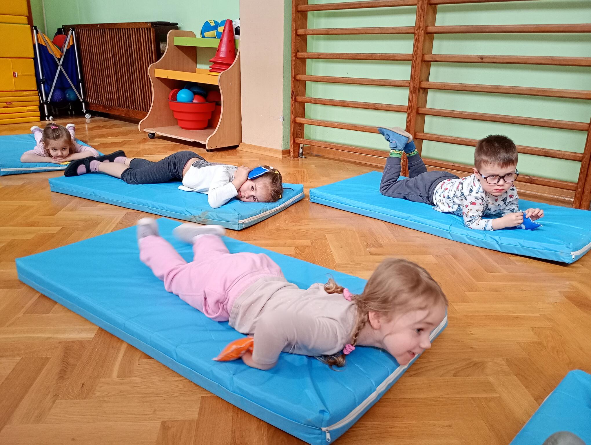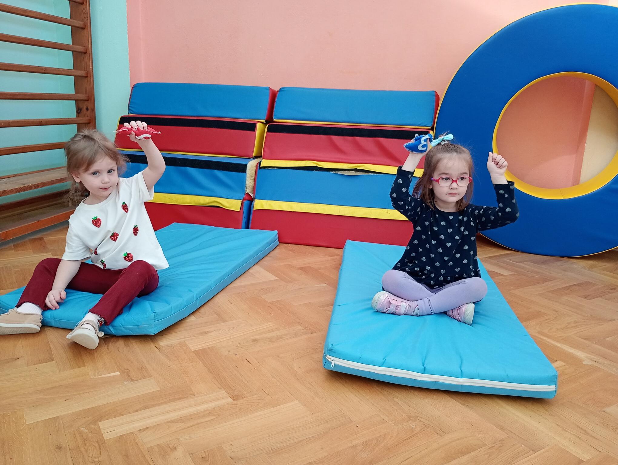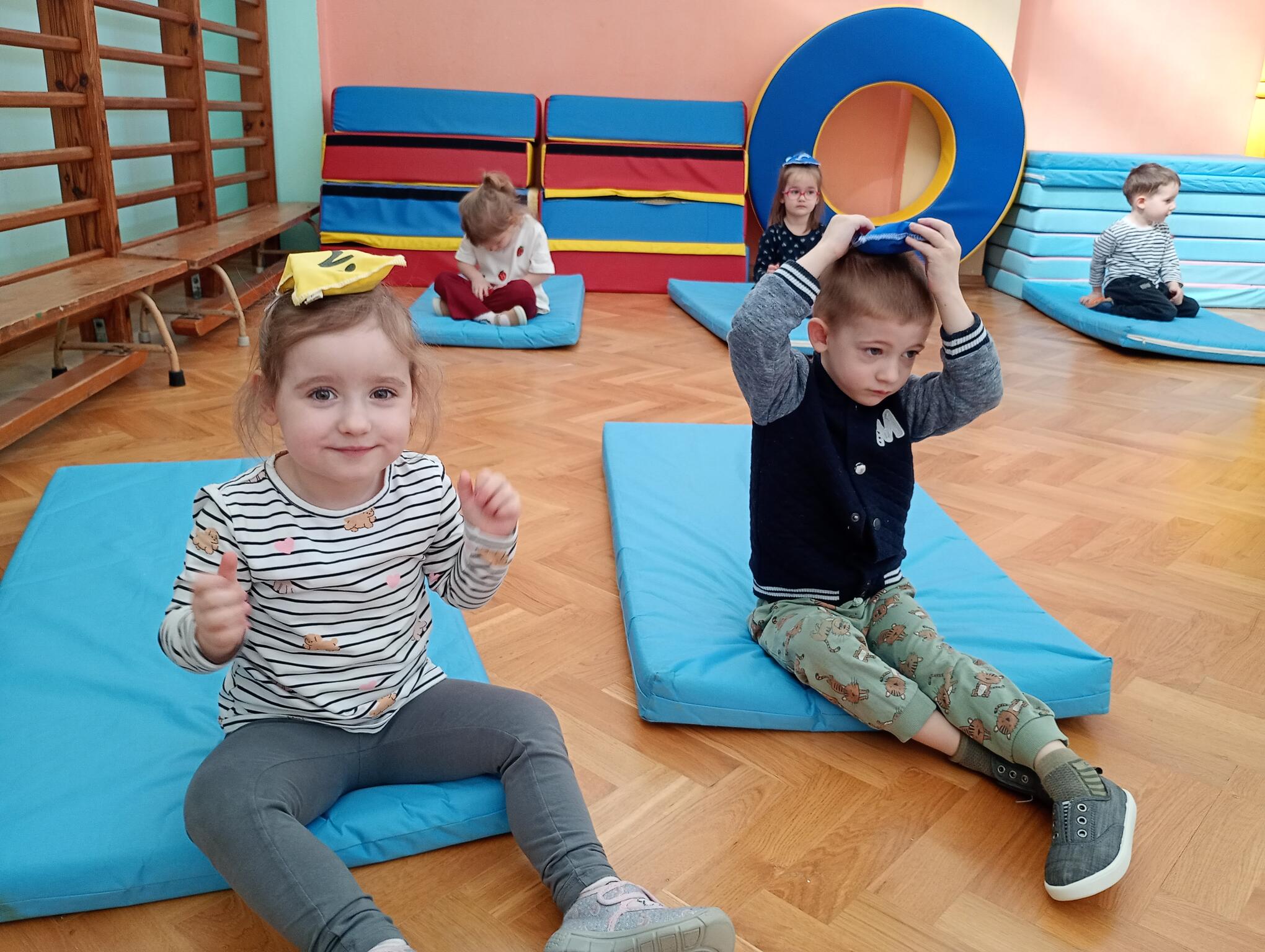 Dzisiaj maluszki uczestniczyły w zajęciach gimnastycznych. Każdy przedszkolak wykonywał różne ćwiczenia ciała na indywidualnym materacu. Dzieci ćwiczyły nogi, ramiona, dłonie, brzuszki, kręgosłup i odpowiednią postawę.