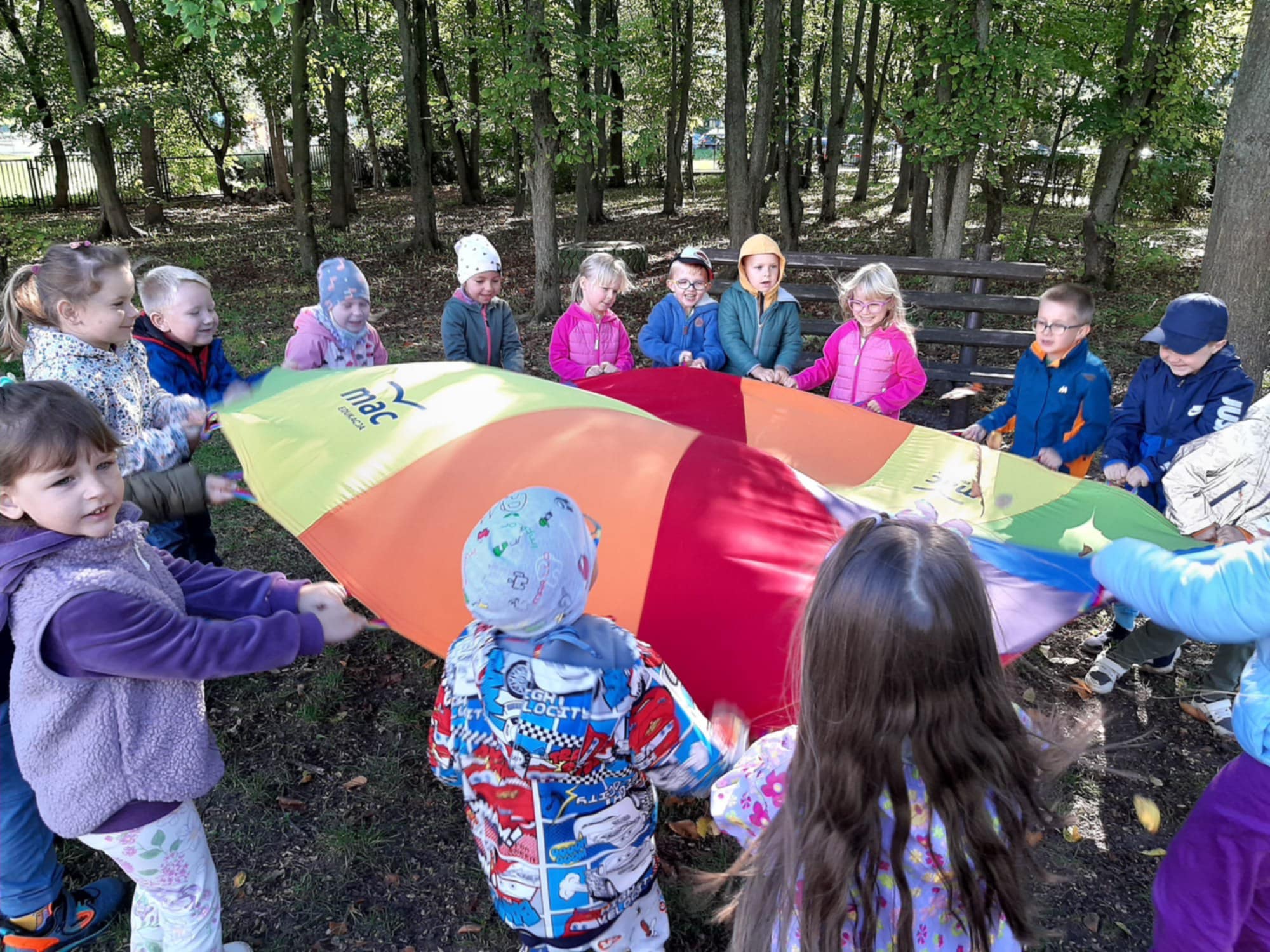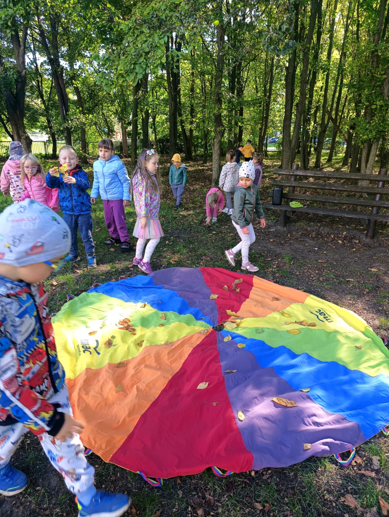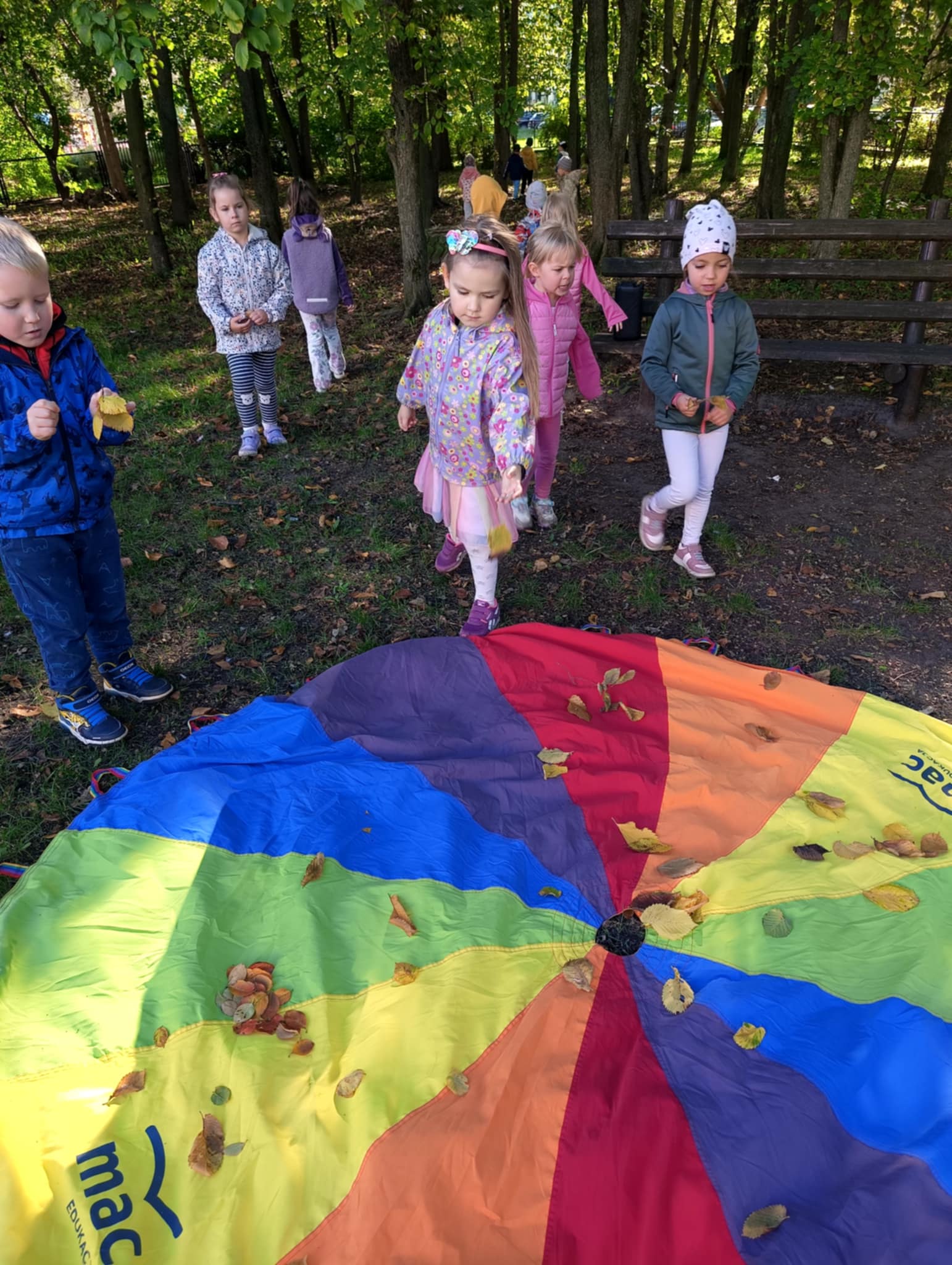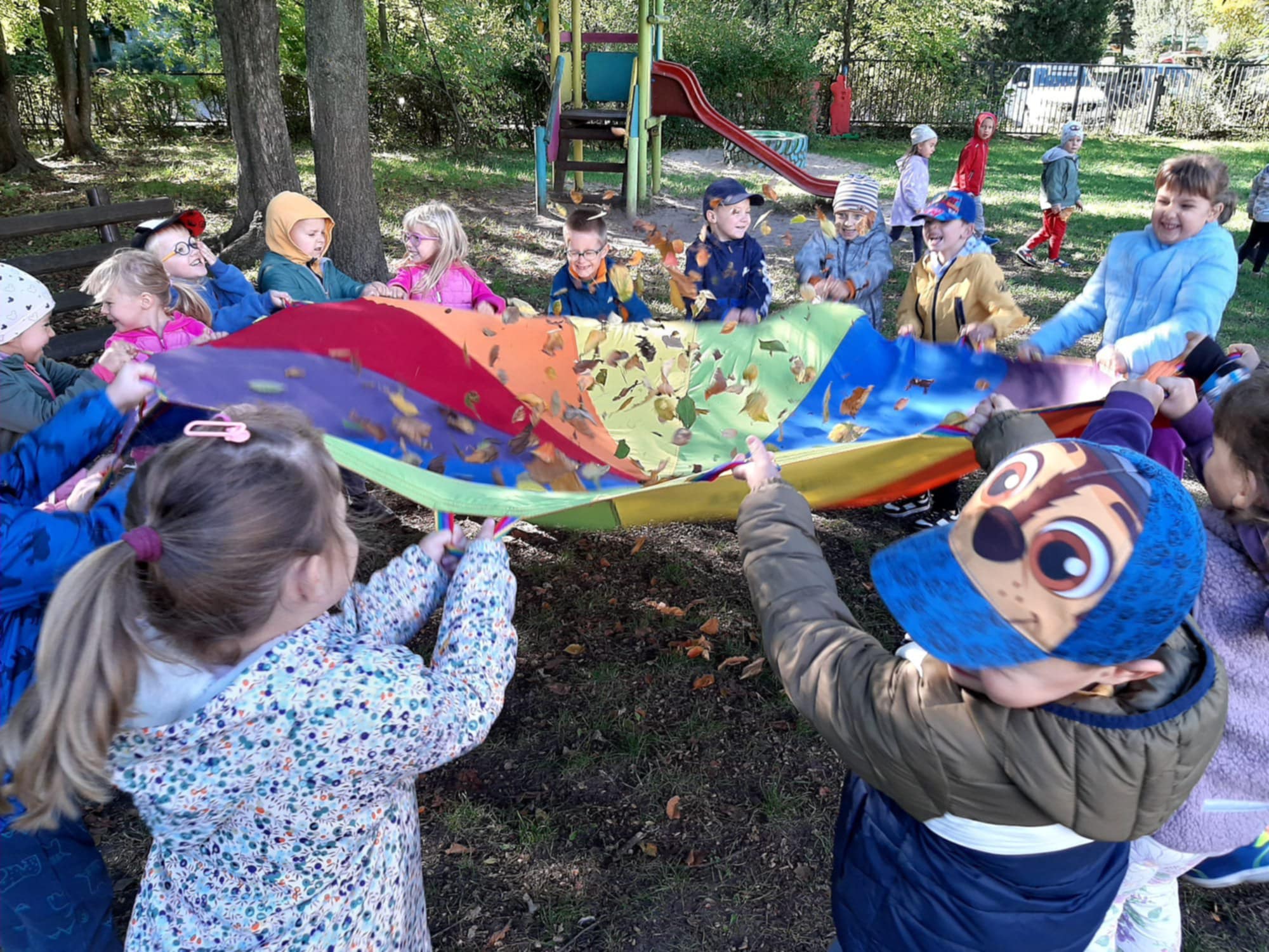 Dzieci z radością korzystają z uroków pięknej, kolorowej jesieni. Podczas dzisiejszych zajęć Motylki zbierały barwne liście, a następnie układały je na chustę animacyjną. Nie zabrakło również ruchu i muzyki – w rytm wesołych piosenek dzieci podrzucały liście wysoko do góry, tworząc prawdziwy jesienny taniec kolorów.