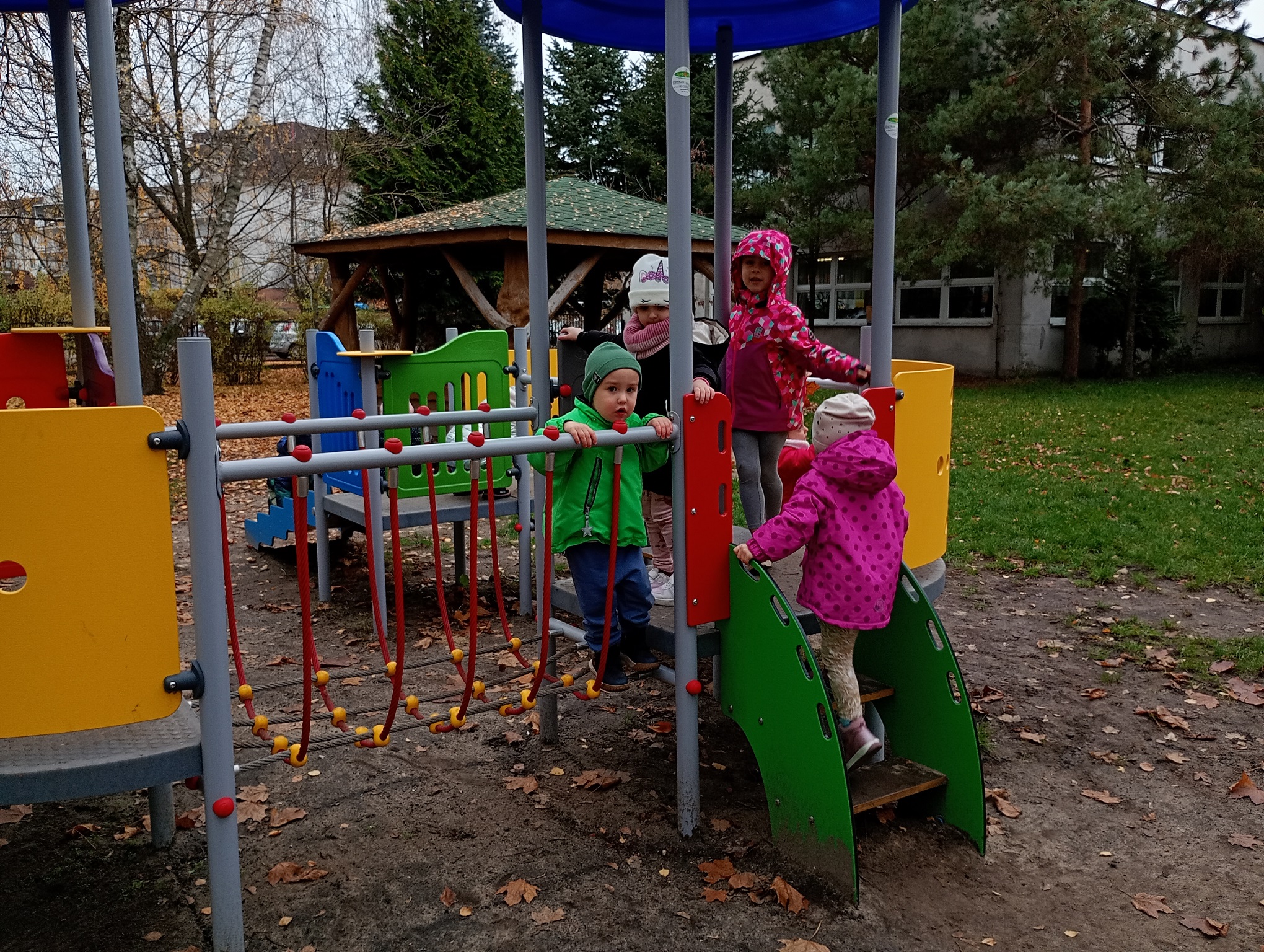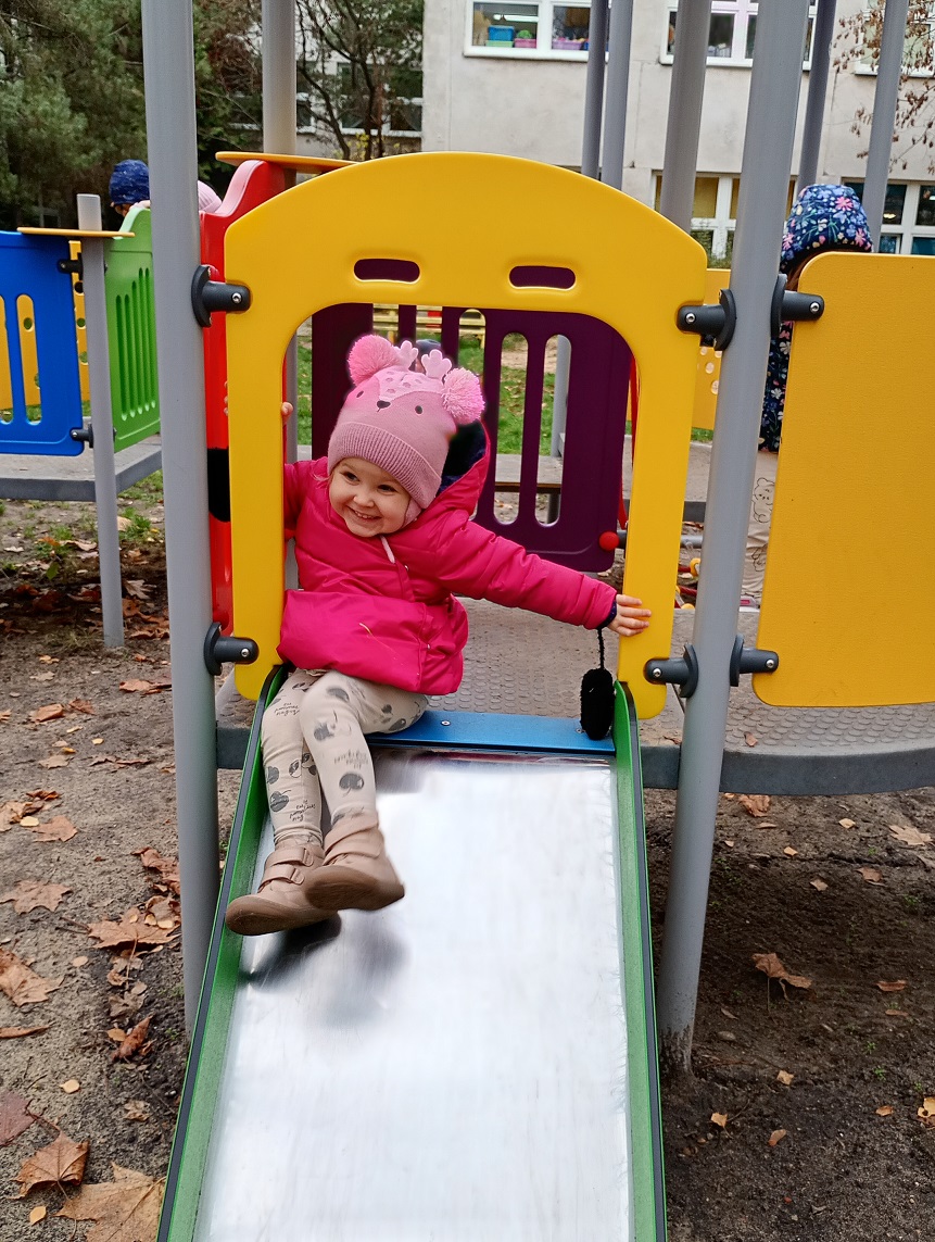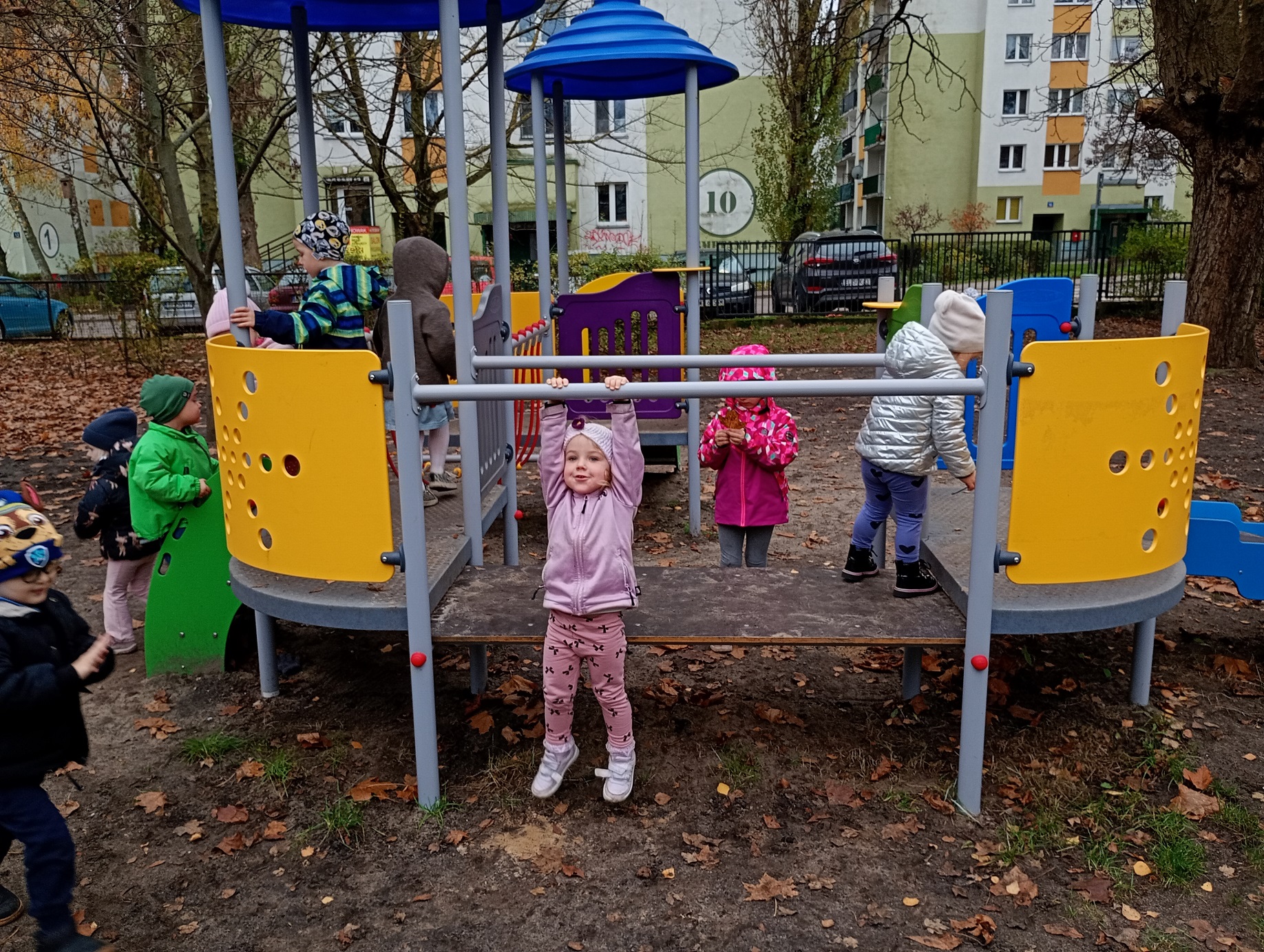 Wykorzystując ciepło, jesienną pogodę, dzieci wspaniale bawiły się w naszym przedszkolnym ogrodzie. Przedszkolaki z radością korzystały ze sprzętów ogrodowych, jeździły na „ciuchci”, wspinały się i huśtały, a także bawiły się w berka, pełne energii i śmiechu.