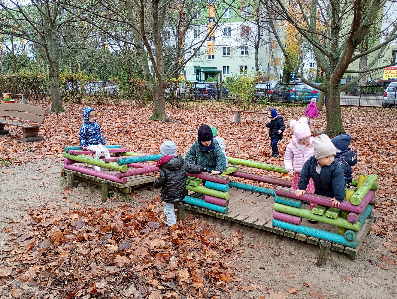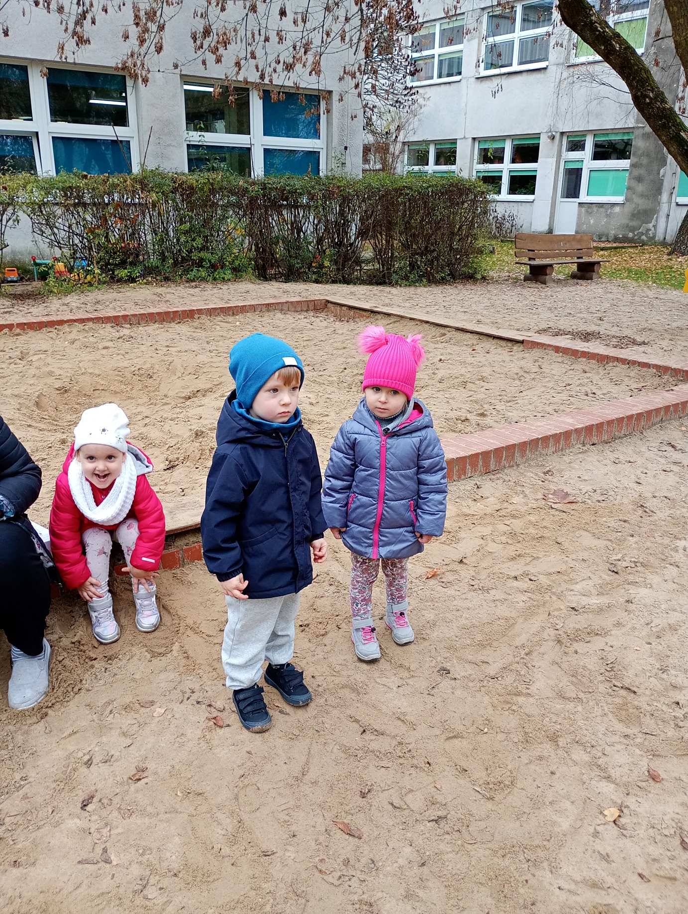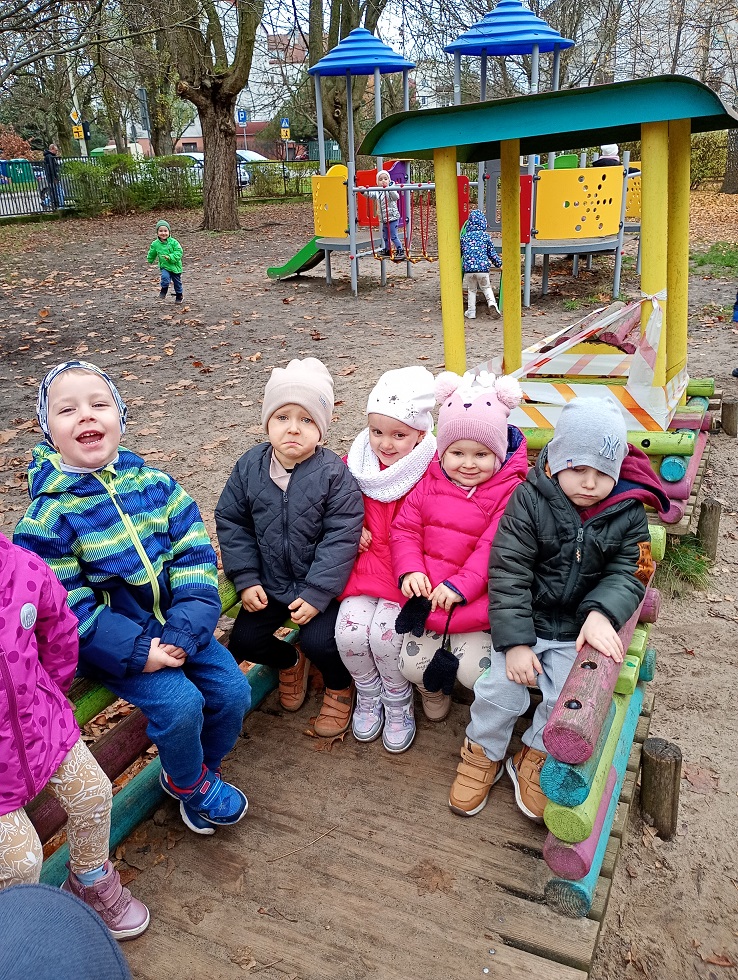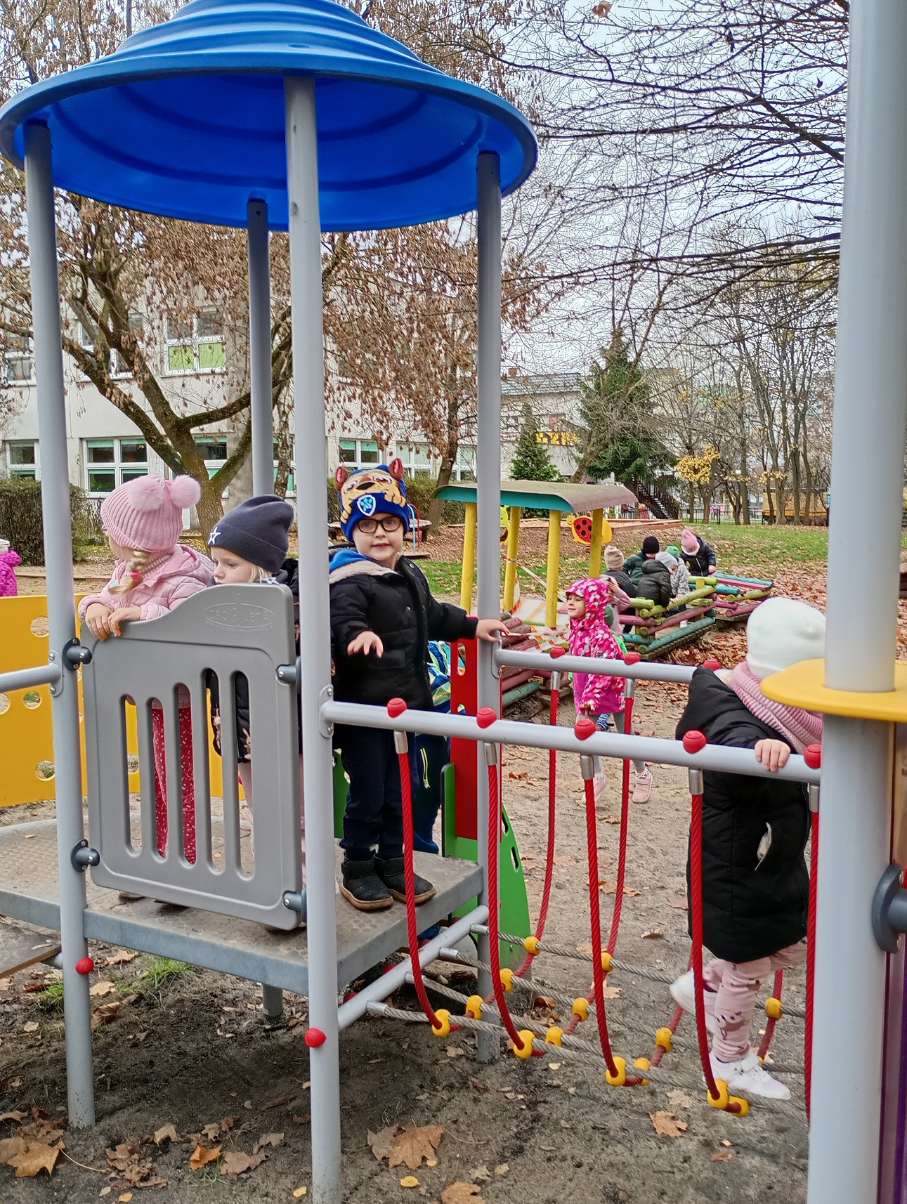 Wykorzystując ciepło, jesienną pogodę, dzieci wspaniale bawiły się w naszym przedszkolnym ogrodzie. Przedszkolaki z radością korzystały ze sprzętów ogrodowych, jeździły na „ciuchci”, wspinały się i huśtały, a także bawiły się w berka, pełne energii i śmiechu.