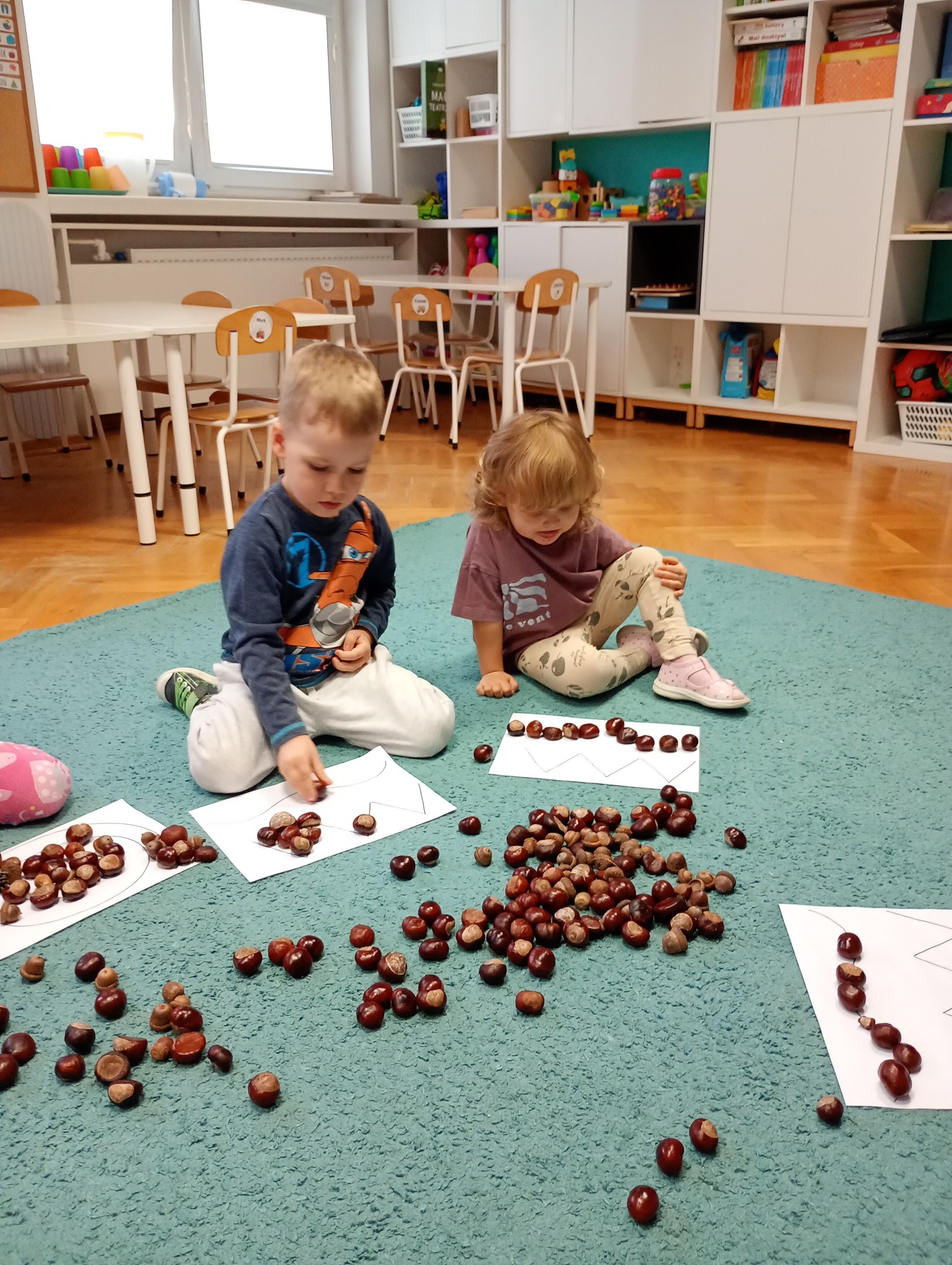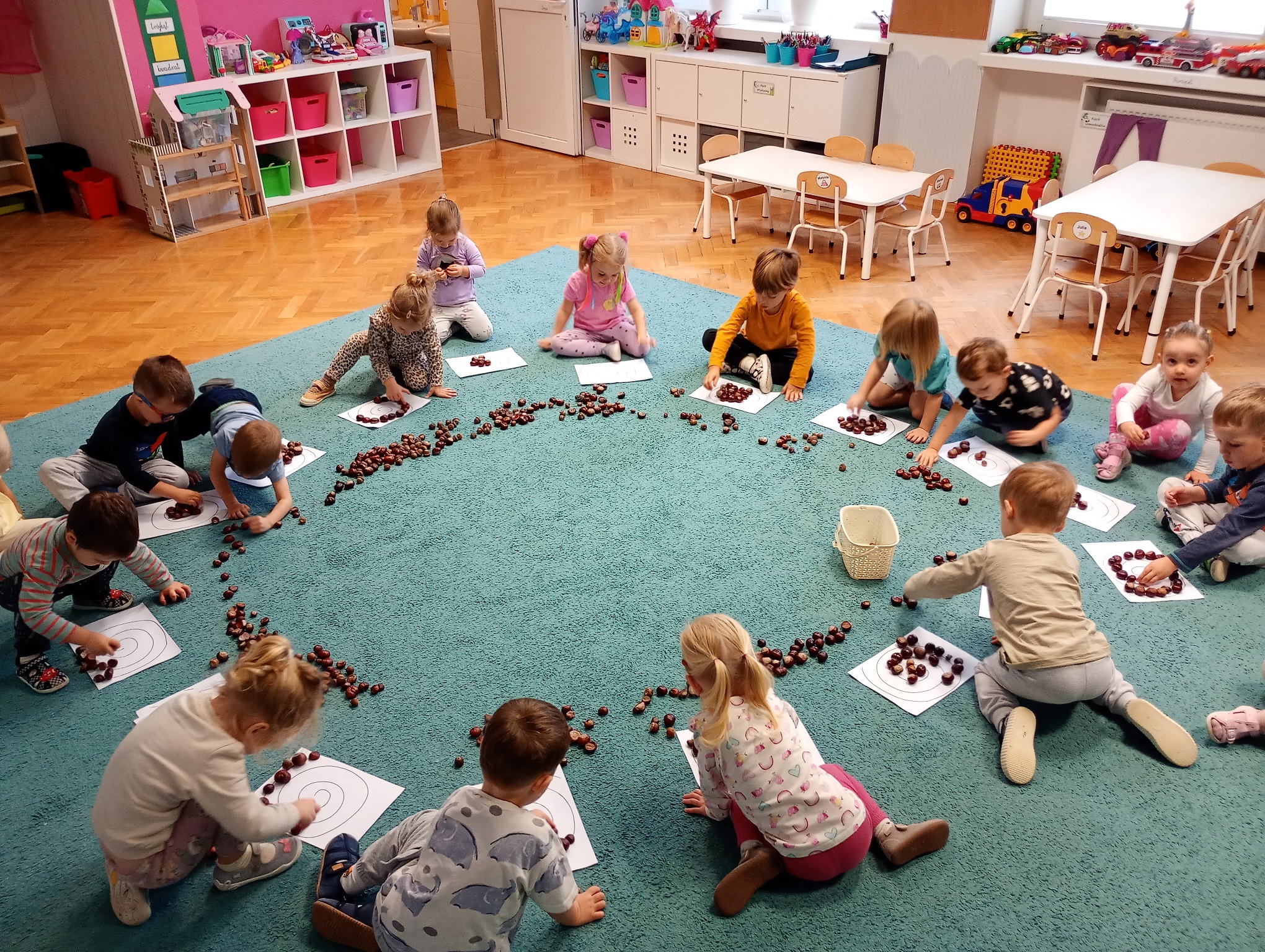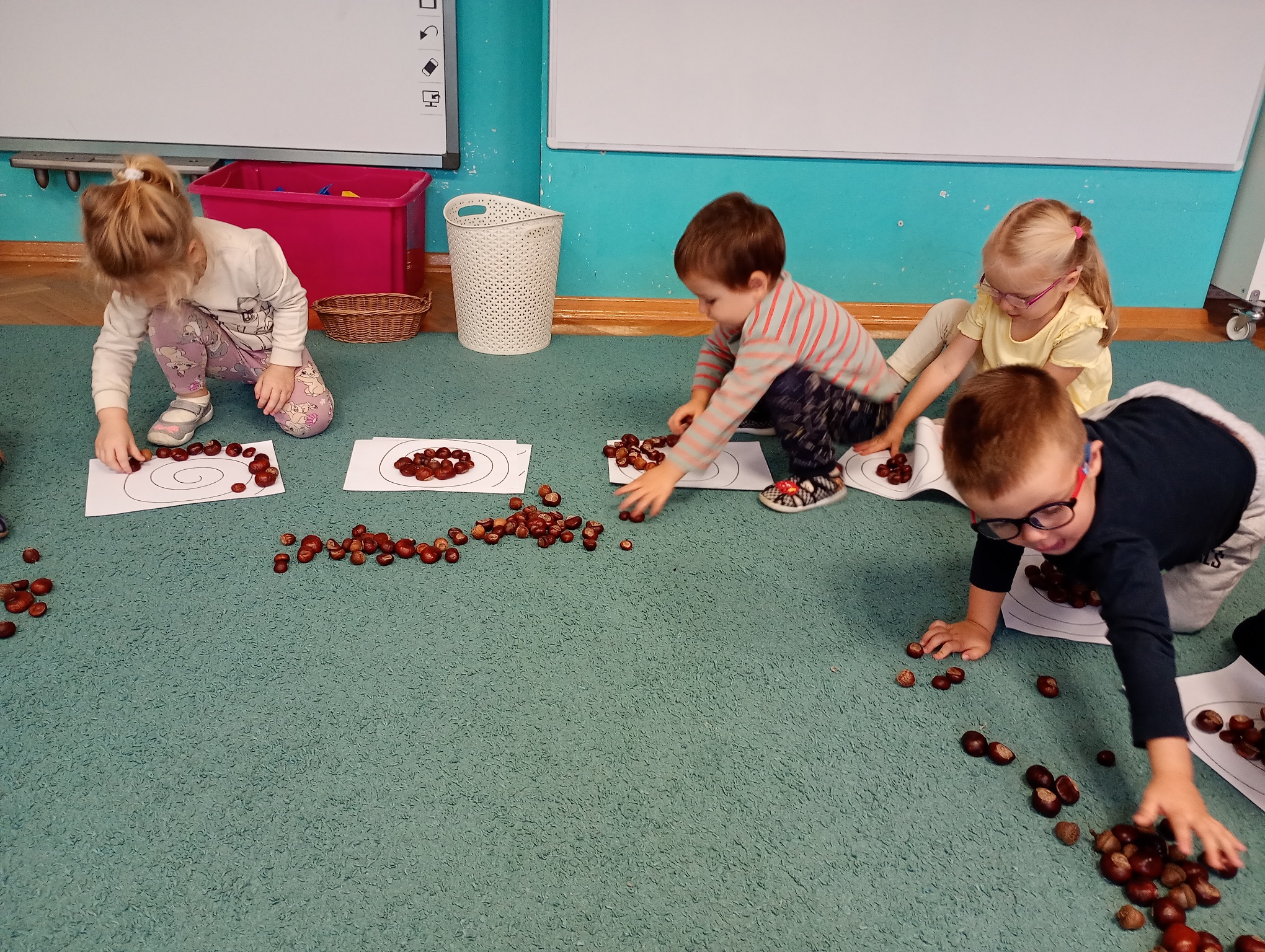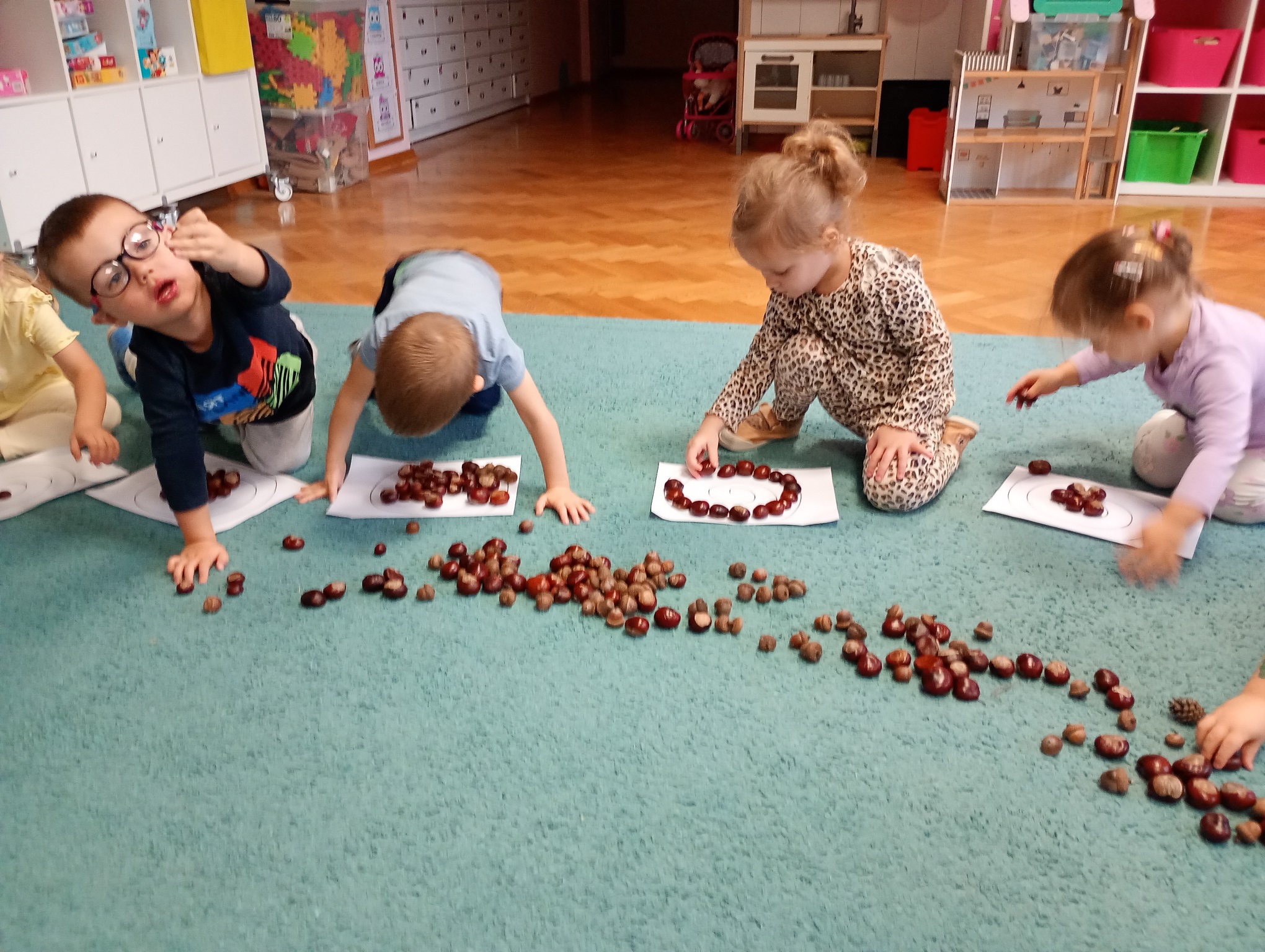Dziś, podczas zajęć dzieci wykorzystały kasztany, które samodzielnie zebrały i przyniosły do przedszkola. Układaliśmy z nich różne wzory i kształty, a także przeliczaliśmy kasztany, ćwicząc umiejętności matematyczne.