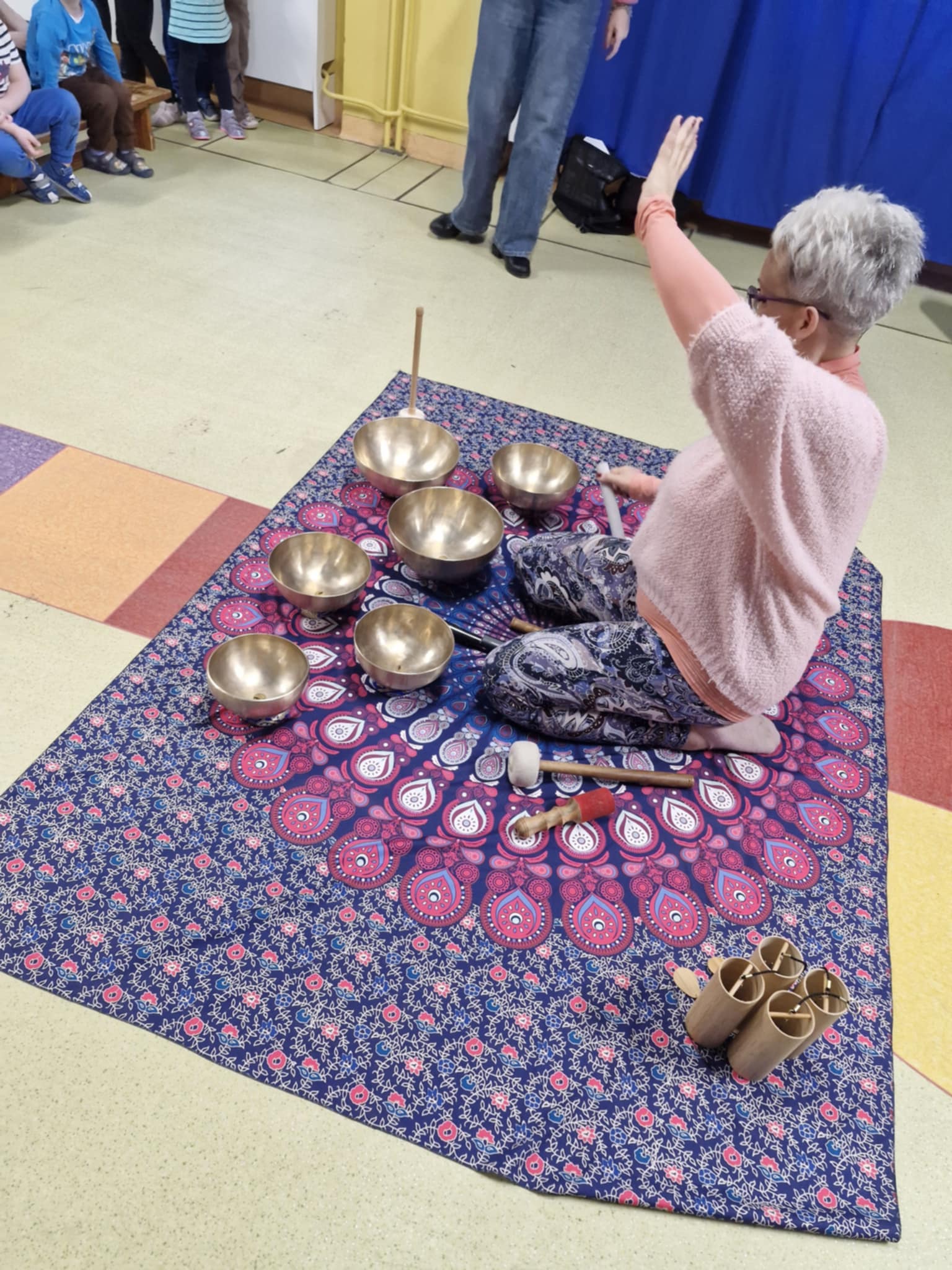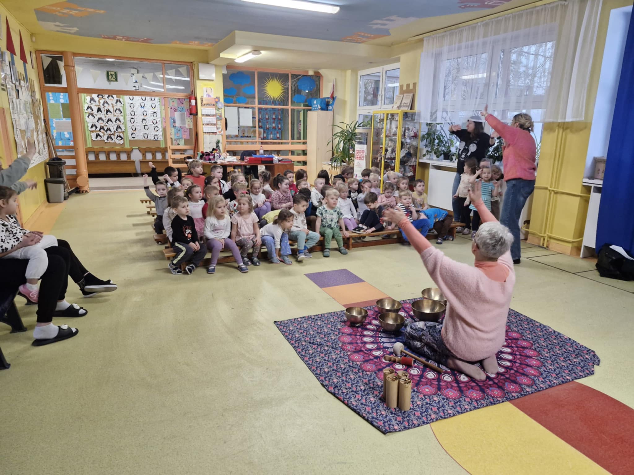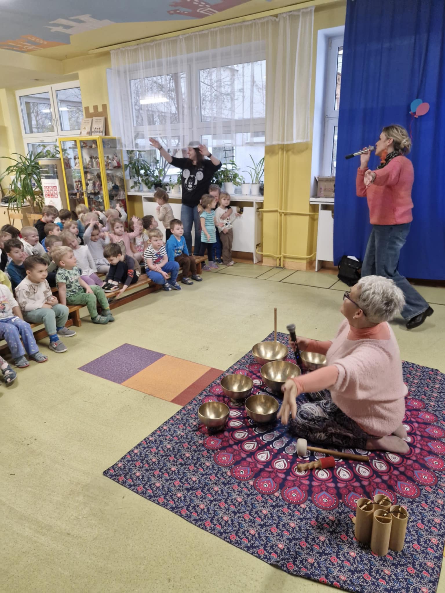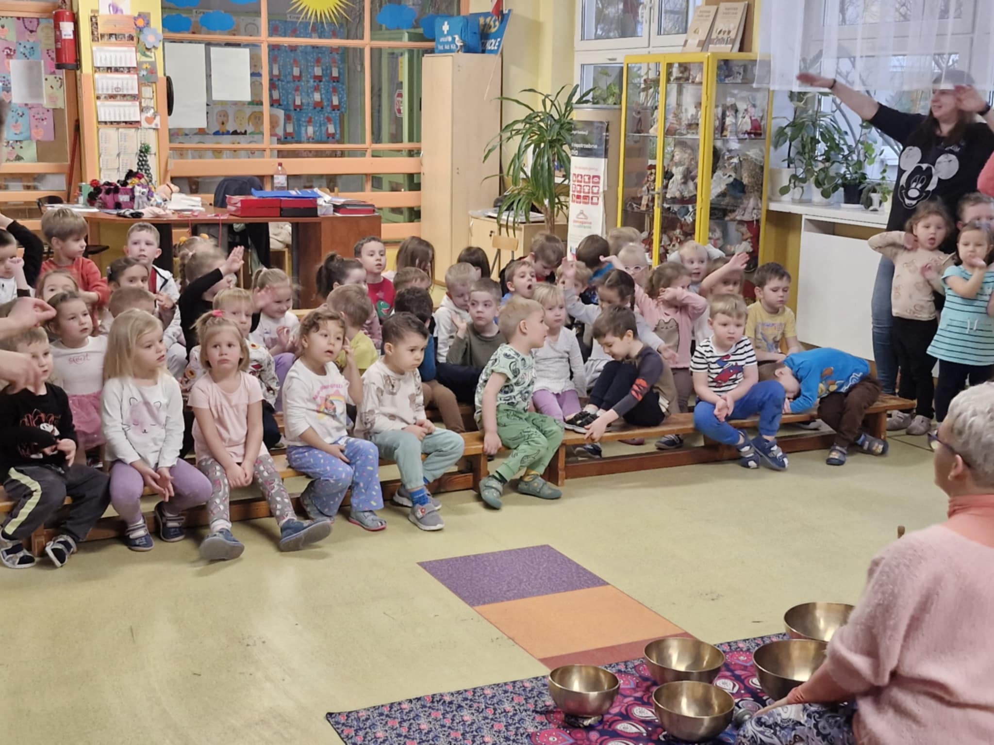 Dziś odwiedziły nas Lawendowe Audycje. Panie zaprezentowały dzieciom śpiew oraz pokazały, jak gra się na misach i innych niezwykłych instrumentach oraz jakie dźwięki one wydają. Dzieci z dużą ciekawością słuchały prezentacji, obserwowały sposób gry oraz mogły doświadczyć wyjątkowych, relaksujących brzmień. Było to bardzo ciekawe i wartościowe spotkanie muzyczne.
