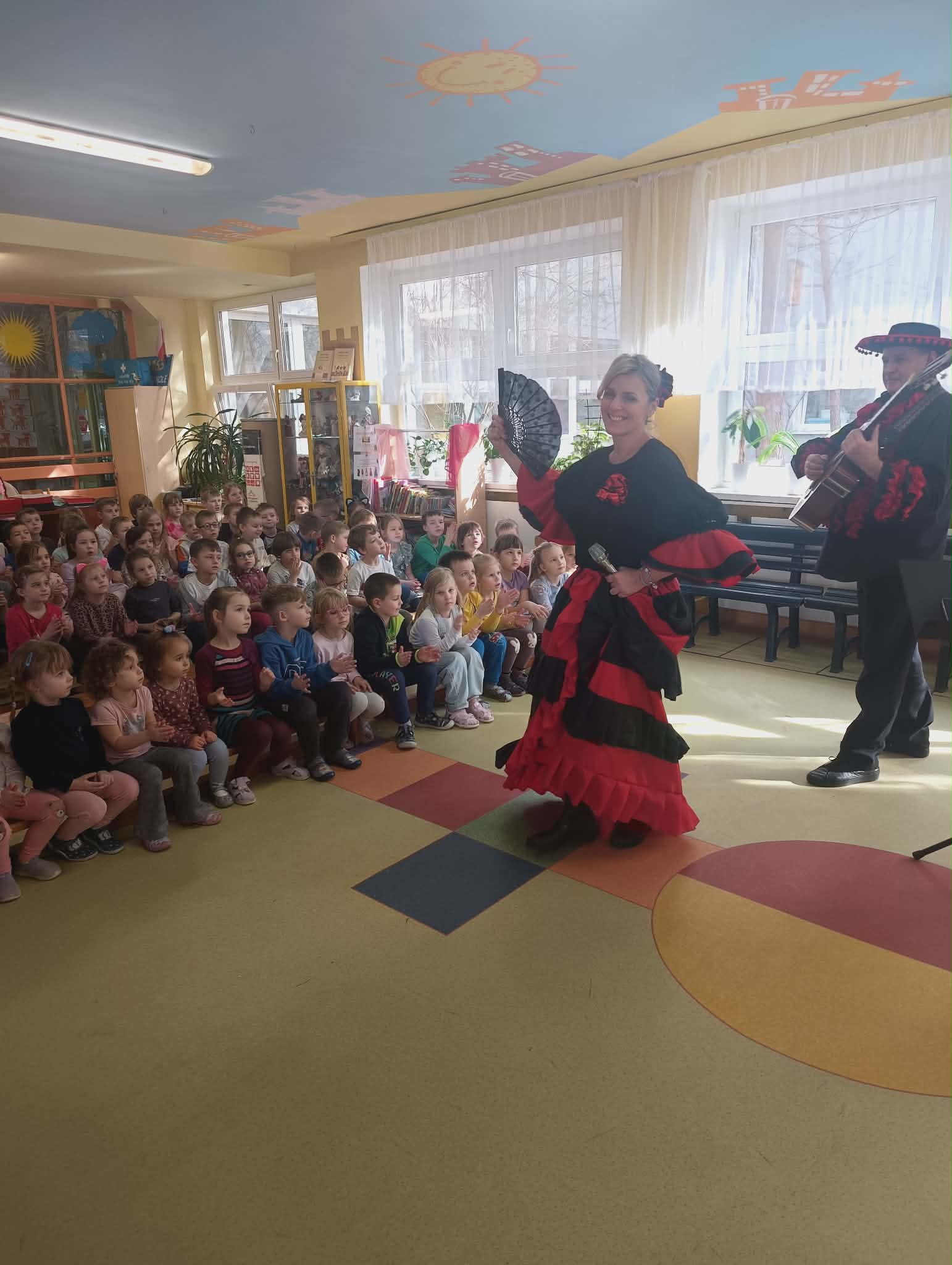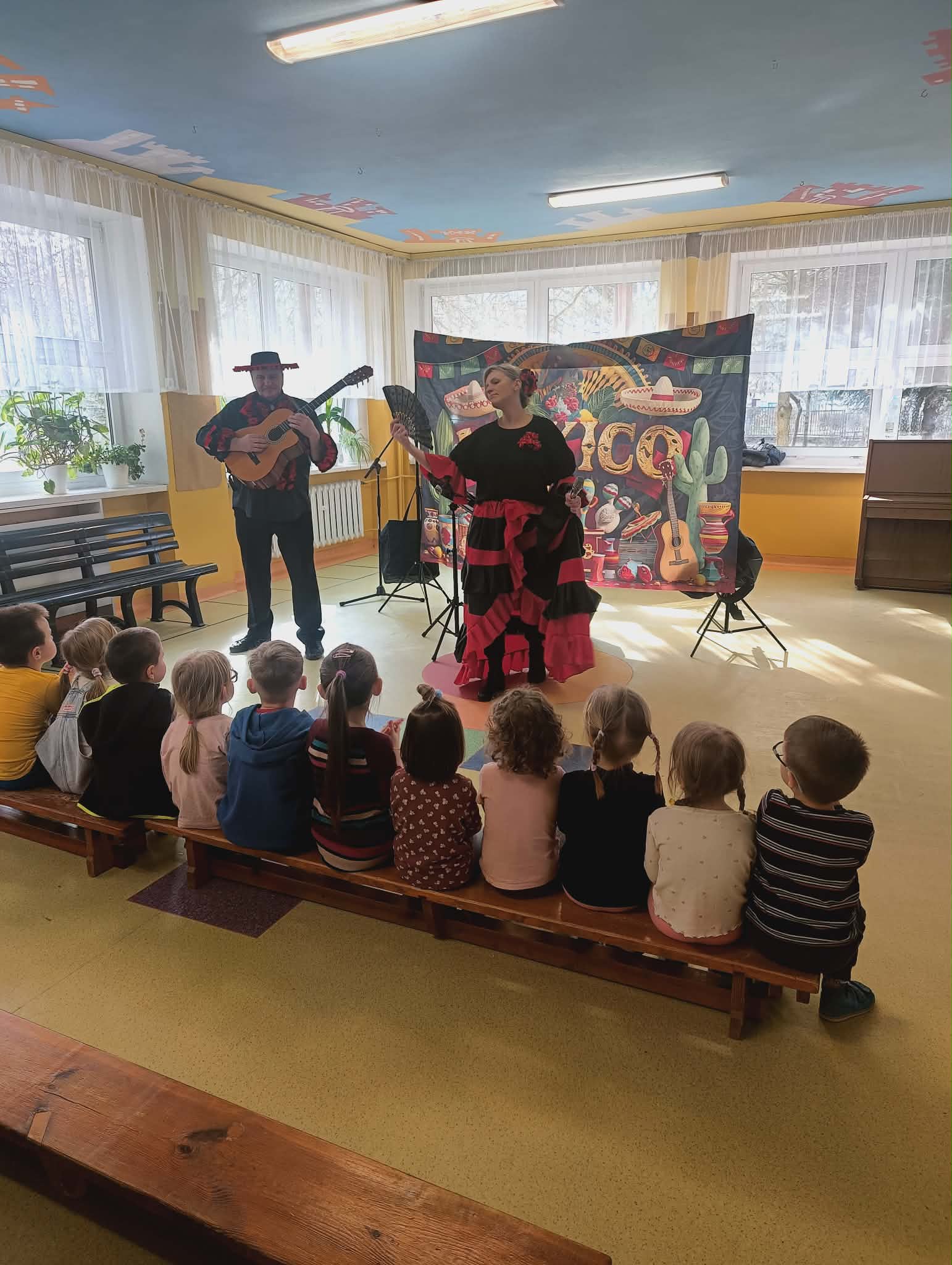 W naszym przedszkolu odbył się wyjątkowy koncert pod tytułem „Mexico”, który przeniósł dzieci w rytmy i barwy tego wspaniałego kraju. Przedszkolaki miały okazję poznać meksykańską muzykę, instrumenty oraz charakterystyczne melodie i rytmy. Dzieci aktywnie uczestniczyły w koncercie – śpiewały, tańczyły i poznawały podstawowe elementy muzyki meksykańskiej. Spotkanie było pełne radości, zabawy i pozytywnej energii. Mali uczestnicy mogli poczuć klimat Meksyku dzięki kolorowej scenografii, rytmicznym dźwiękom i wspólnym tańcom