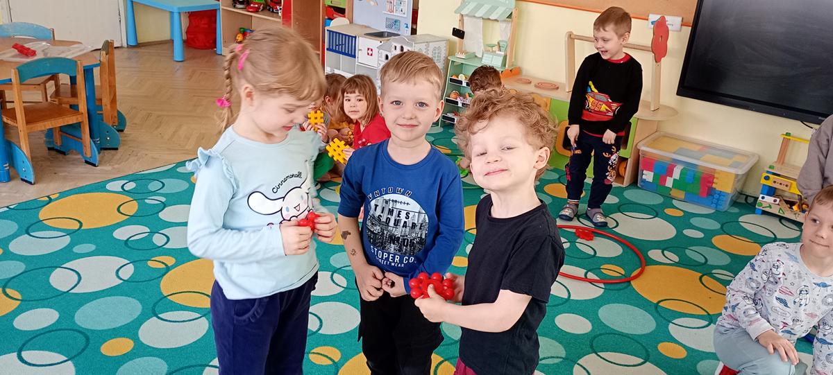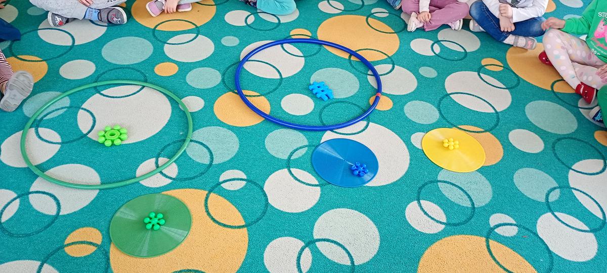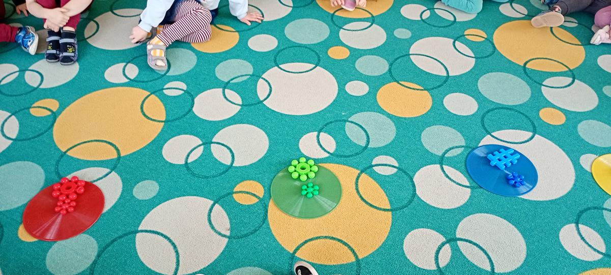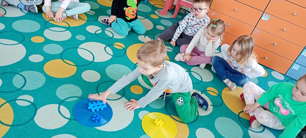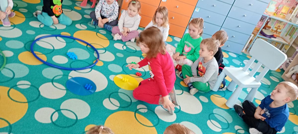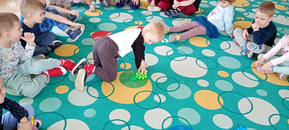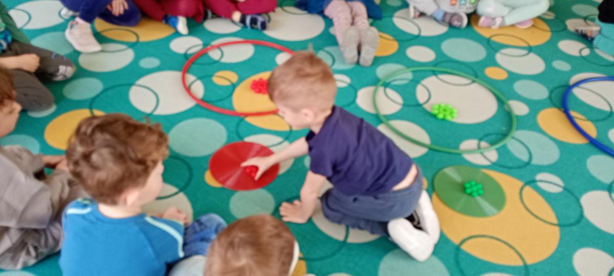 Dzieci utrwalały nazwy kolorów podstawowych. Klasyfikowały klocki ze względu na ten sam kolor, przeliczały je oraz łączyły się w pary.