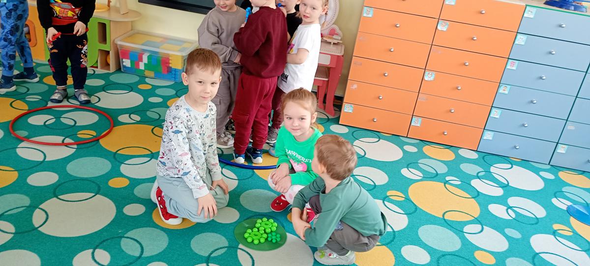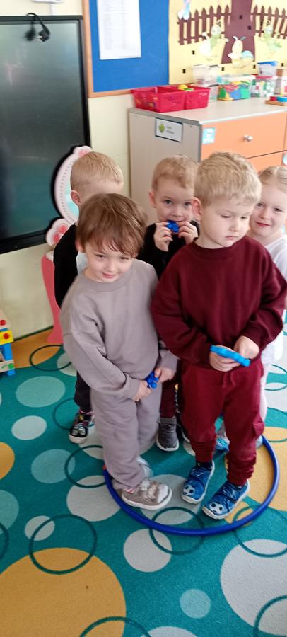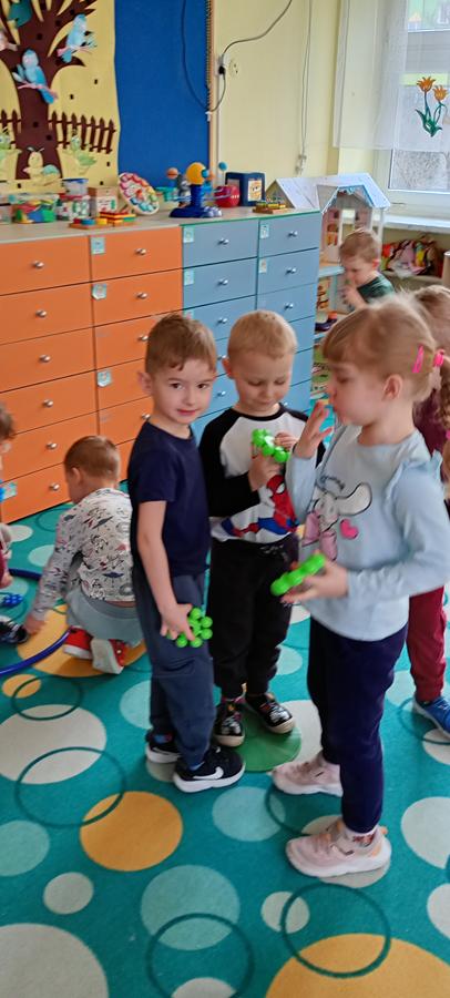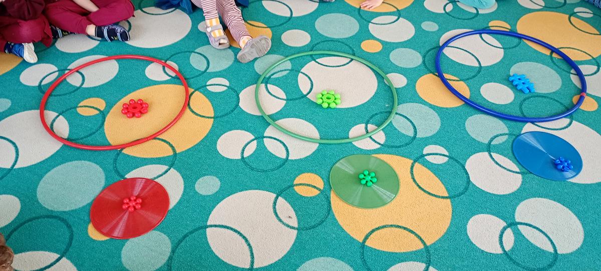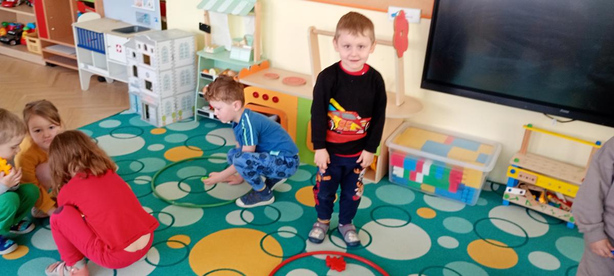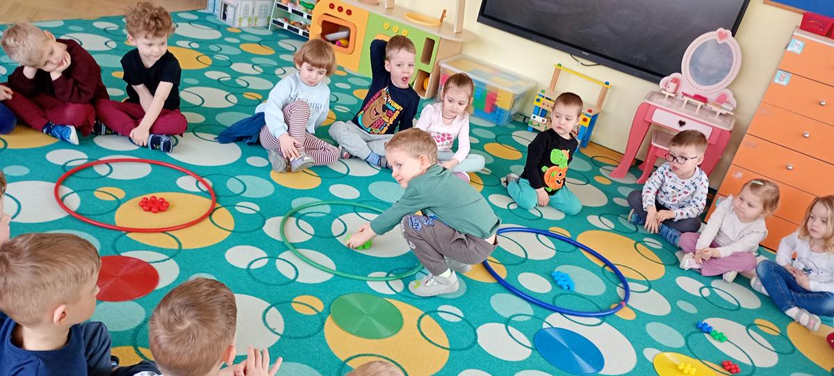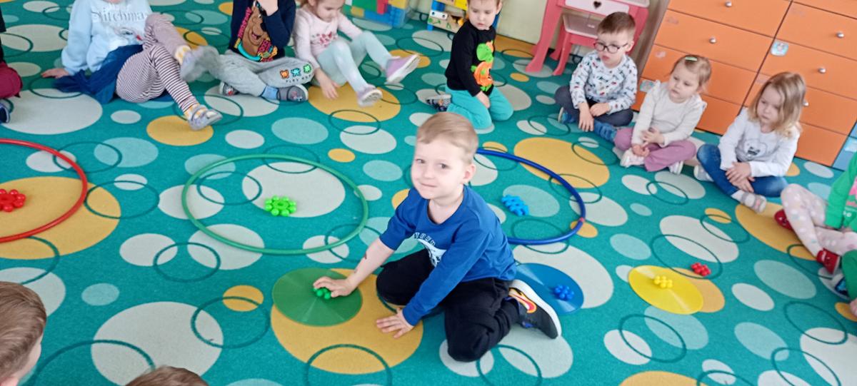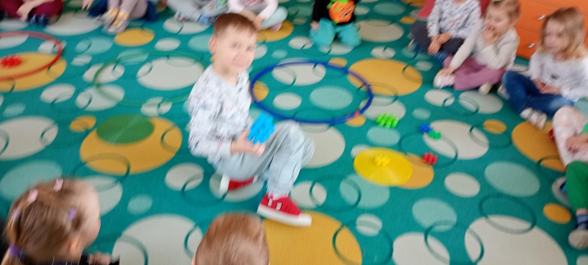 Dzieci utrwalały nazwy kolorów podstawowych. Klasyfikowały klocki ze względu na ten sam kolor, przeliczały je oraz łączyły się w pary.