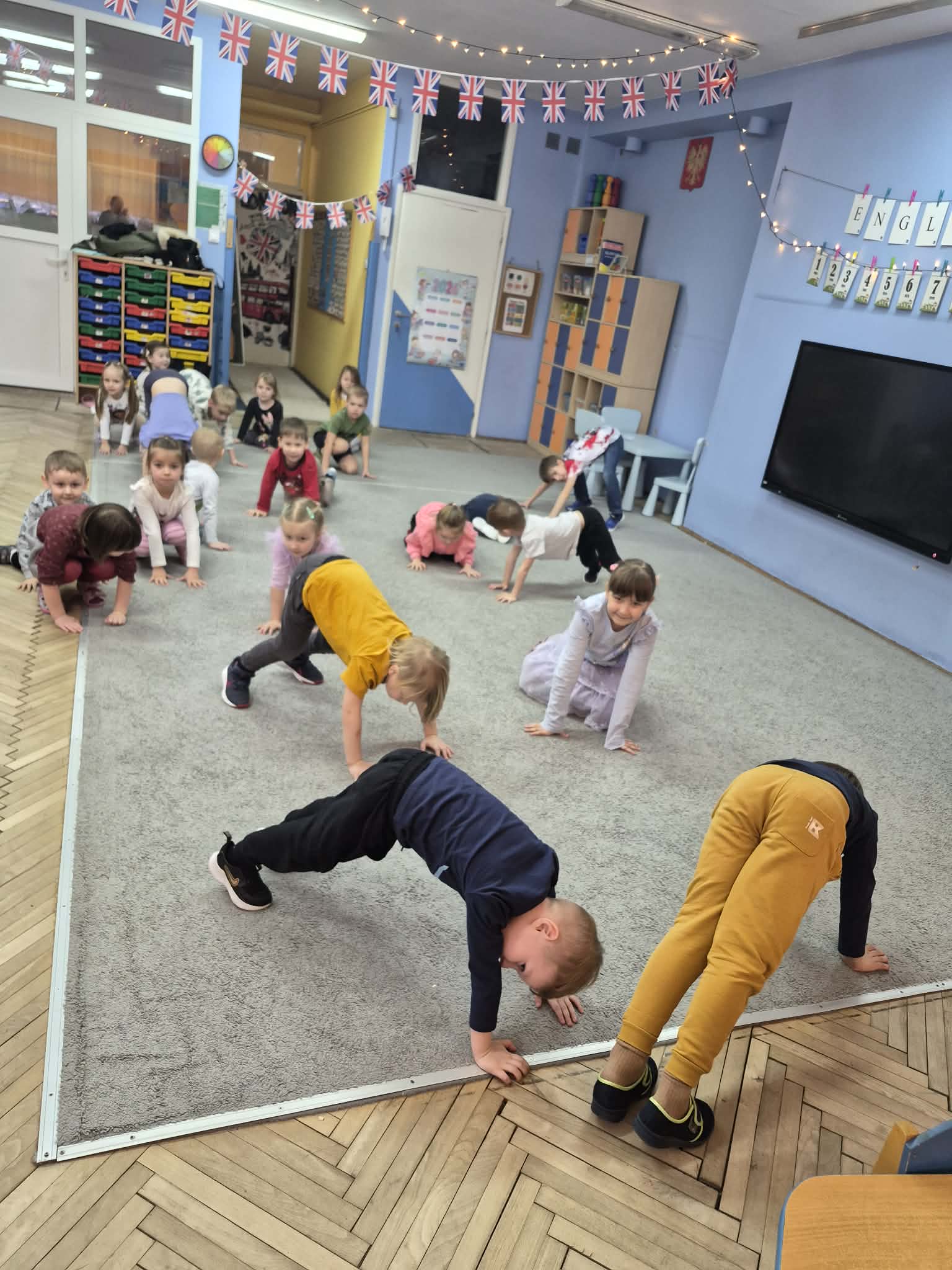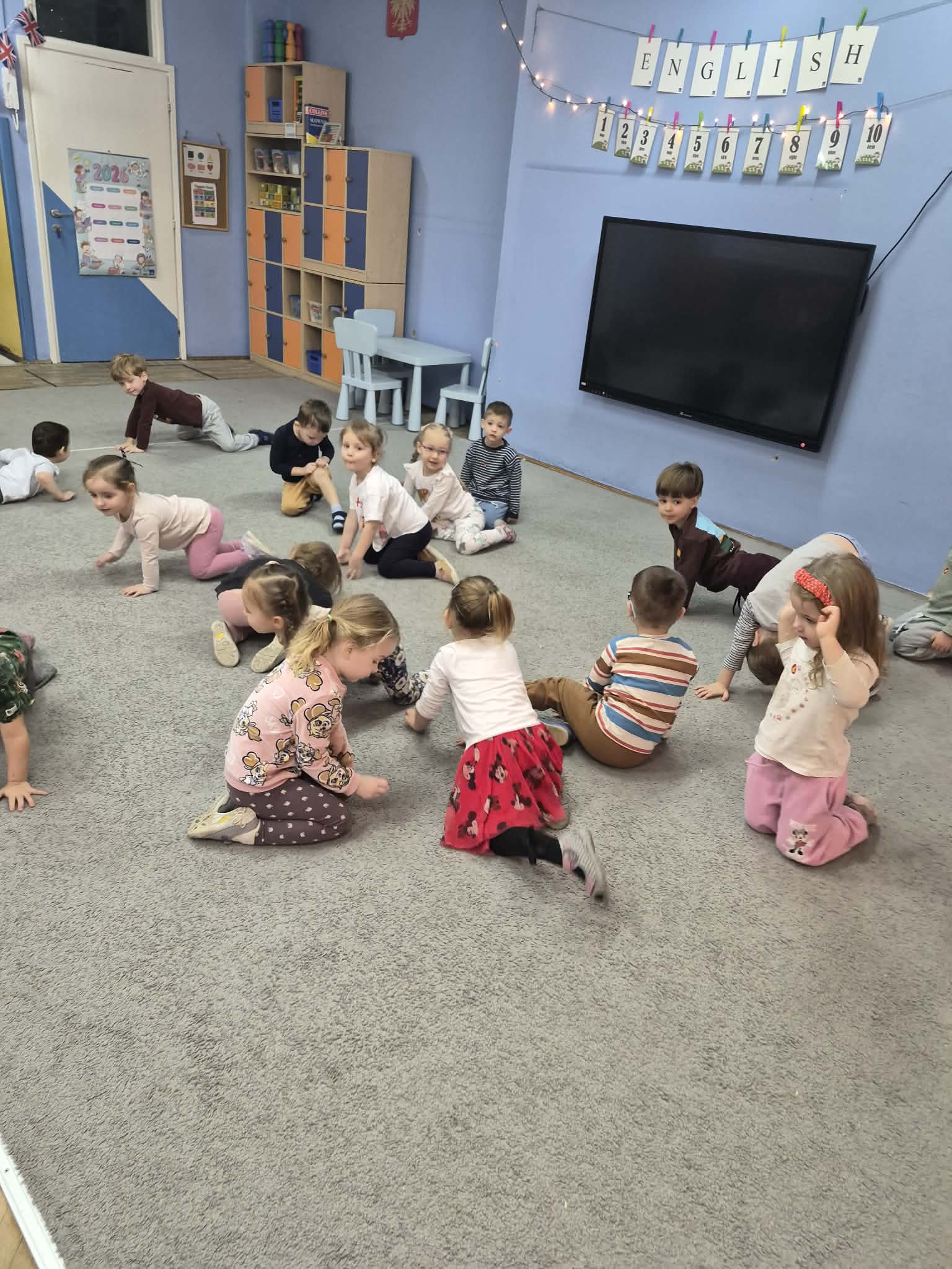 W ostatni tydzień stycznia dzieci uczyły się następujących słówek: dog – pies,cat – kot,bird –ptak,hamster – chomik,fish – ryba,turtle – żółw,parrot – papuga. Śpiewaliśmy piosenkę „This is my pet”. Dzieci uczyły się opowiadać o swoich pupilach i chętnie bawiły się w zwierzątka domowe podczas zabaw ruchowych czy kalamburów.