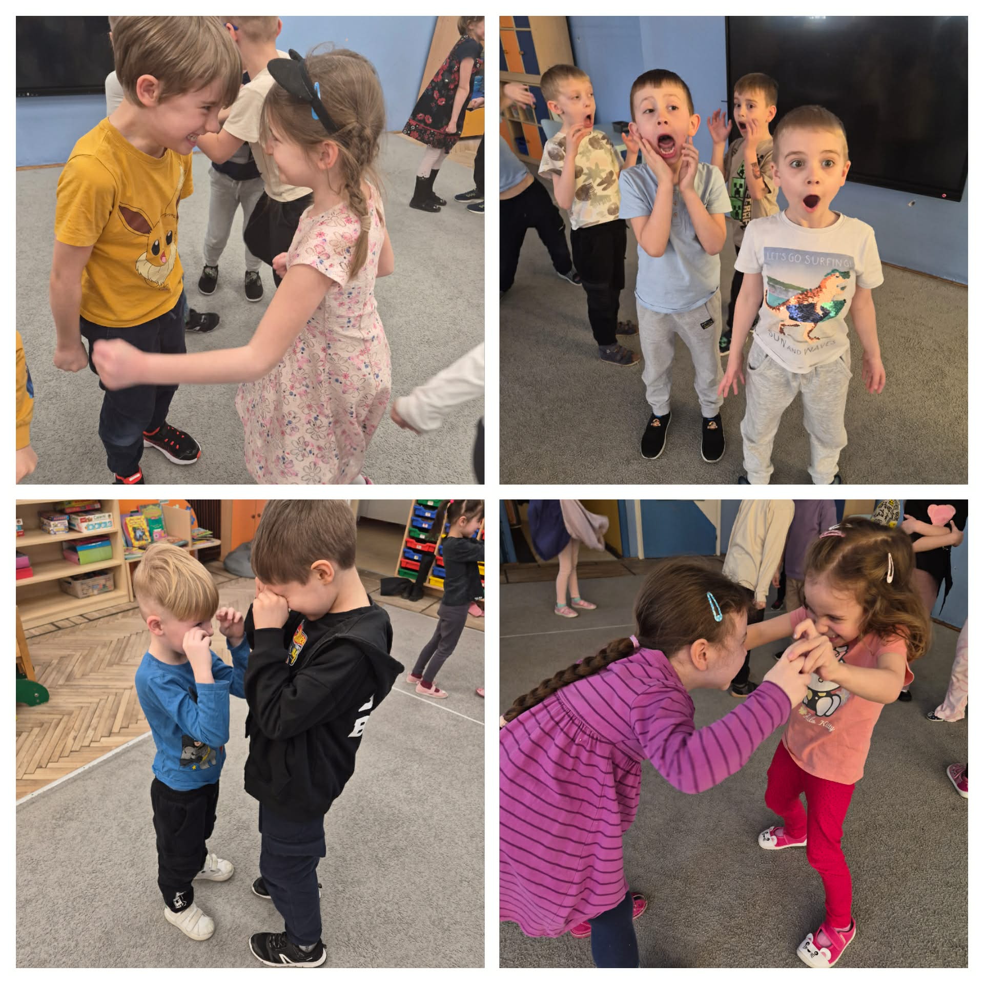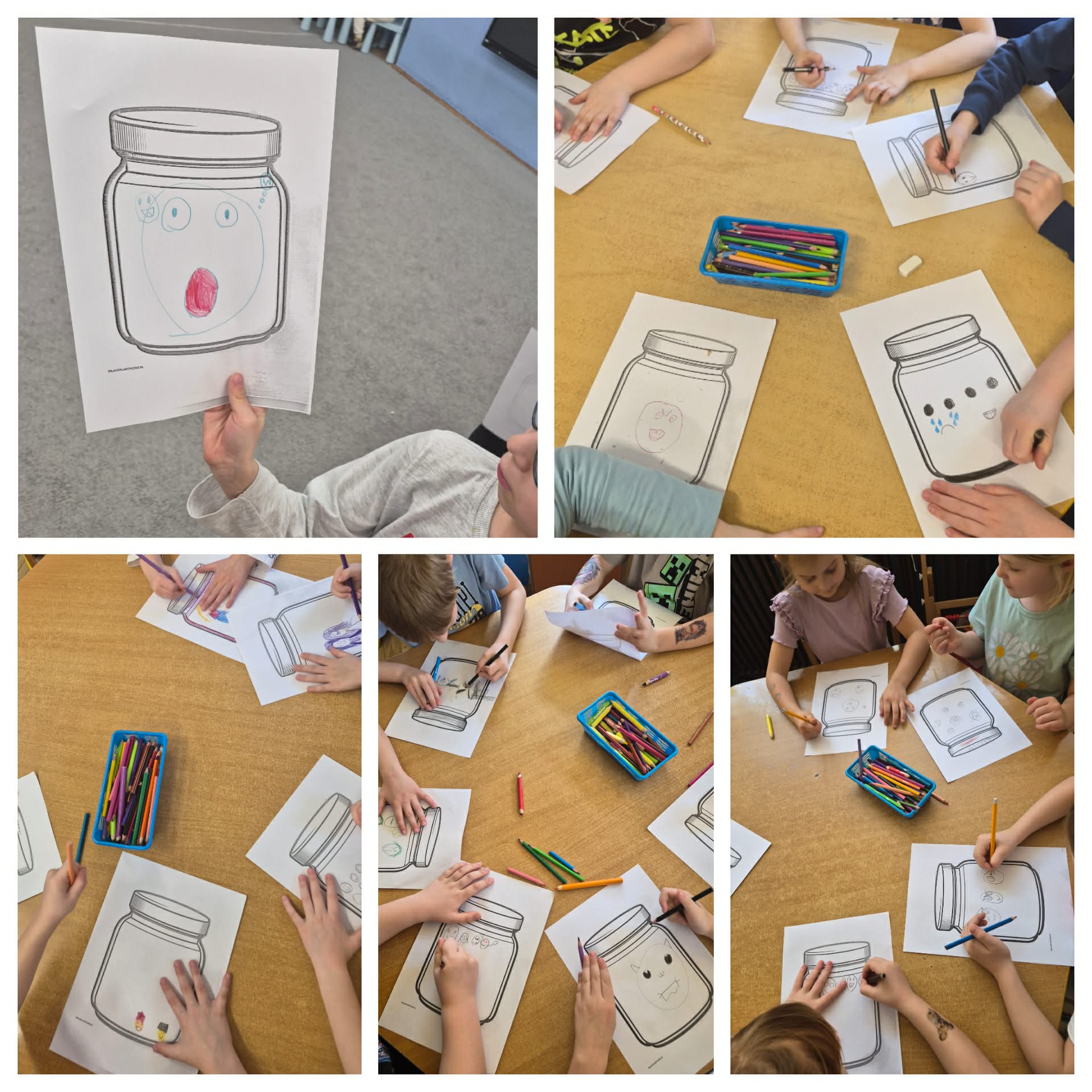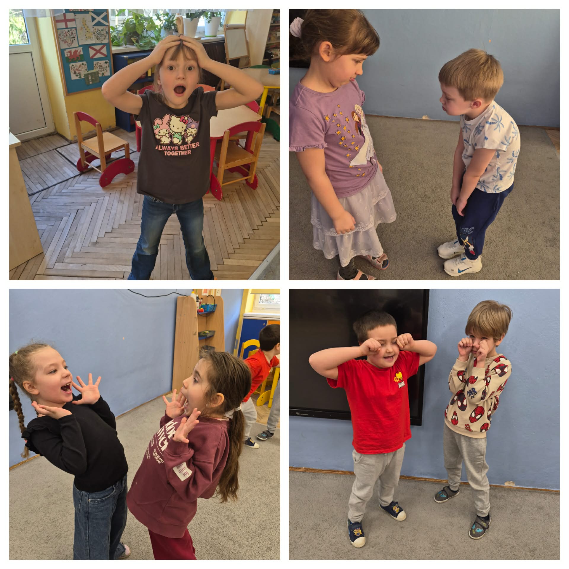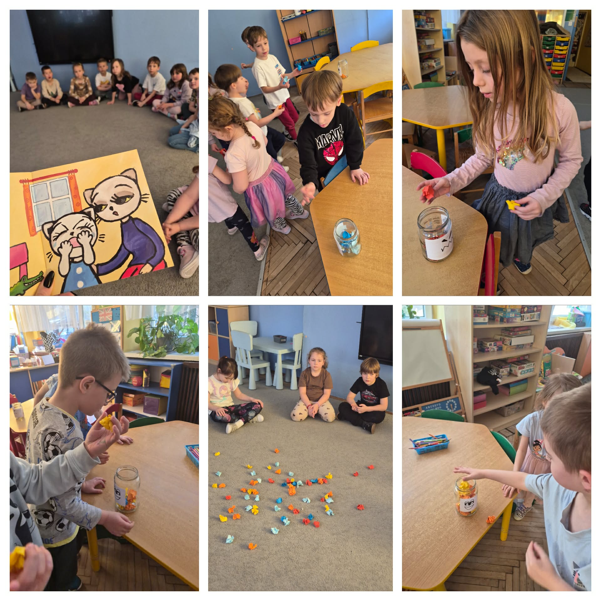 Pierwsze zajęcia projektowe dotyczyły emocji. Najpierw przeczytaliśmy książkę o różnych uczuciach, omówiliśmy ją. Każdy opowiadał jakie sytuacje sprawiają, że czujemy się weseli, źli, smutni, przestraszeni czy zaskoczeni. Następnie utrwaliliśmy nazwy poszczególnych emocji dzięki kostce edukacyjnej i zabawie z papierowym misiem. Później dzieci segregowały emocje kolorami. Następna była zabawa dramowa, która sprawiła dzieciom najwięcej frajdy. Na koniec wykonaliśmy słoje emocji.