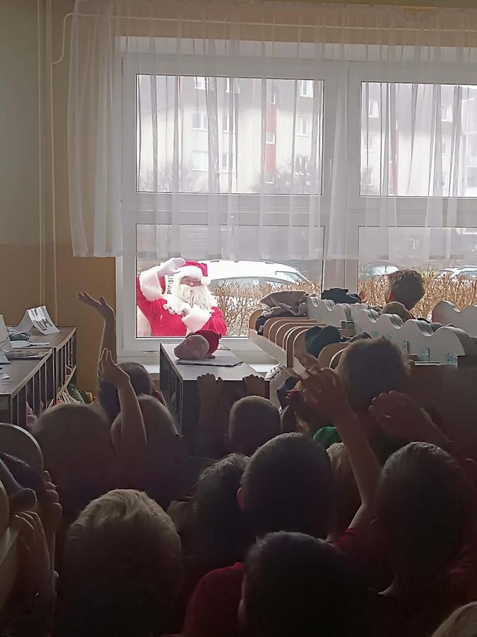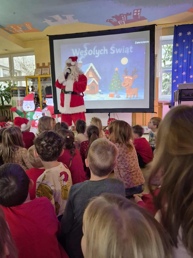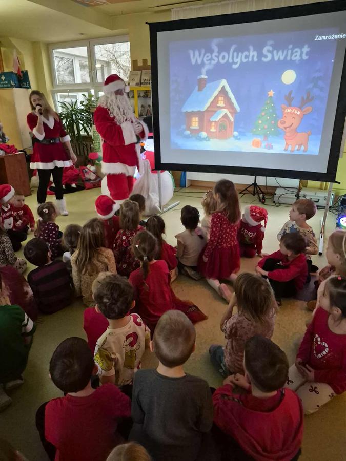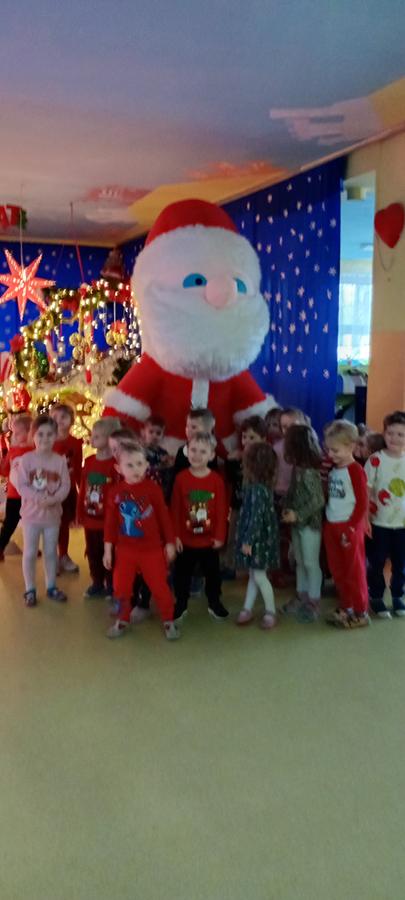 Po zabawach nadszedł moment pełen emocji, dzieci z niecierpliwością oczekiwały na przybycie Świętego Mikołaja. Gdy wreszcie się pojawił, na twarzach przedszkolaków widać było uśmiechy i radość. Dzieci powitały Mikołaja z wielką radością, a spotkanie z nim było niezapomnianym przeżyciem pełnym uśmiechu, wzruszeń i świątecznej magii.