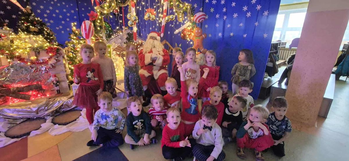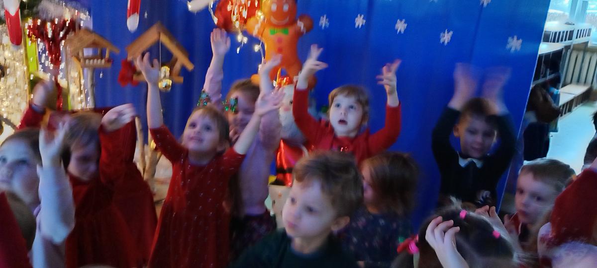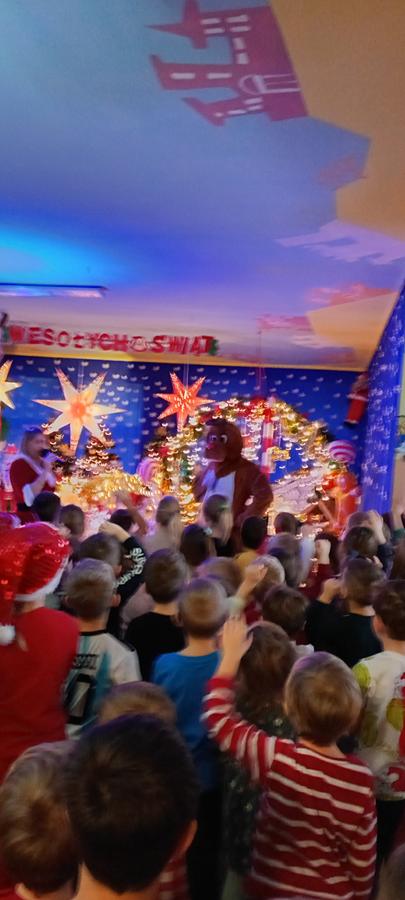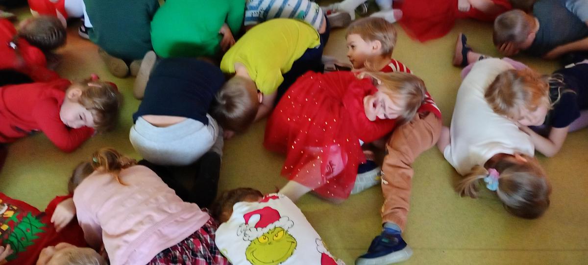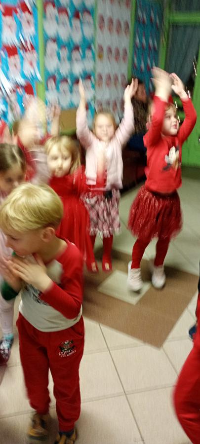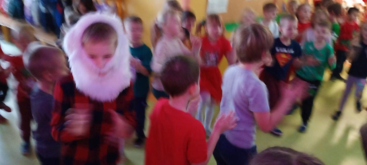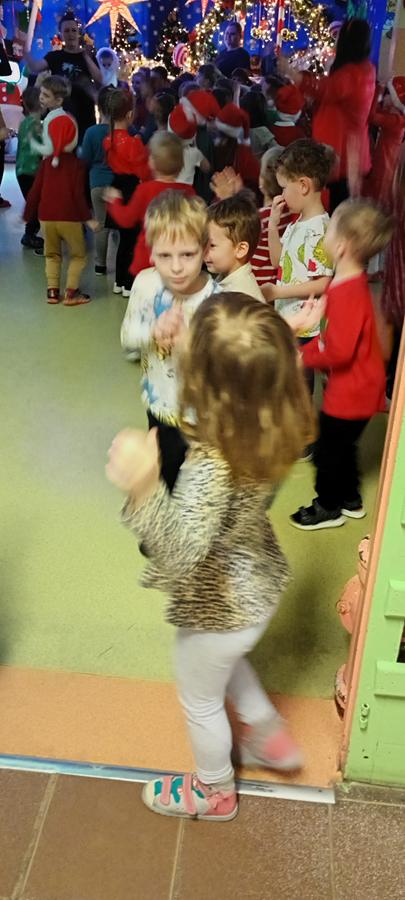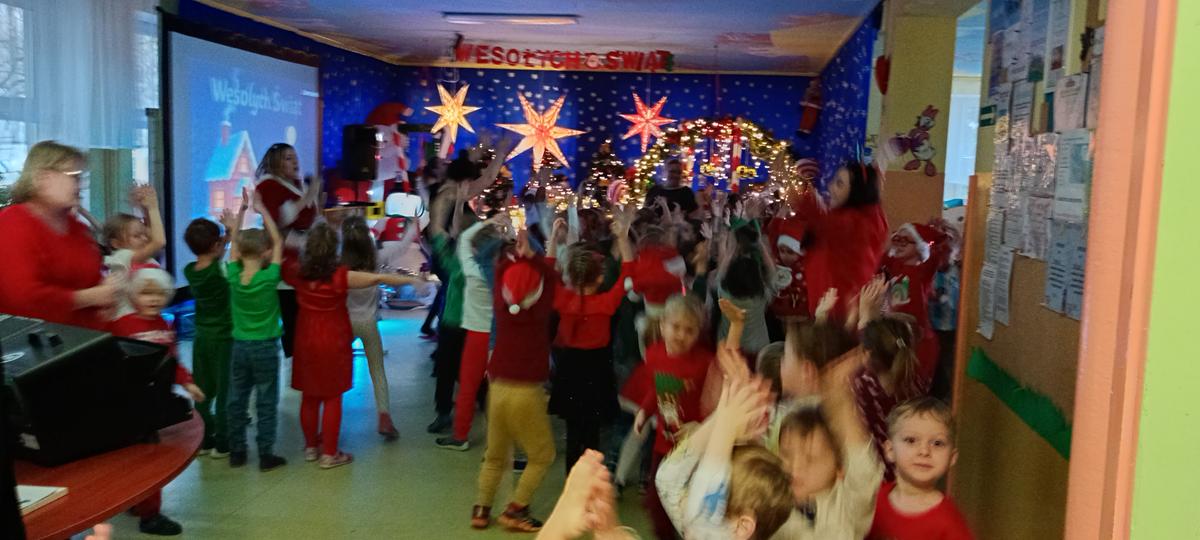 W naszym przedszkolu panowała wyjątkowa świąteczna atmosfera. Spotkanie z Mikołajem rozpoczęliśmy od wesołej zabawy z Mikołajową i reniferem. Dzieci ochoczo brały udział w tańcach, wspólnych zabawach ruchowych, które wprowadziły wszystkich w radosny, świąteczny nastrój.