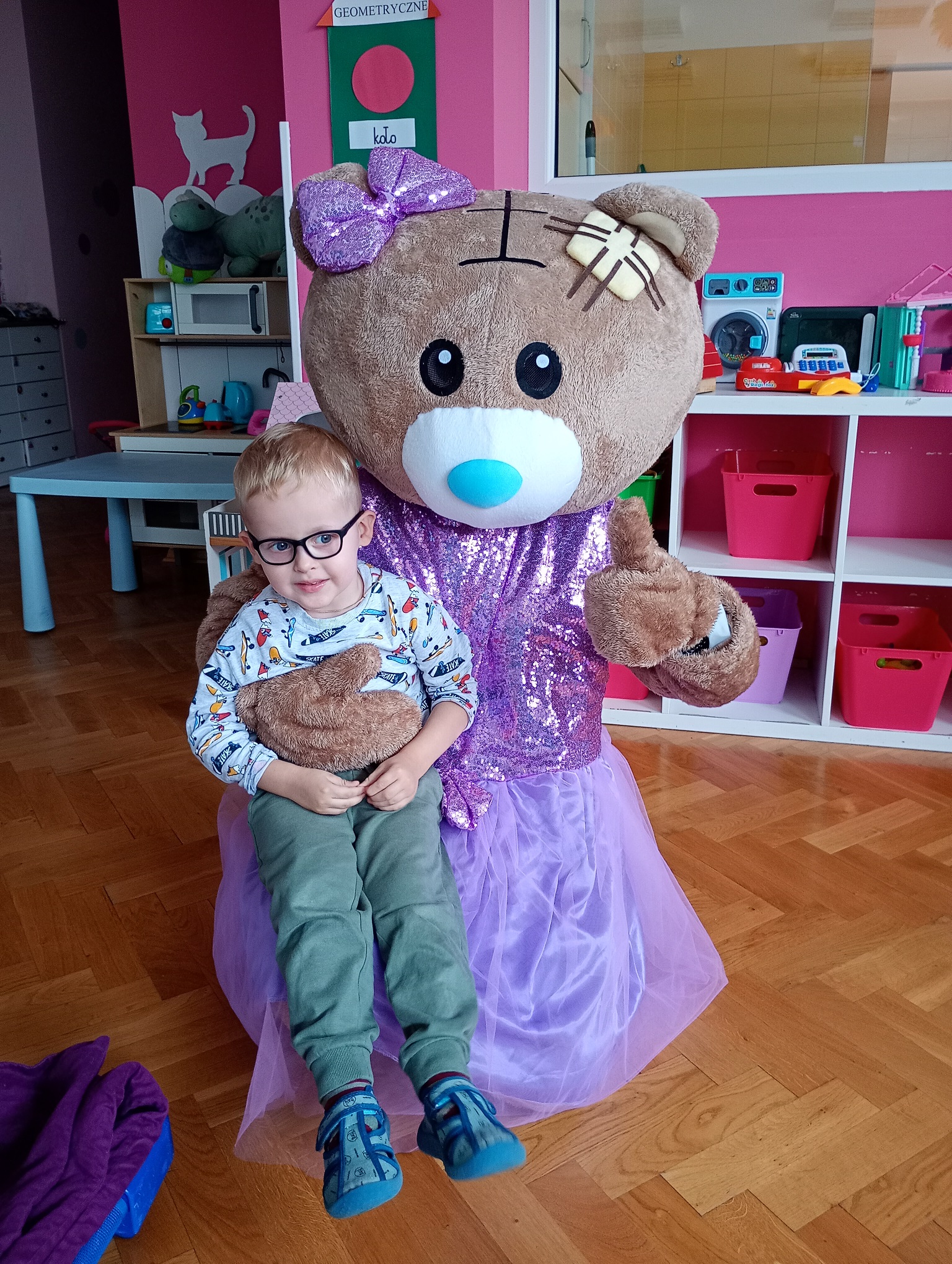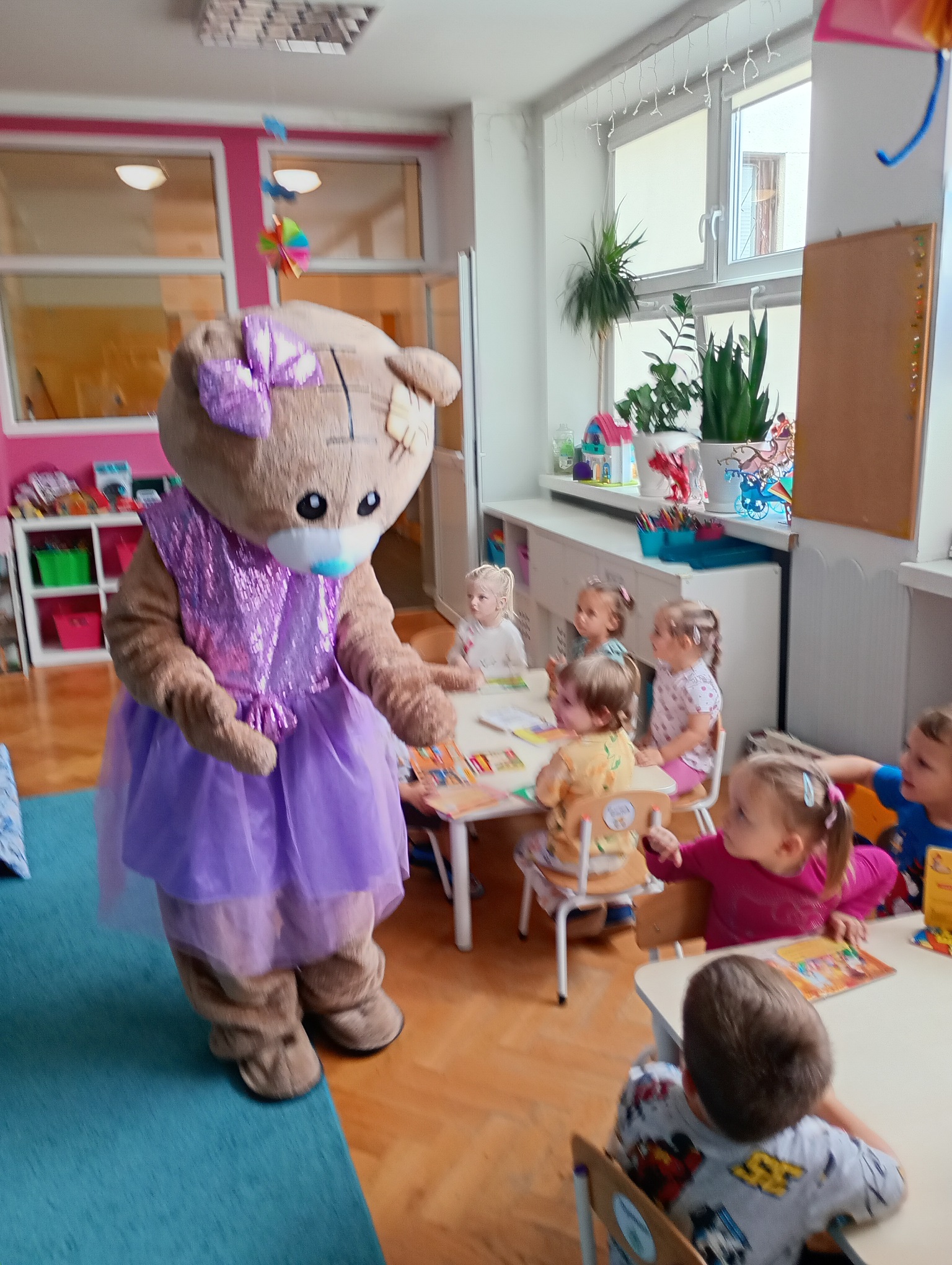 Dziś w naszym przedszkolu wydarzyło się coś wyjątkowego! Przedszkolaków odwiedził specjalny gość – wielki, uśmiechnięty miś, który wywołał ogromną radość i zachwyt wśród dzieci.