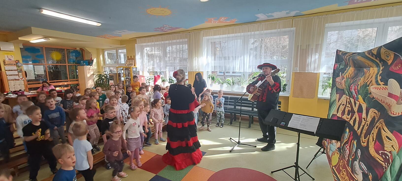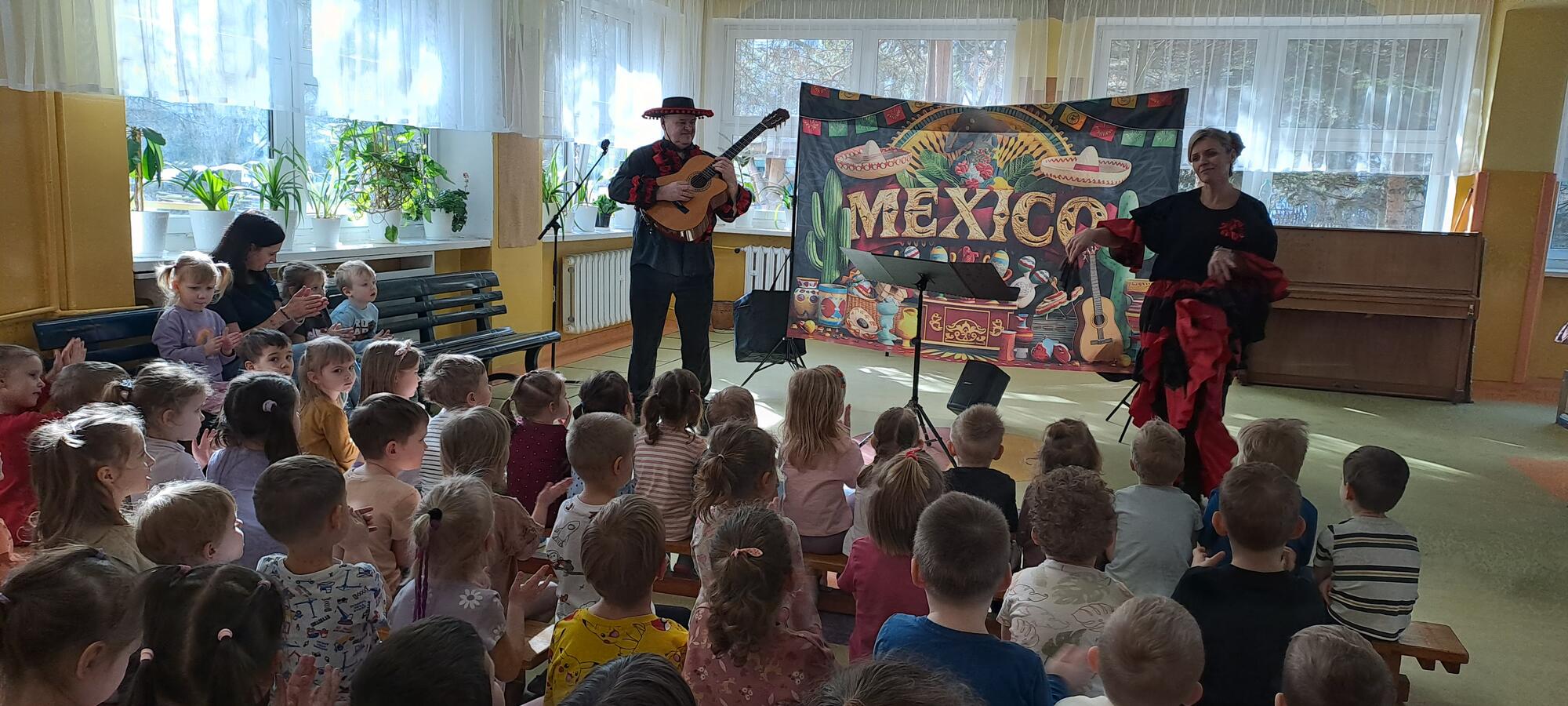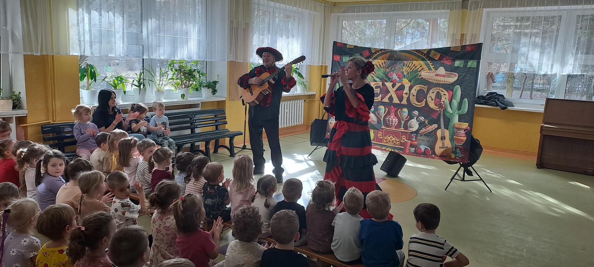 Dziś w naszym przedszkolu odbyło się kolejne spotkanie z cyklu "Lawendowych Koncertów Muzycznych". Tym razem prowadzący zabrali dzieci w podróż do roztańczonego Meksyku!