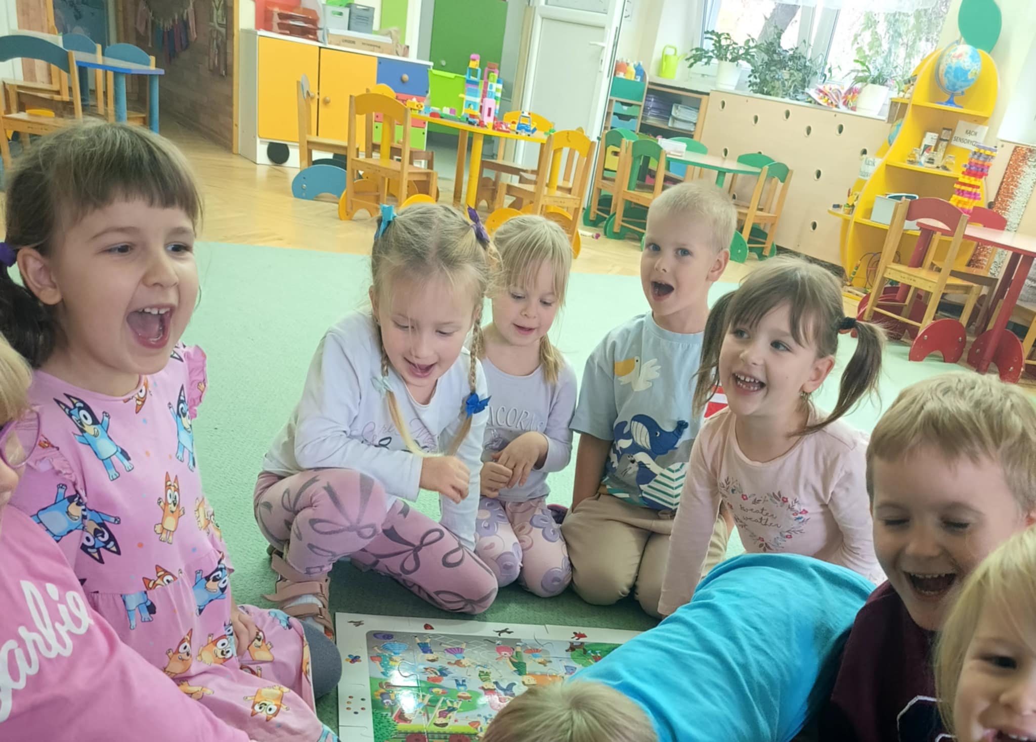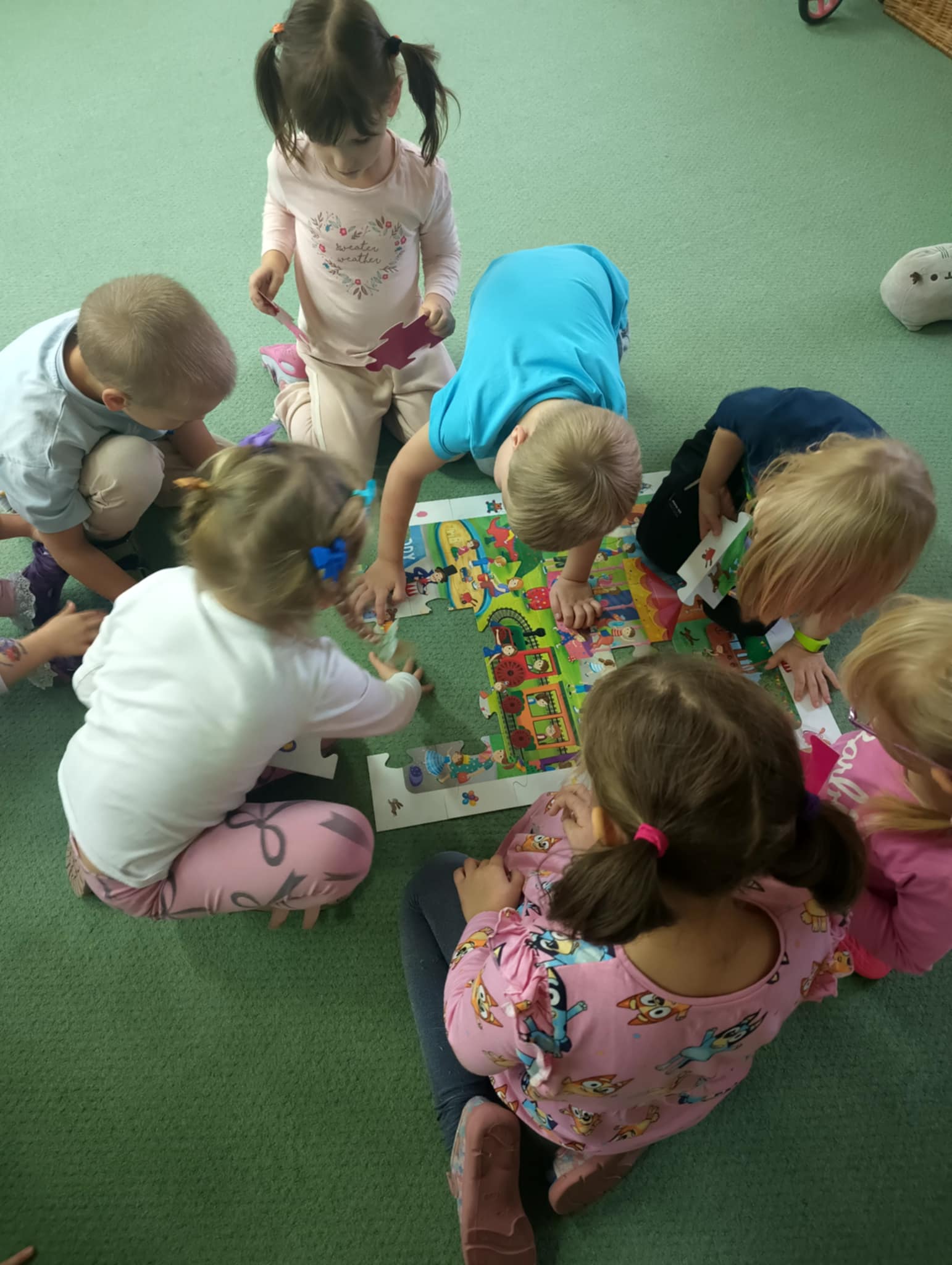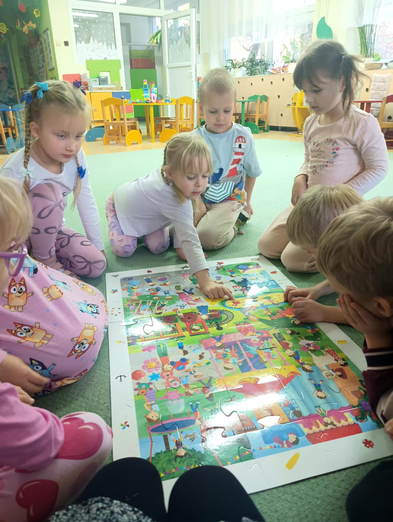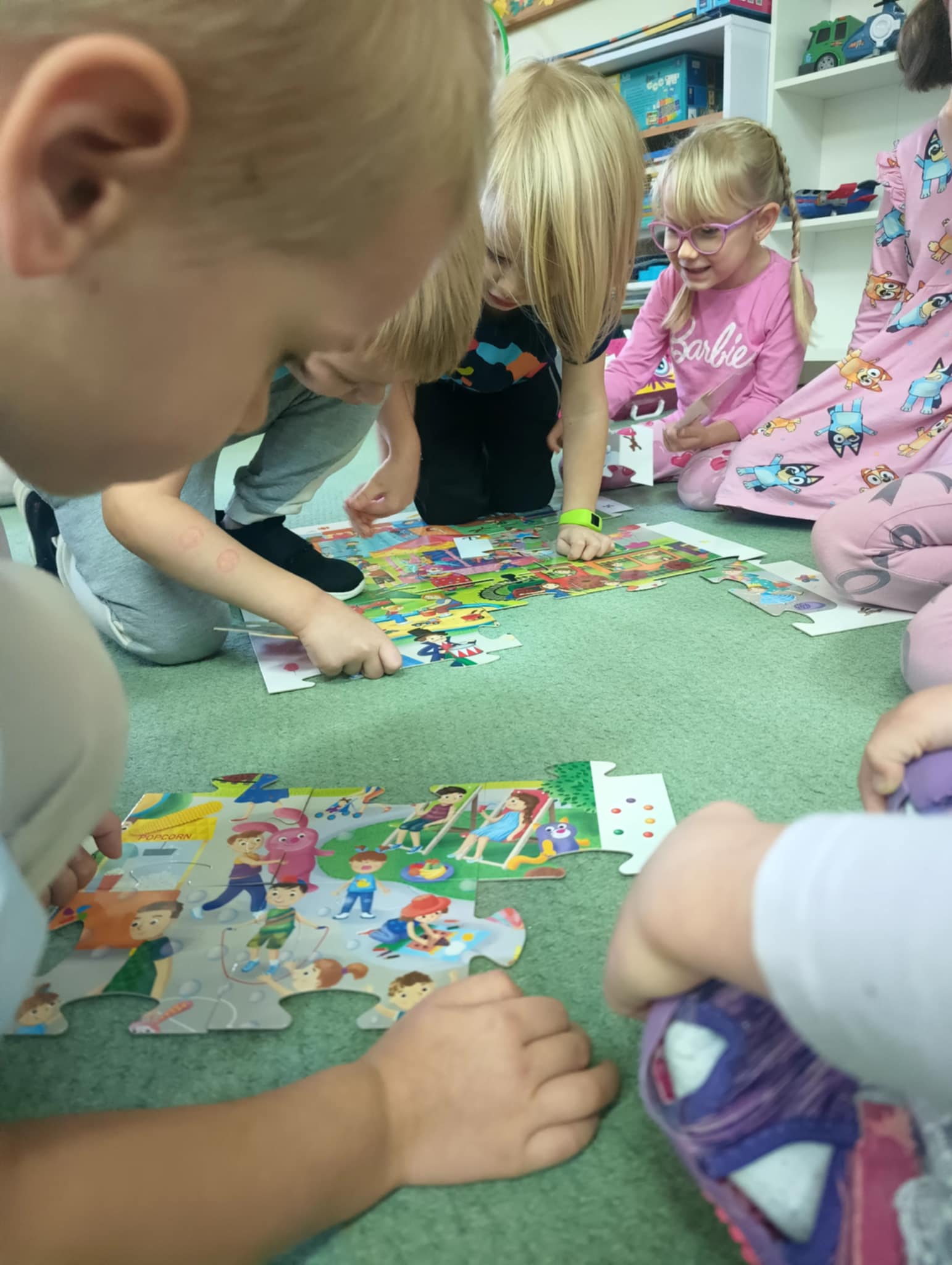 Po intensywnym dniu pełnym zabaw i nauki nasze przedszkolaki spędziły relaksujące popołudnie przed wyjściem do domu. Dzieci układały puzzle i szukały ukrytych elementów, co dostarczyło im mnóstwo radości i emocji. To był wspólnie fajnie spędzony czas, który pozwolił rozwijać koncentrację, współpracę w grupie i kreatywne myślenie, a przy tym świetnie się bawić
