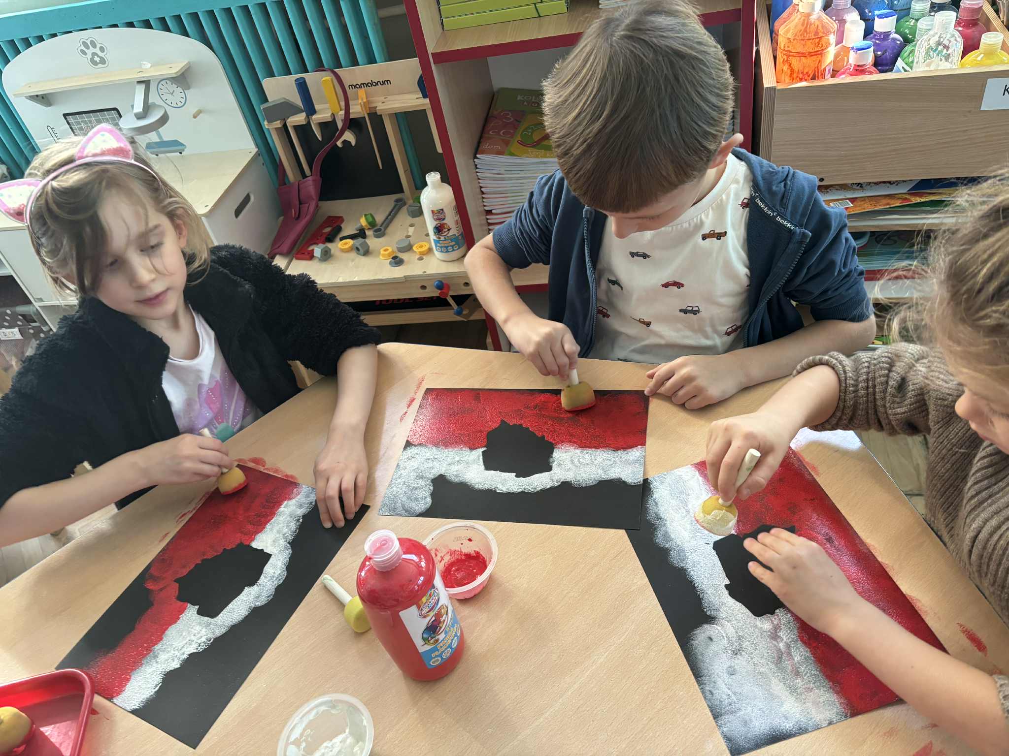 Dzieci z grupy Sówki wykonały dziś piękną pracę plastyczną pt. „Polska – nasza Ojczyzna”. Podczas zajęć rozmawialiśmy o symbolach narodowych, ważnych miejscach w naszym kraju oraz o tym, co dla nas oznacza bycie Polakiem.