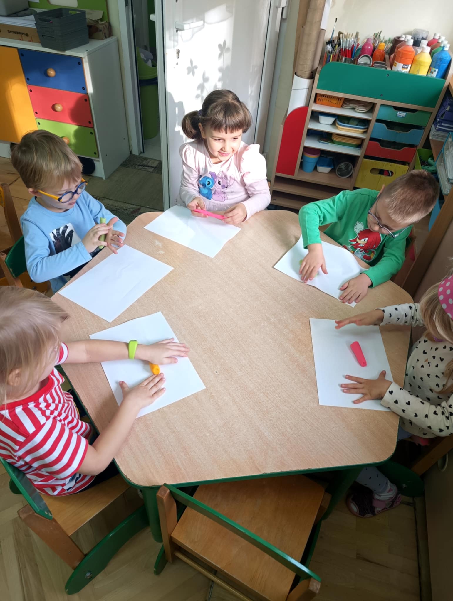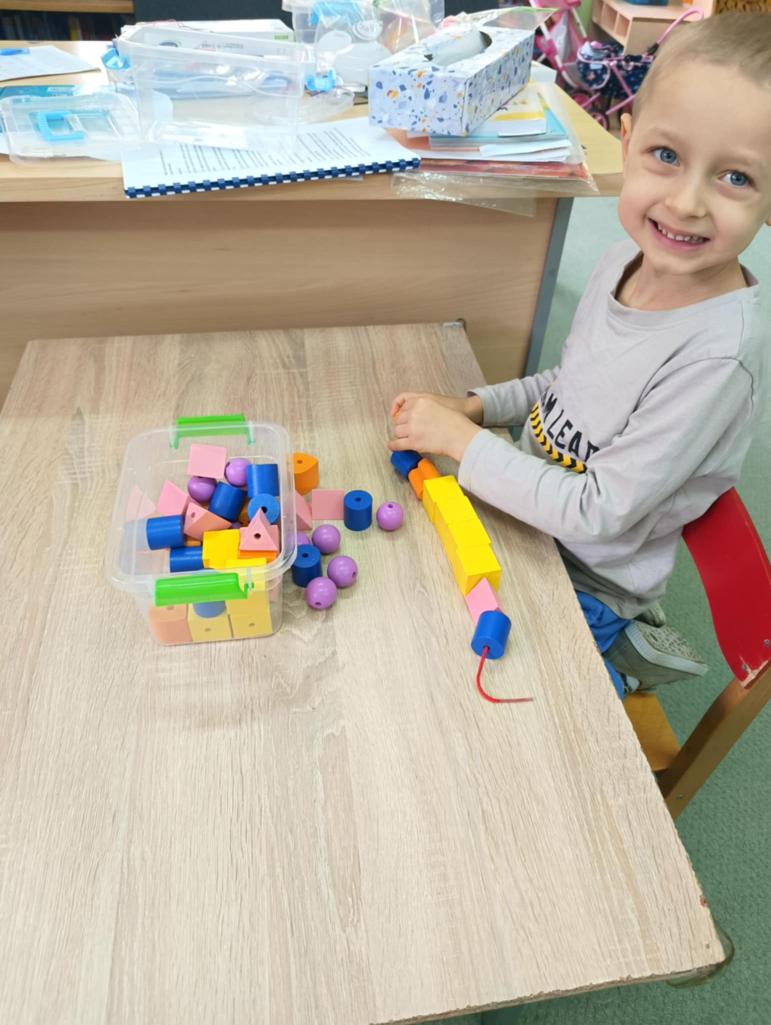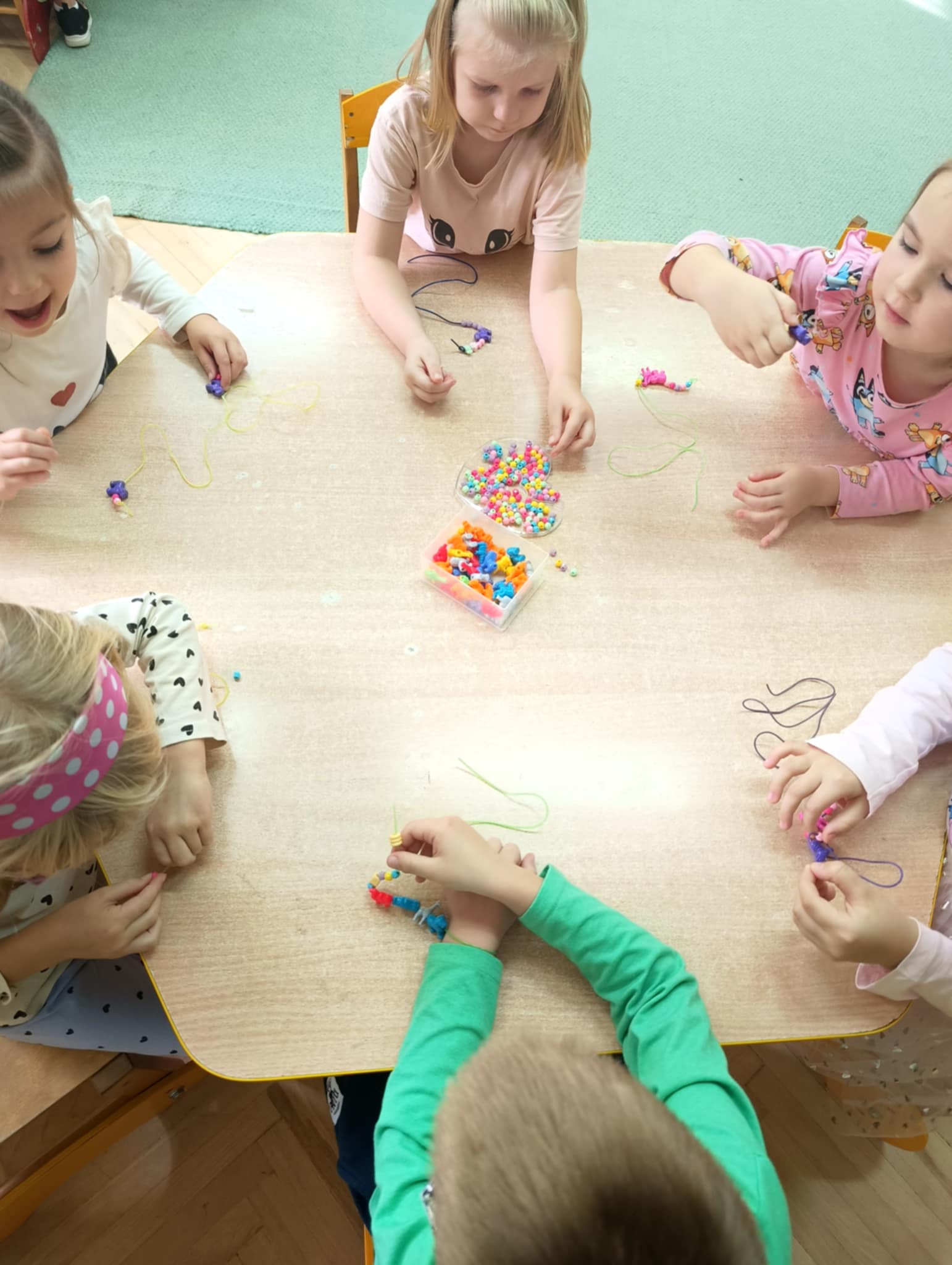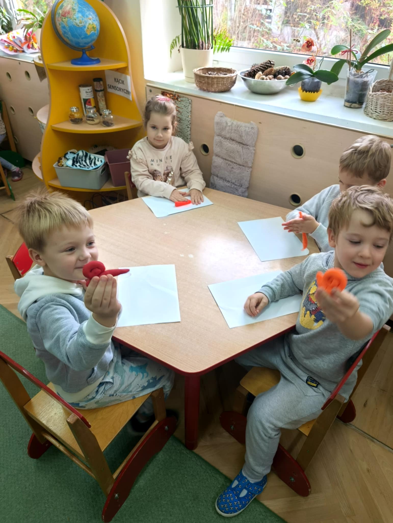 Motylki uczestniczyły w zajęciach w ramach innowacji pedagogicznej Terapia Ręki, której celem jest wspieranie prawidłowego rozwoju motoryki małej, koordynacji wzrokowo-ruchowej oraz sprawności dłoni i palców. Podczas zajęć przedszkolaki wykonywały różnorodne, angażujące aktywności: Nawlekanie koralików na sznurek. Dzieci ćwiczyły precyzję ruchów palców, cierpliwość oraz koncentrację. Nawlekanie drobnych elementów to świetny trening dla dłoni i ważny krok w przygotowaniu do późniejszych czynności grafomotorycznych. Lepienie z ciastoliny. Miękka masa plastyczna pozwoliła dzieciom wzmacniać siłę dłoni, usprawniać ruchy palców oraz rozwijać wyobraźnię. Lepienie, ugniatanie i rolowanie to doskonałe ćwiczenia sensoryczne. Nawlekanie dużych koralików z czterema otworami (przypominających guziki) Ta aktywność stanowiła świetne wyzwanie – wymagała planowania ruchu, celowania i właściwego ułożenia elementu. Dzięki temu dzieci rozwijały koordynację oko-ręka oraz orientację przestrzenną. Zajęcia przebiegały w atmosferze radości, twórczej zabawy i zaangażowania. Motylki poradziły sobie doskonale z każdym zadaniem. Cieszymy się, że dzięki tej innowacji możemy wspierać rozwój naszych przedszkolaków poprzez zabawy, które jednocześnie bawią, uczą i wzmacniają sprawność małych rączek.