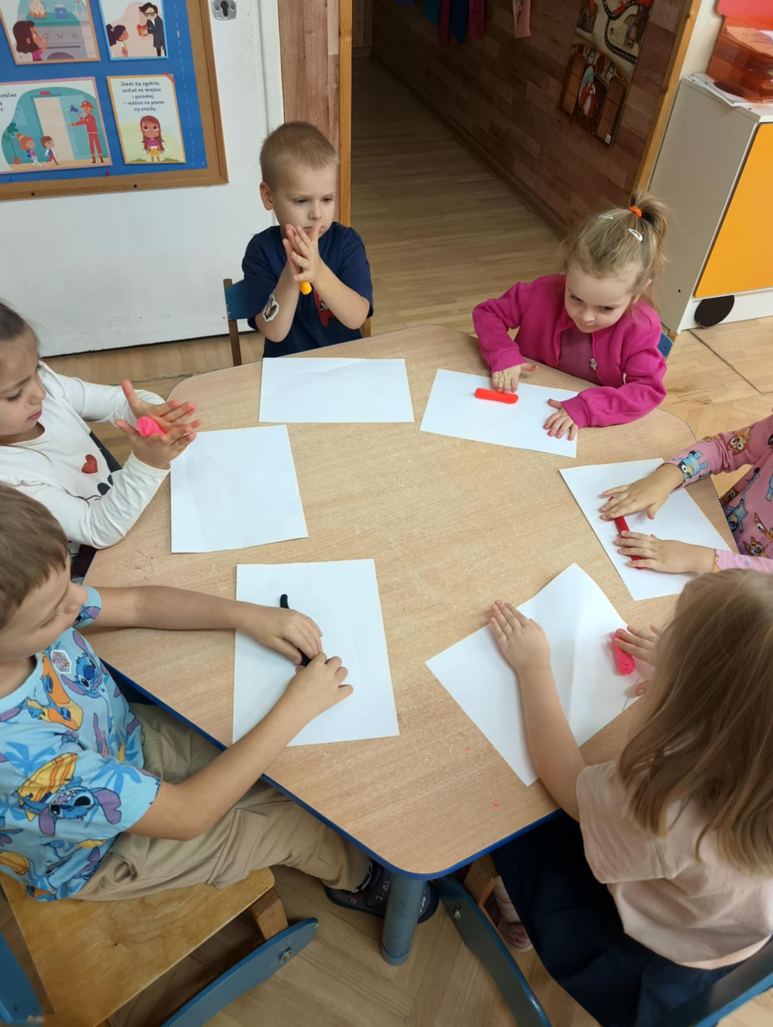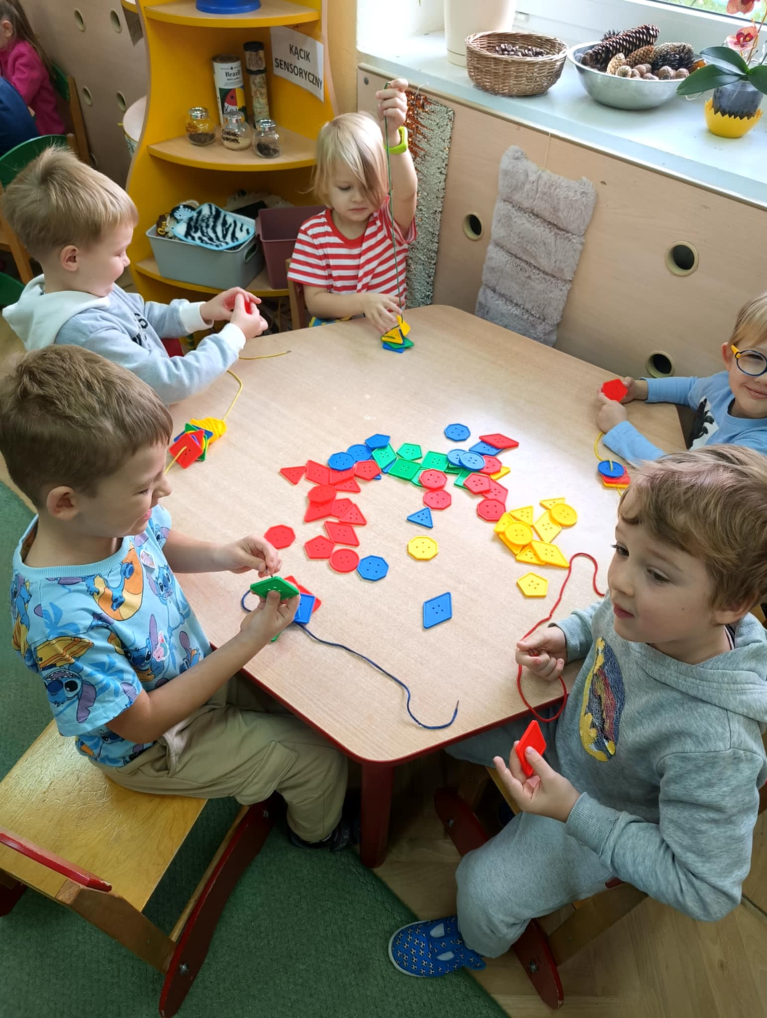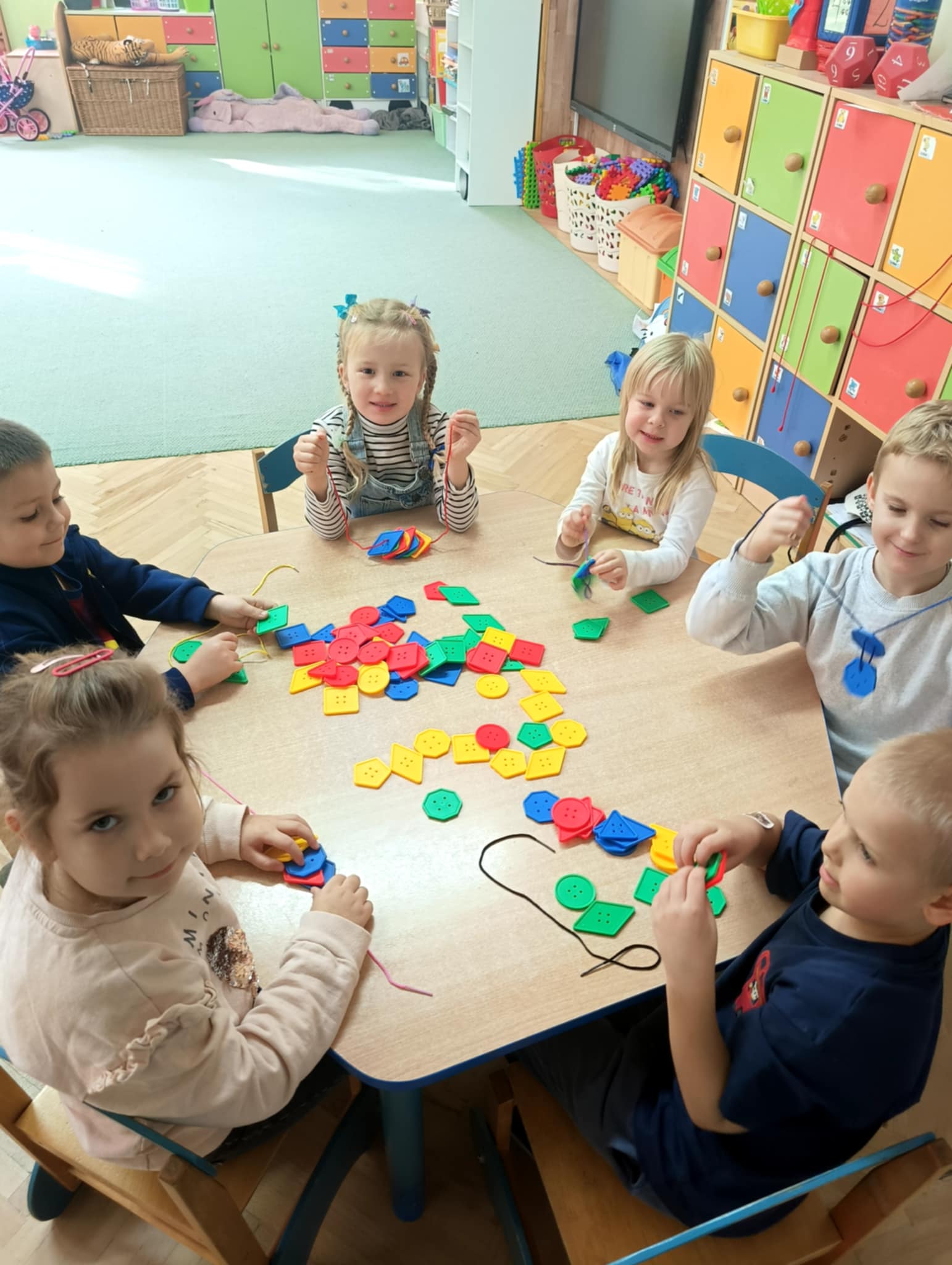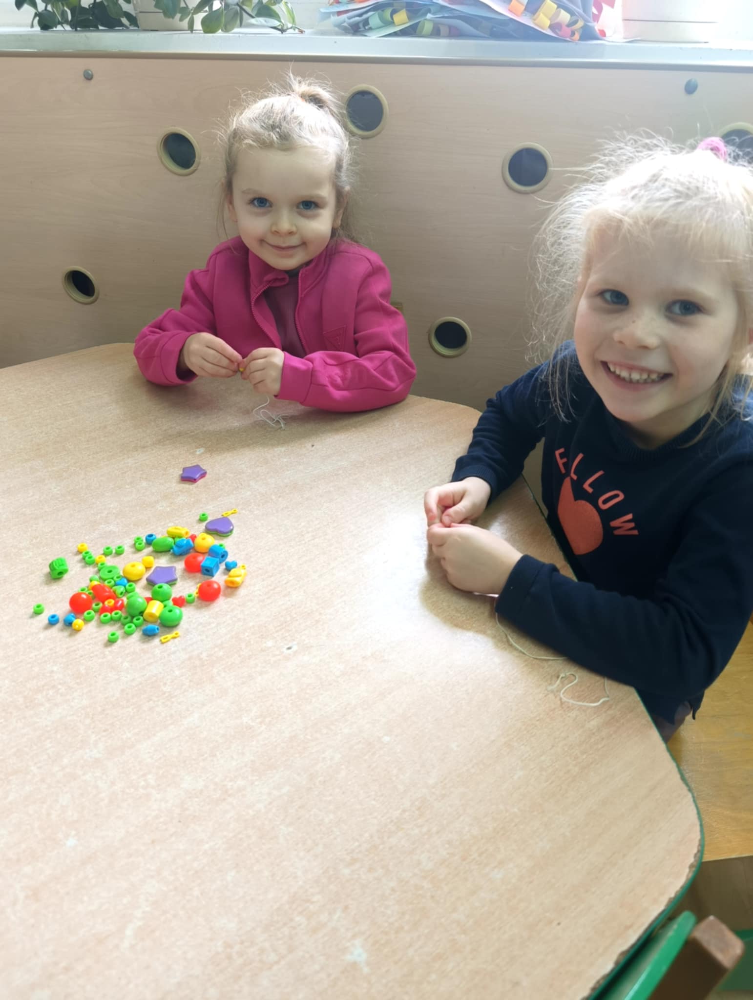 Motylki uczestniczyły w zajęciach w ramach innowacji pedagogicznej Terapia Ręki, której celem jest wspieranie prawidłowego rozwoju motoryki małej, koordynacji wzrokowo-ruchowej oraz sprawności dłoni i palców. Podczas zajęć przedszkolaki wykonywały różnorodne, angażujące aktywności: Nawlekanie koralików na sznurek. Dzieci ćwiczyły precyzję ruchów palców, cierpliwość oraz koncentrację. Nawlekanie drobnych elementów to świetny trening dla dłoni i ważny krok w przygotowaniu do późniejszych czynności grafomotorycznych. Lepienie z ciastoliny. Miękka masa plastyczna pozwoliła dzieciom wzmacniać siłę dłoni, usprawniać ruchy palców oraz rozwijać wyobraźnię. Lepienie, ugniatanie i rolowanie to doskonałe ćwiczenia sensoryczne. Nawlekanie dużych koralików z czterema otworami (przypominających guziki) Ta aktywność stanowiła świetne wyzwanie – wymagała planowania ruchu, celowania i właściwego ułożenia elementu. Dzięki temu dzieci rozwijały koordynację oko-ręka oraz orientację przestrzenną. Zajęcia przebiegały w atmosferze radości, twórczej zabawy i zaangażowania. Motylki poradziły sobie doskonale z każdym zadaniem. Cieszymy się, że dzięki tej innowacji możemy wspierać rozwój naszych przedszkolaków poprzez zabawy, które jednocześnie bawią, uczą i wzmacniają sprawność małych rączek.