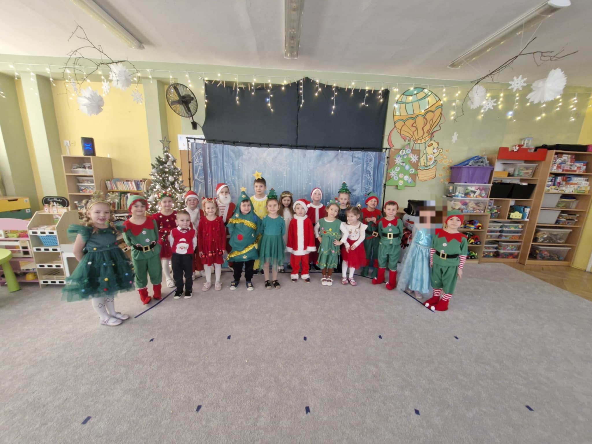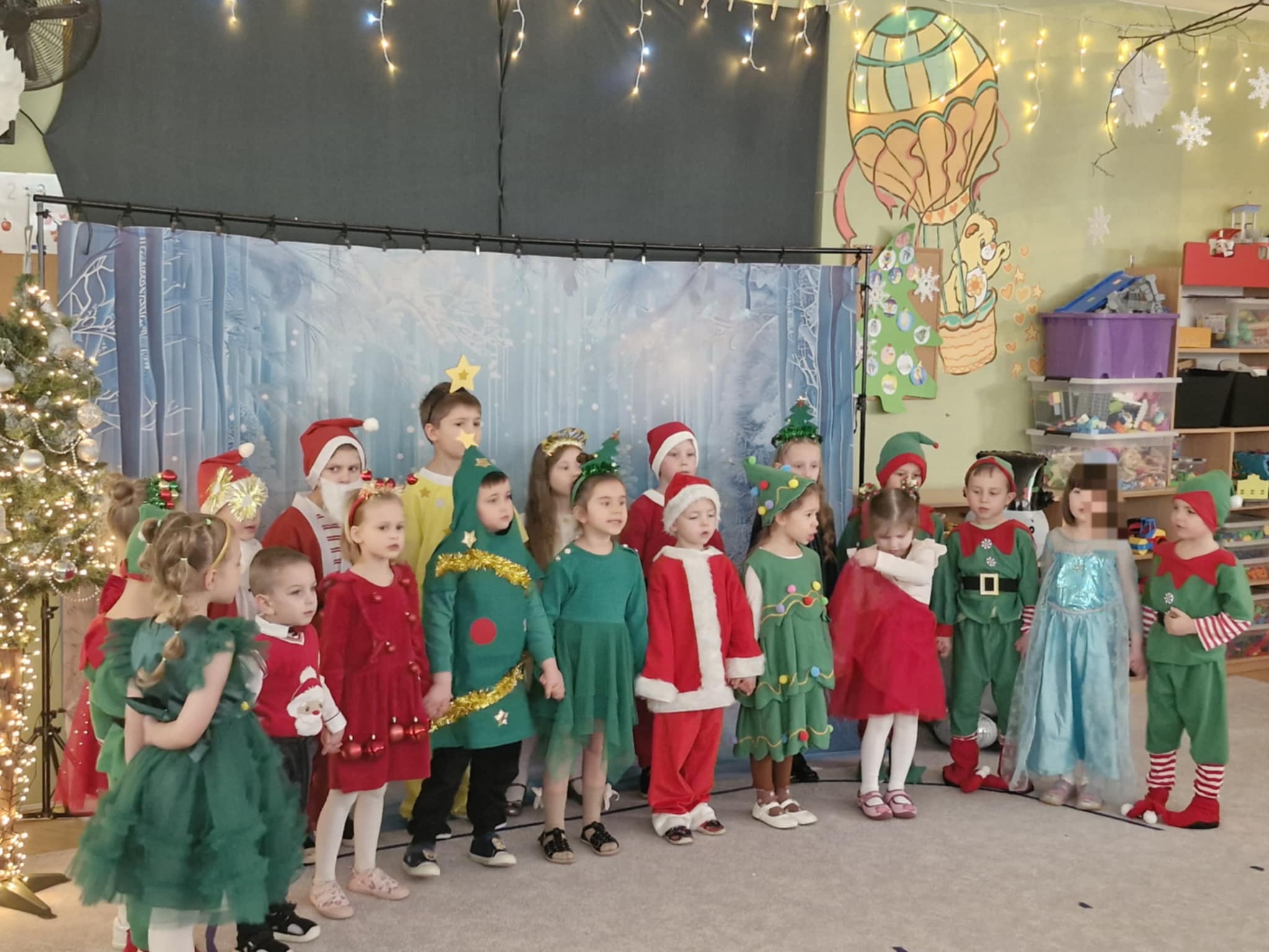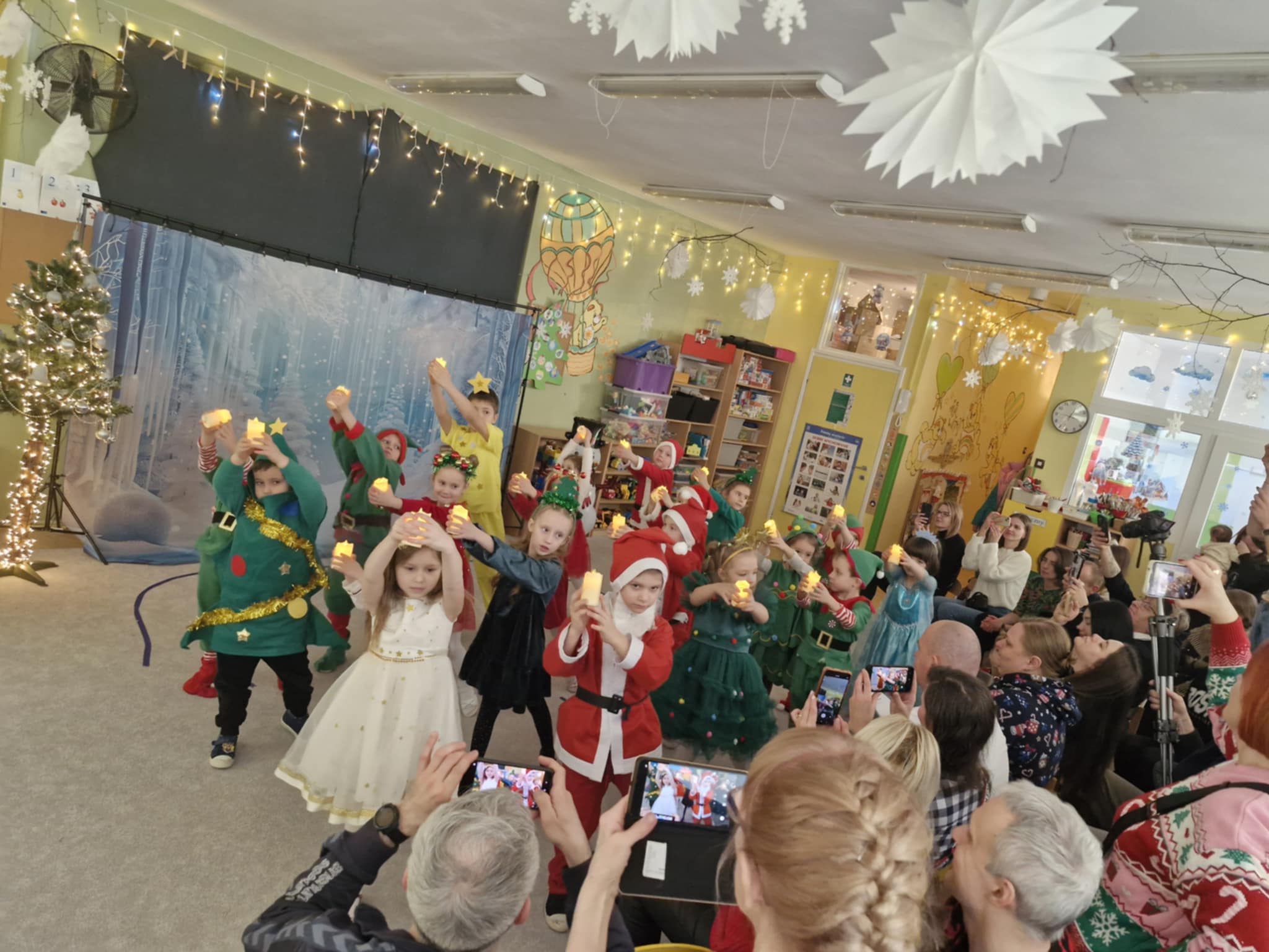 Dzieci z grupy „Jeżyki” zaprezentowały swoim rodzinom wyjątkowy spektakl mikołajkowy, pełen magii i świątecznego nastroju. Przedszkolaki z ogromnym zaangażowaniem recytowały wiersze, śpiewały piosenki oraz zaprezentowały piękny, wzruszający taniec z lampionami, który na długo pozostanie w pamięci wszystkich obecnych. Na zakończenie czekała na dzieci miła niespodzianka – mikołajkowe prezenty, które zostawił dla nich Święty Mikołaj. Dzieci przygotowały również dla swoich bliskich własnoręcznie wykonane zawieszki na choinkę z masy solnej, ozdobione ich fotografią – wyjątkowy i bardzo osobisty upominek. To było niezwykle ciepłe, rodzinne i pełne wzruszeń spotkanie, które wprowadziło wszystkich w prawdziwie świąteczny nastrój.
