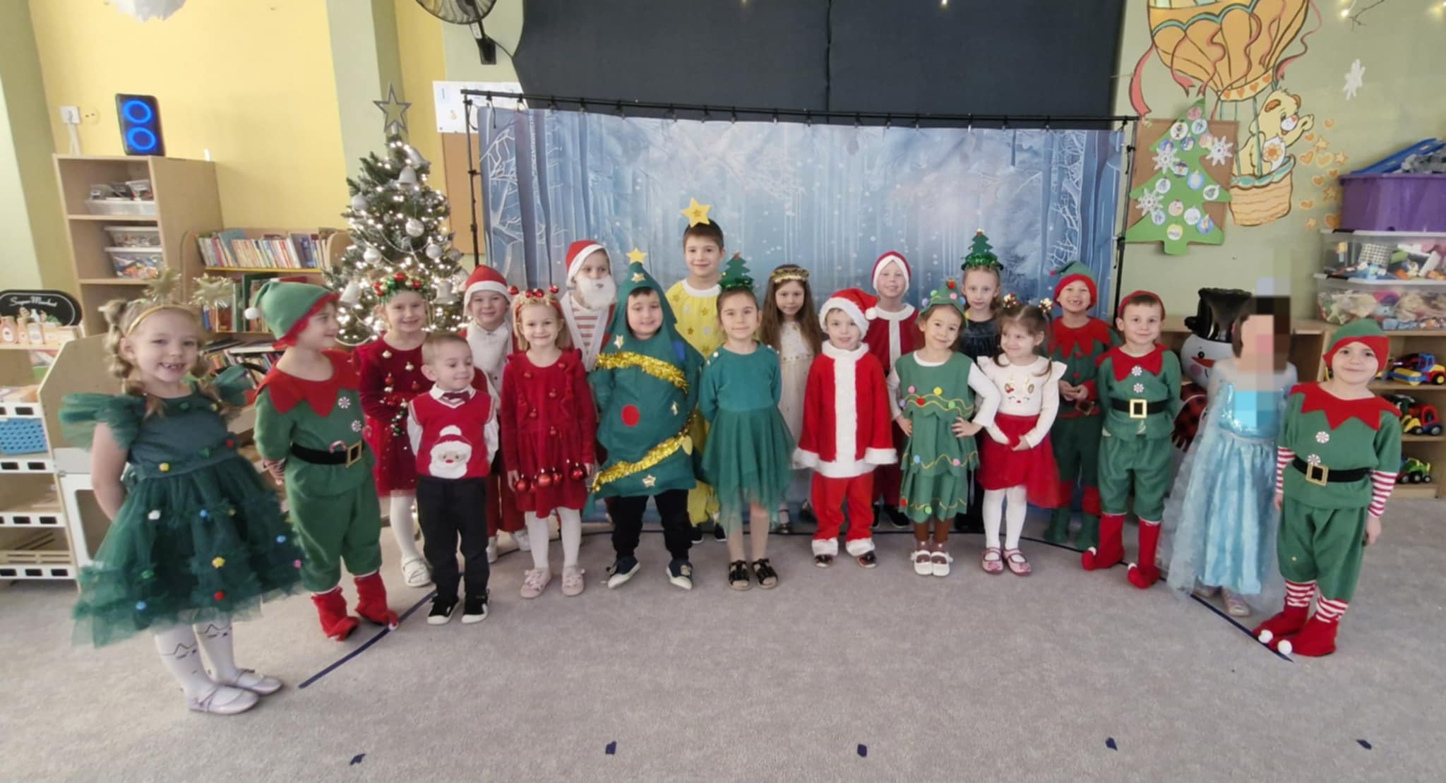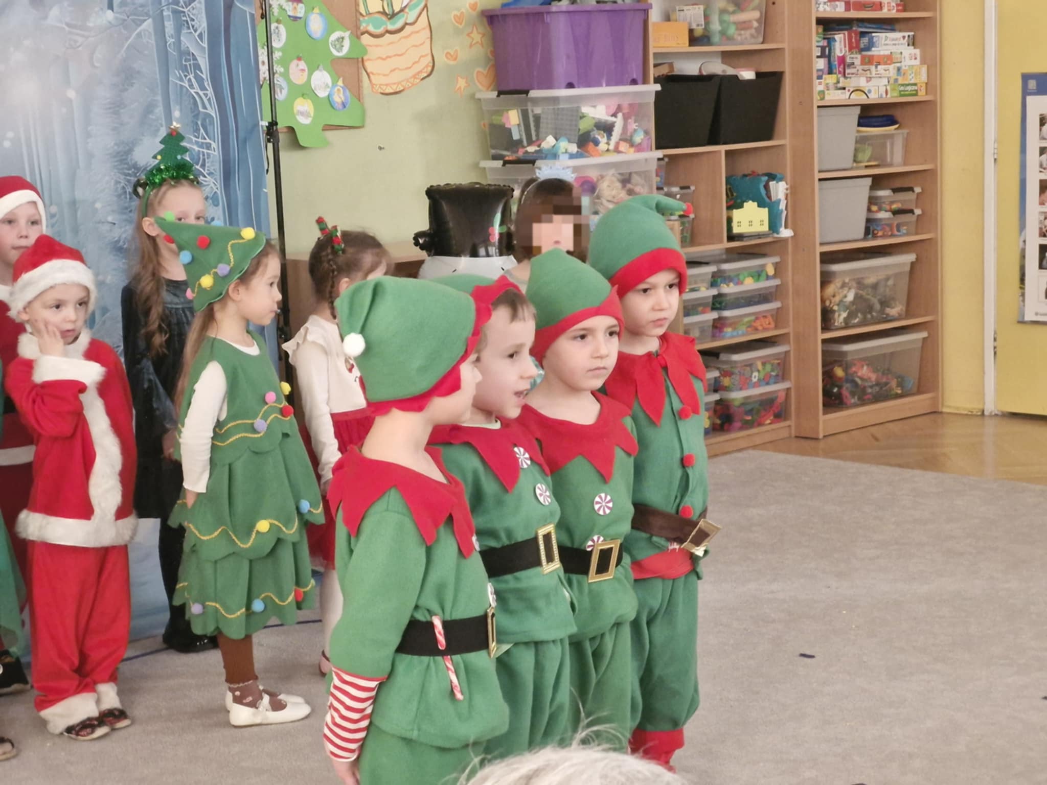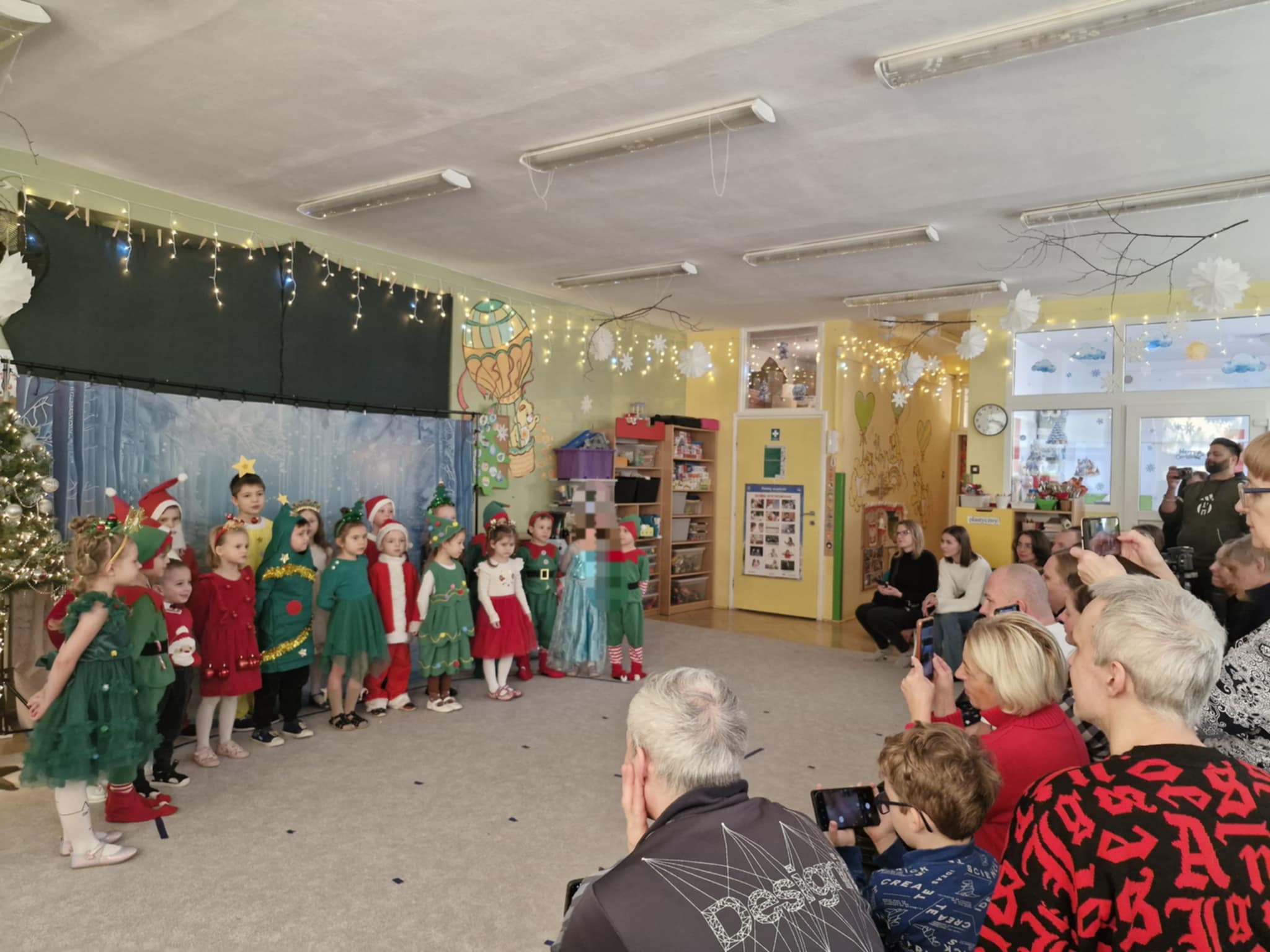 Dzieci z grupy „Jeżyki” zaprezentowały swoim rodzinom wyjątkowy spektakl mikołajkowy, pełen magii i świątecznego nastroju. Przedszkolaki z ogromnym zaangażowaniem recytowały wiersze, śpiewały piosenki oraz zaprezentowały piękny, wzruszający taniec z lampionami, który na długo pozostanie w pamięci wszystkich obecnych. Na zakończenie czekała na dzieci miła niespodzianka – mikołajkowe prezenty, które zostawił dla nich Święty Mikołaj. Dzieci przygotowały również dla swoich bliskich własnoręcznie wykonane zawieszki na choinkę z masy solnej, ozdobione ich fotografią – wyjątkowy i bardzo osobisty upominek. To było niezwykle ciepłe, rodzinne i pełne wzruszeń spotkanie, które wprowadziło wszystkich w prawdziwie świąteczny nastrój.