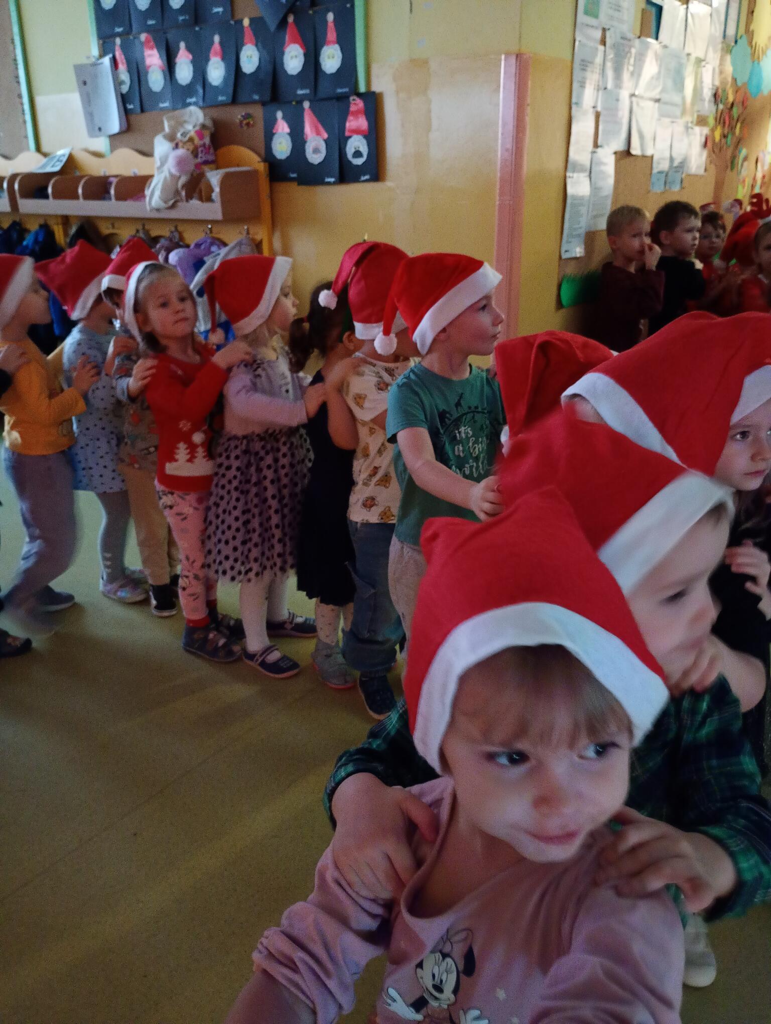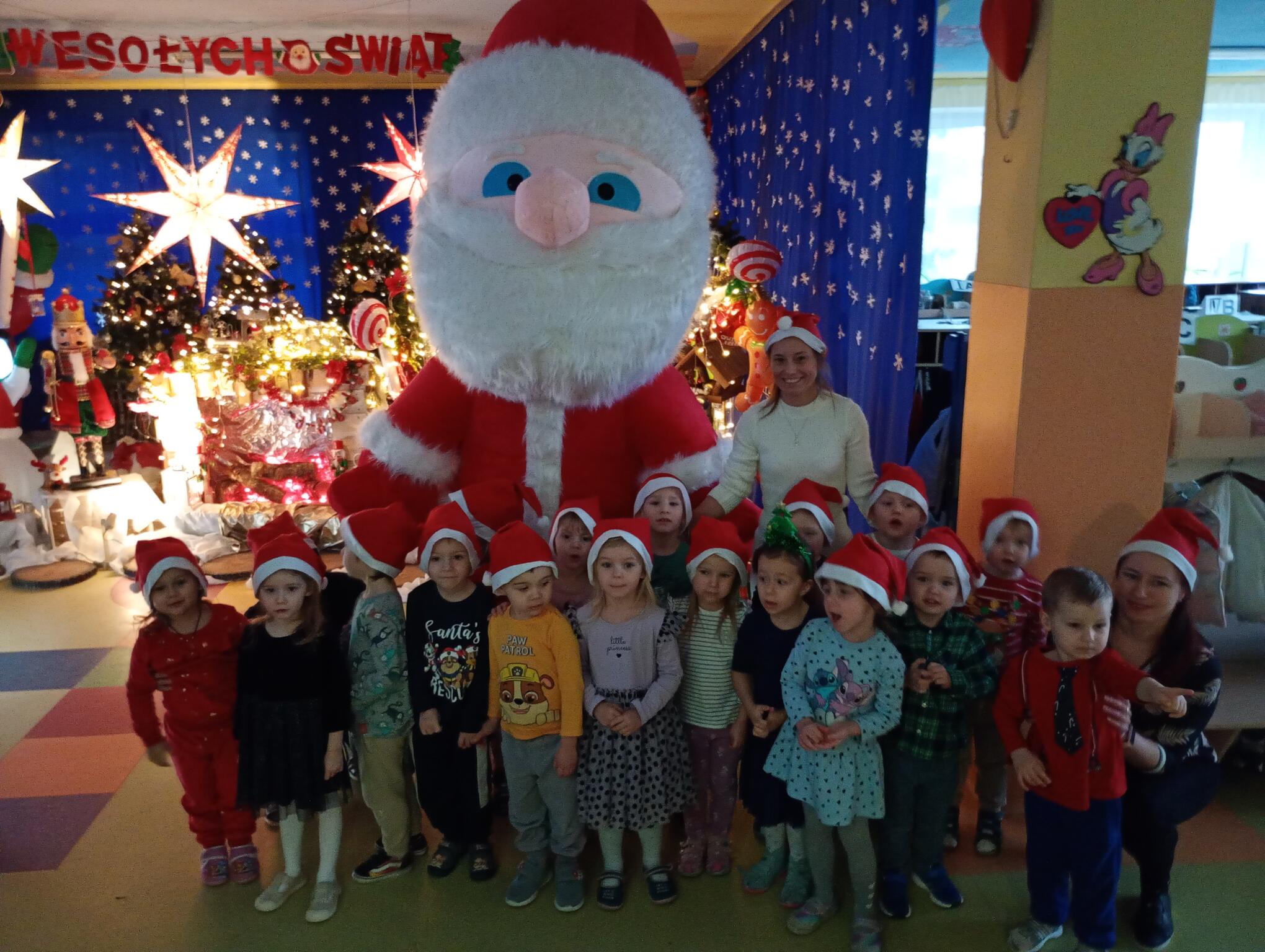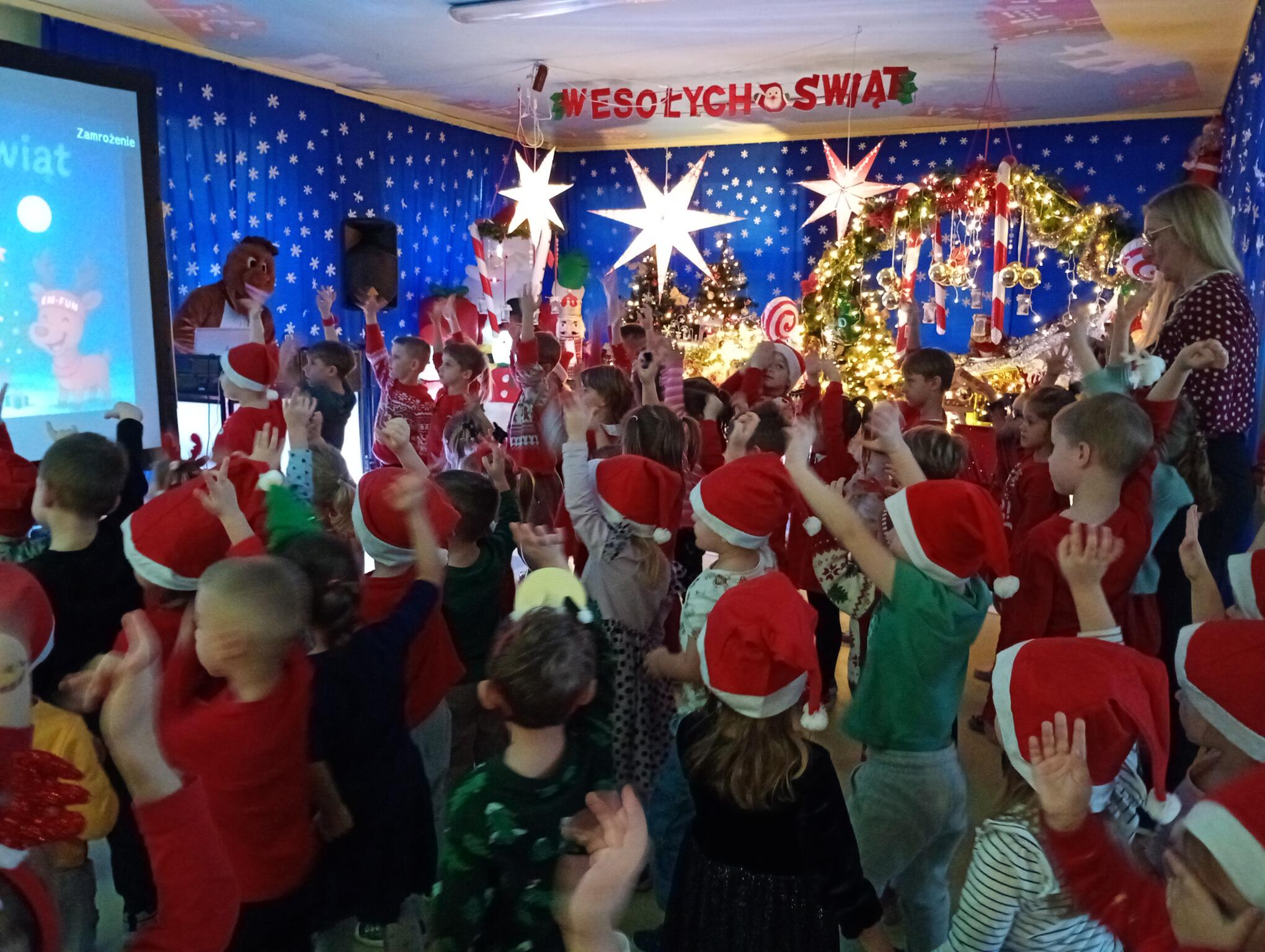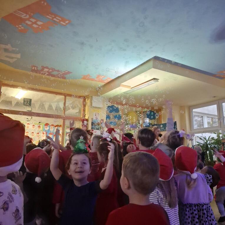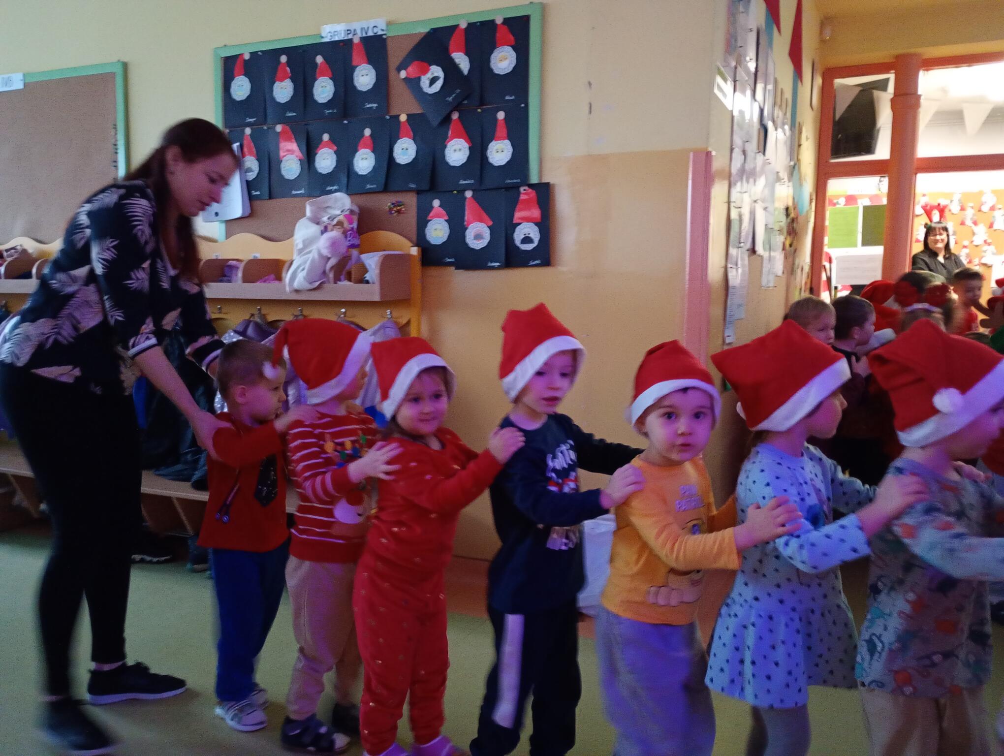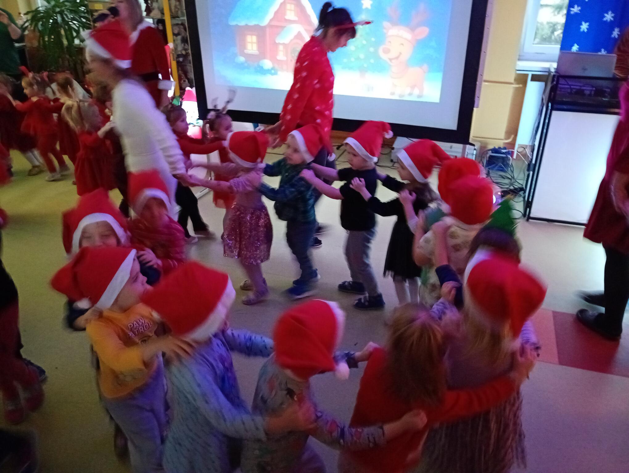 Dzisiaj odwiedził wszystkie dzieci w przedszkolu Renifer, który był taki pomysłowy i przebojowy, że rozkręcił przedszkolną świąteczną imprezę, na której przedszkolaki bawiły się wyśmienicie. Nie zabrakło tańca, intencjonalnego i swobodnego ruchu oraz wspólnych zabaw przy muzyce. W połowie imprezy dzieci odwiedził Mikołaj, z którym każda grupa zrobiła sobie zdjęcie. Na koniec zrobiło się bajkowo, bo nad głowami przedszkolaków mieniły się wirujące w powietrzu mydlane bańki.