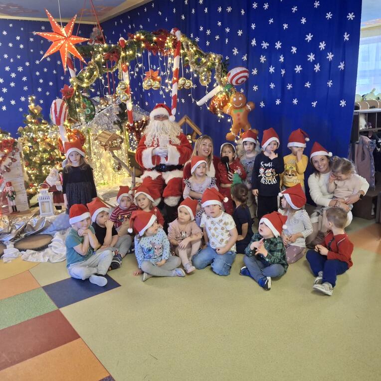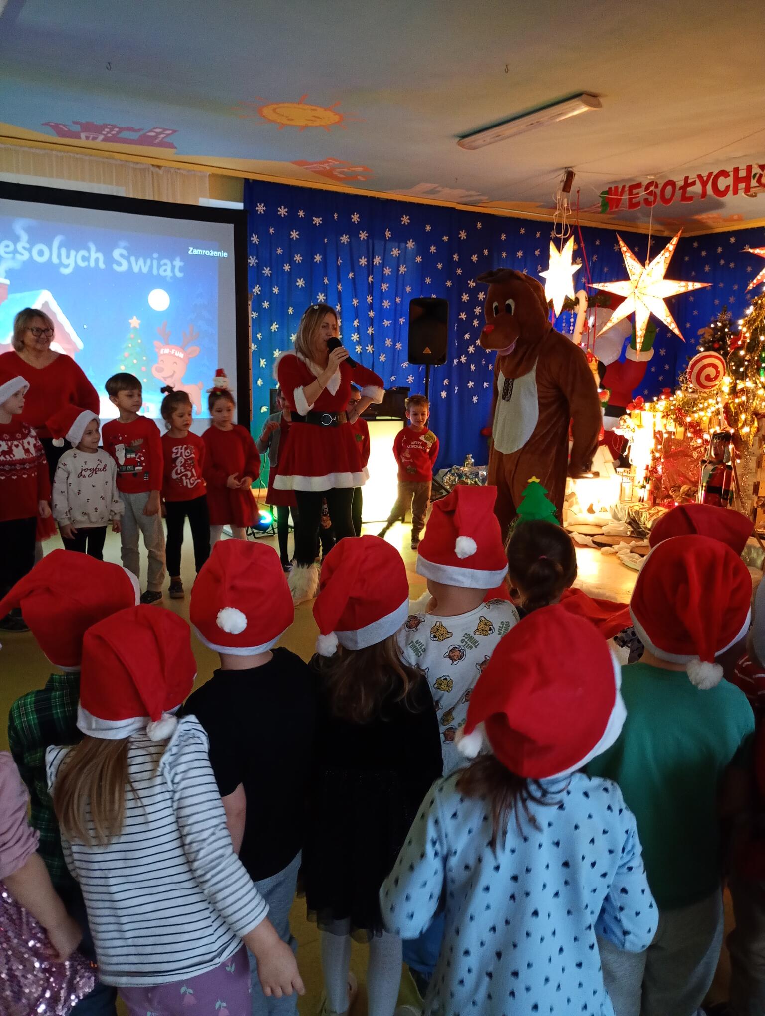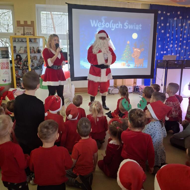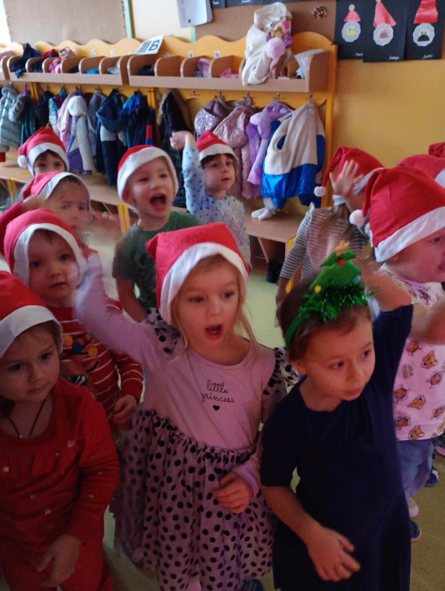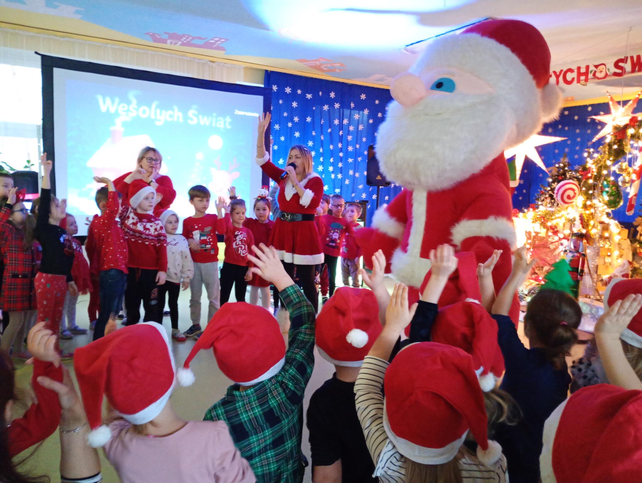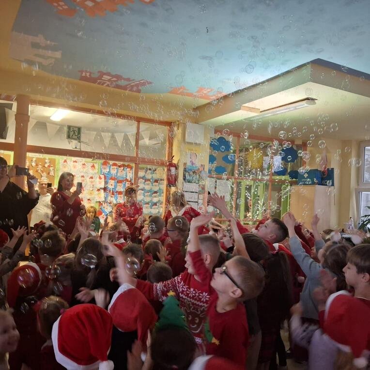 Dzisiaj odwiedził wszystkie dzieci w przedszkolu Renifer, który był taki pomysłowy i przebojowy, że rozkręcił przedszkolną świąteczną imprezę, na której przedszkolaki bawiły się wyśmienicie. Nie zabrakło tańca, intencjonalnego i swobodnego ruchu oraz wspólnych zabaw przy muzyce. W połowie imprezy dzieci odwiedził Mikołaj, z którym każda grupa zrobiła sobie zdjęcie. Na koniec zrobiło się bajkowo, bo nad głowami przedszkolaków mieniły się wirujące w powietrzu mydlane bańki.