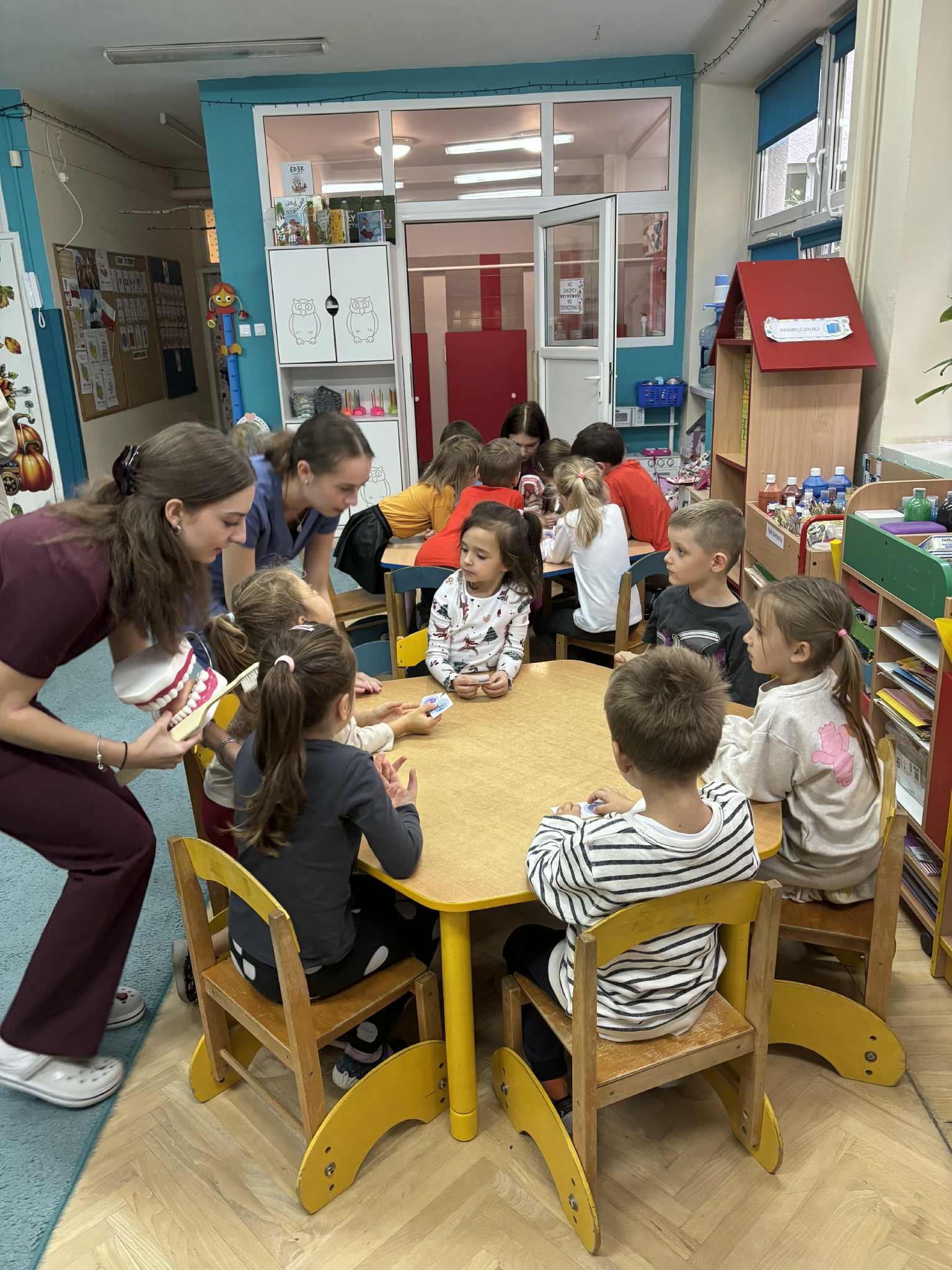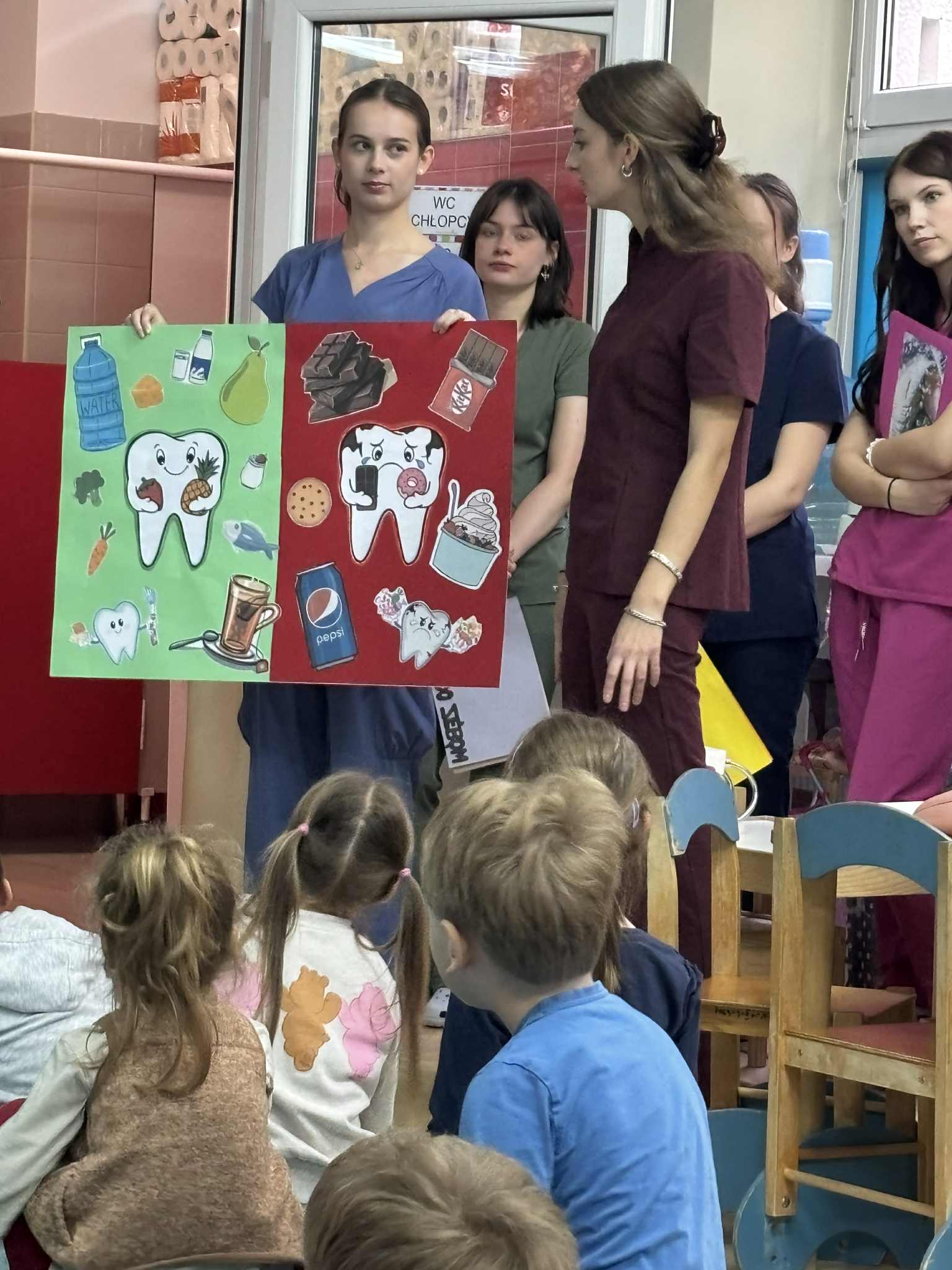 Podczas spotkania dzieci obejrzały plakaty przedstawiające budowę zębów oraz dowiedziały się, co szkodzi zębom, a co pomaga utrzymać je w dobrej kondycji. Wolontariusze wyjaśnili, dlaczego warto ograniczać słodycze, unikać napojów gazowanych i regularnie odwiedzać dentystę.