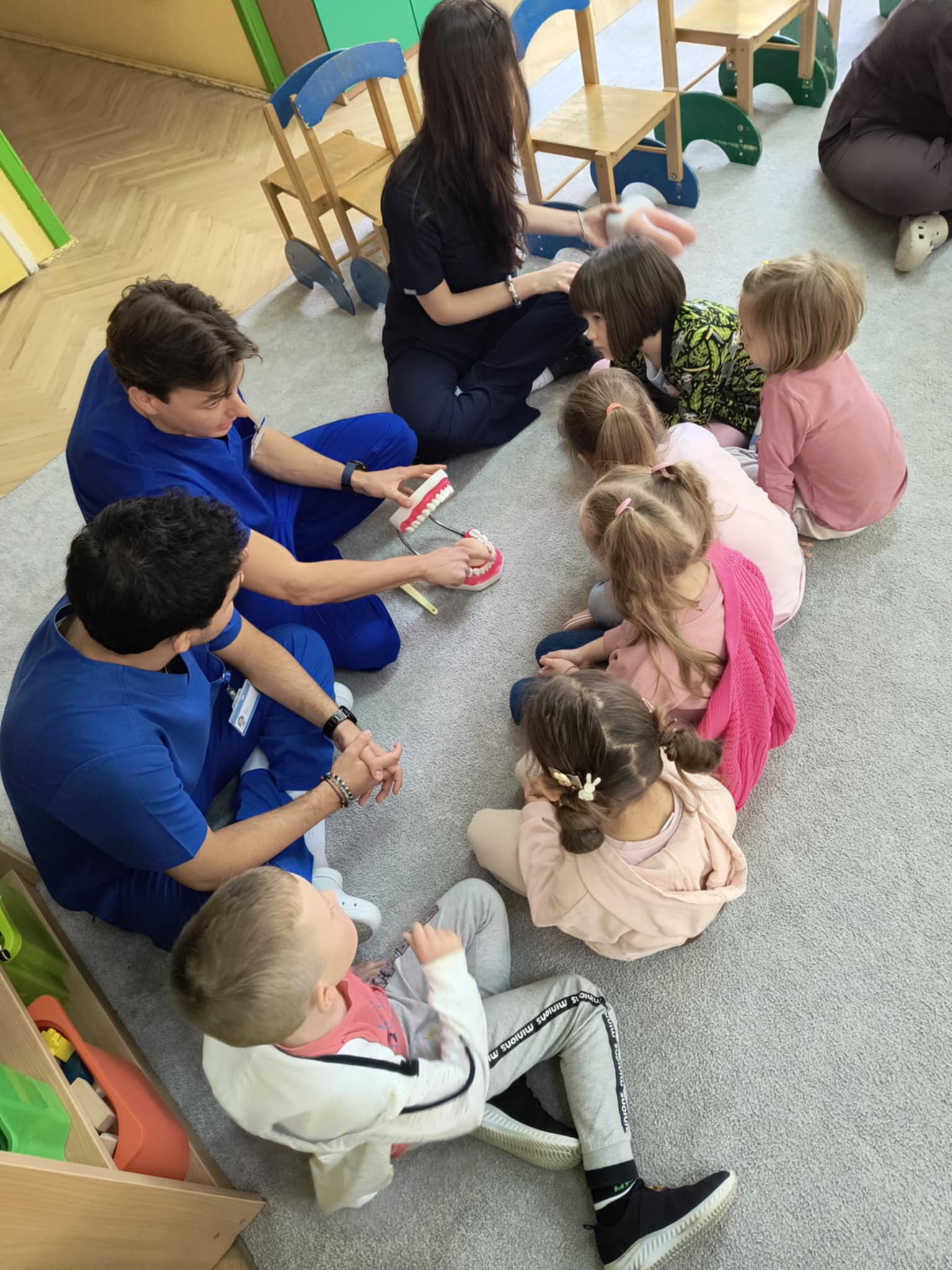 Nasze przedszkole odwiedzili studenci stomatologii, którzy przygotowali ciekawą prelekcję o zębach i higienie jamy ustnej. Dzieci dowiedziały się, jak zbudowane są zęby, jak o nie dbać, co warto jeść, a czego lepiej unikać, aby mieć zdrowy uśmiech. Studenci pokazali także, że nie trzeba bać się stomatologa to przyjaciel, który pomaga, by nasze ząbki były czyste i zdrowe. Dzieci mogły poćwiczyć prawidłowe mycie zębów na modelach oraz otrzymały małe upominki. To była bardzo pouczająca i radosna wizyta, która z pewnością zachęciła wszystkich do codziennego dbania o swój uśmiech