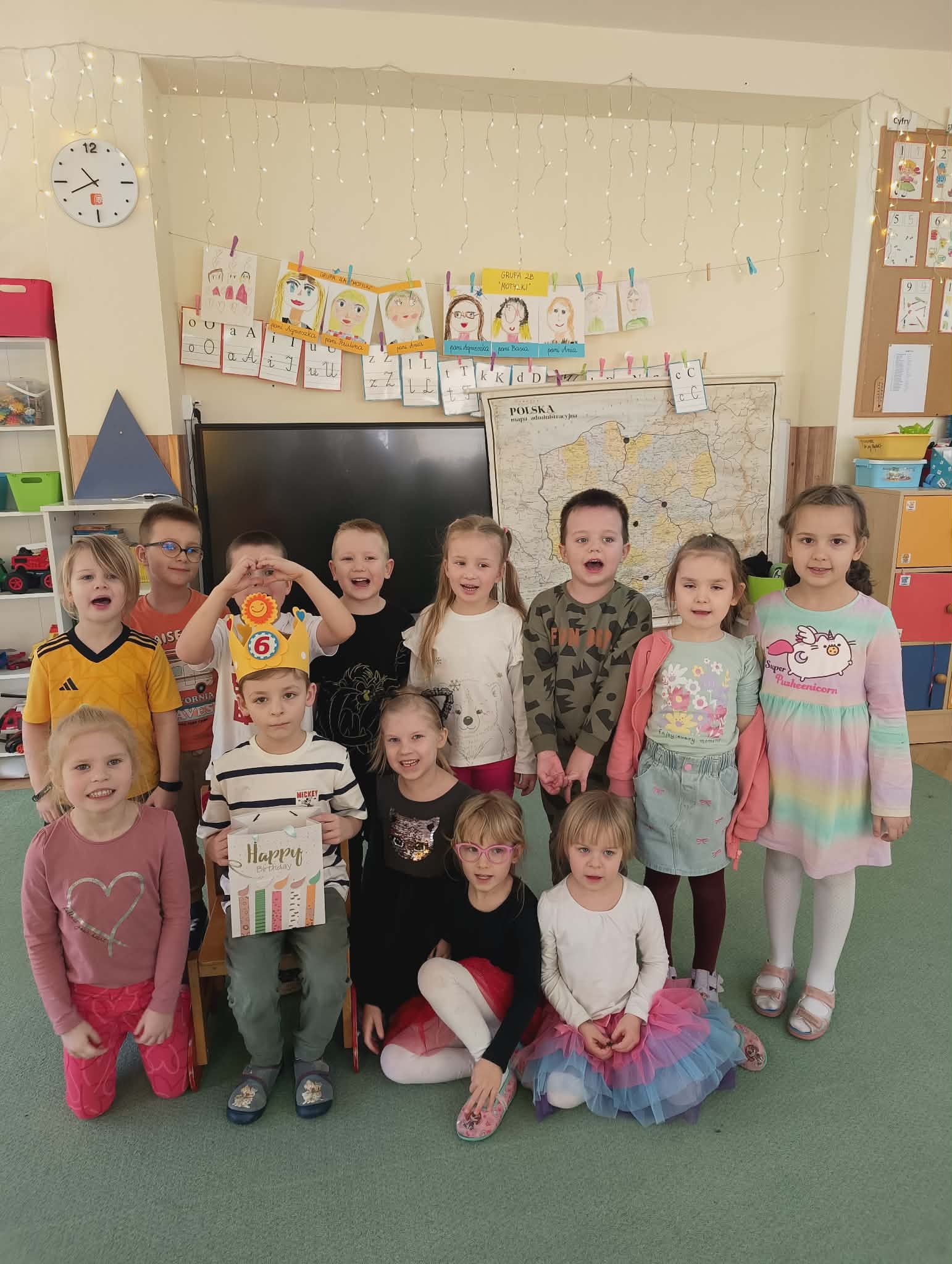 Świętowaliśmy dziś urodziny Natana. Dzieci wspólnie śpiewały tradycyjne „Sto lat”, składając jubilatowi najserdeczniejsze życzenia. Natan z radością częstował wszystkich przedszkolaków cukierkami, dzieląc się słodkościami ze swoimi kolegami i koleżankami.