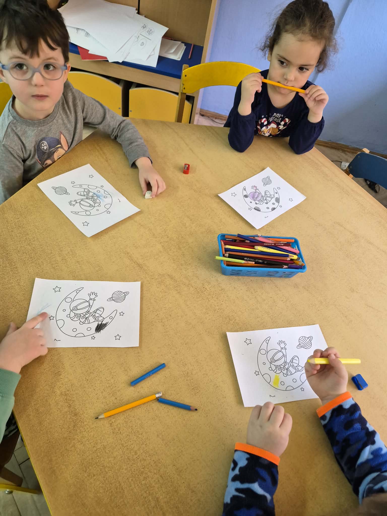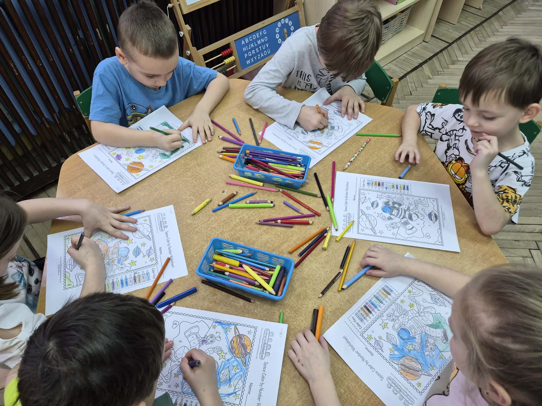 W pierwszym tygodniu Lutego wyruszyliśmy w kosmos. Obejrzeliśmy wiele ciekawych filmów i zdjęć. Widzieliśmy start rakiety i porównywaliśmy wielkości różnych ciał niebieskich. Utrwaliliśmy naszą wiedzę na temat układu słonecznego i nauczyliśmy się piosenki "We' re going to the moon!". Poznane słownictwo: rocket ship - rakieta,astronaut - astronauta,planet - planeta,stars - gwiazdy,solar system - układ słoneczny,moon - księżyc, sun - słońce,satellite - satelita.