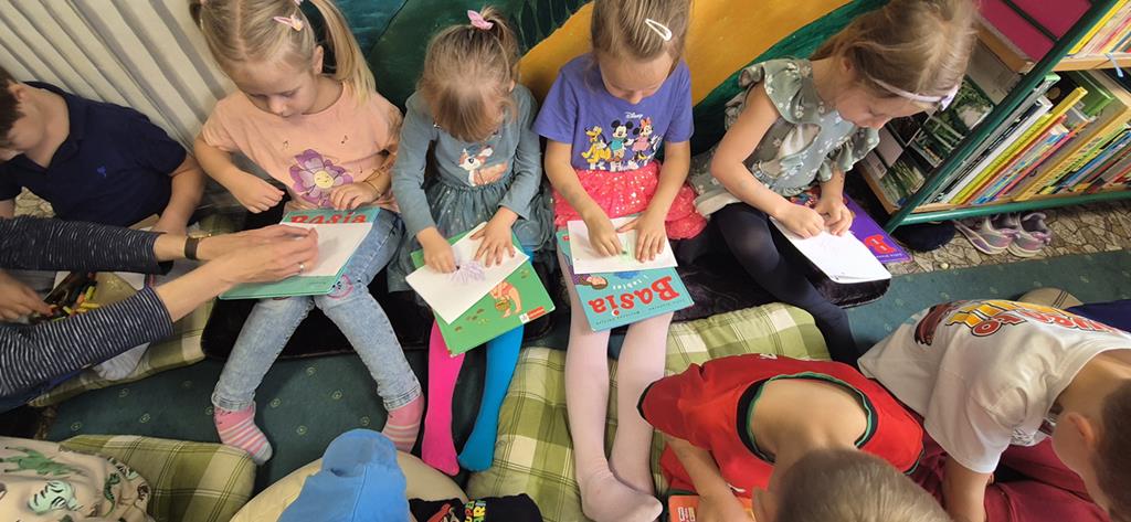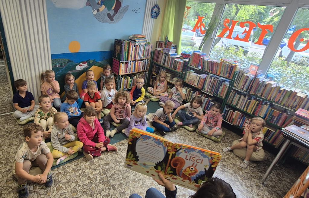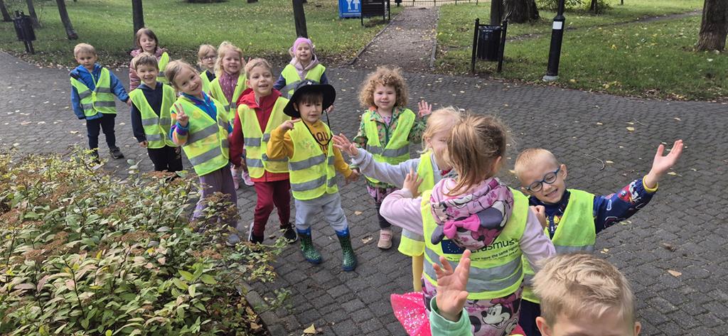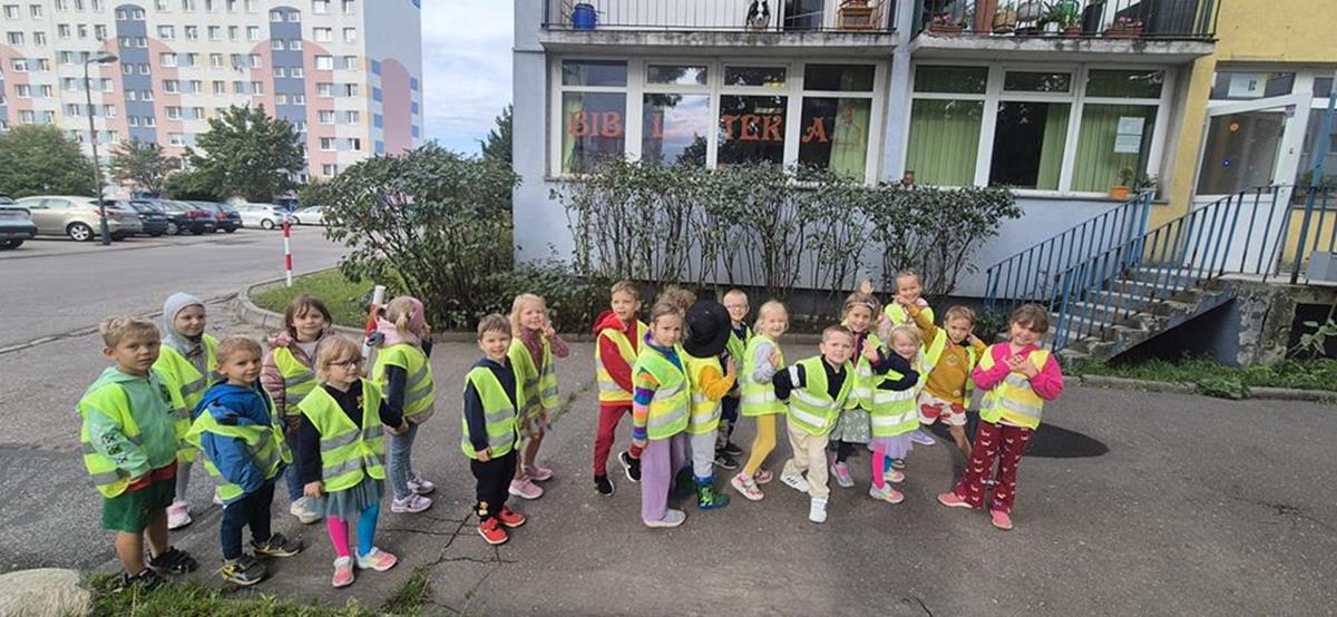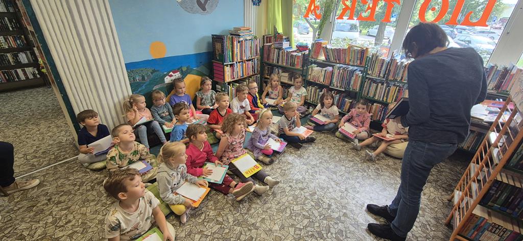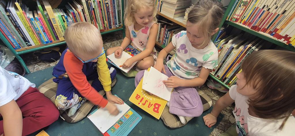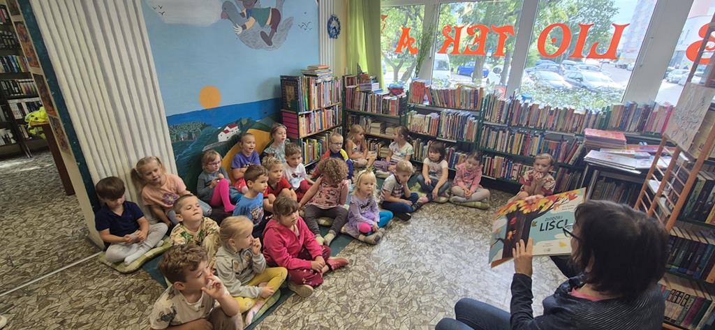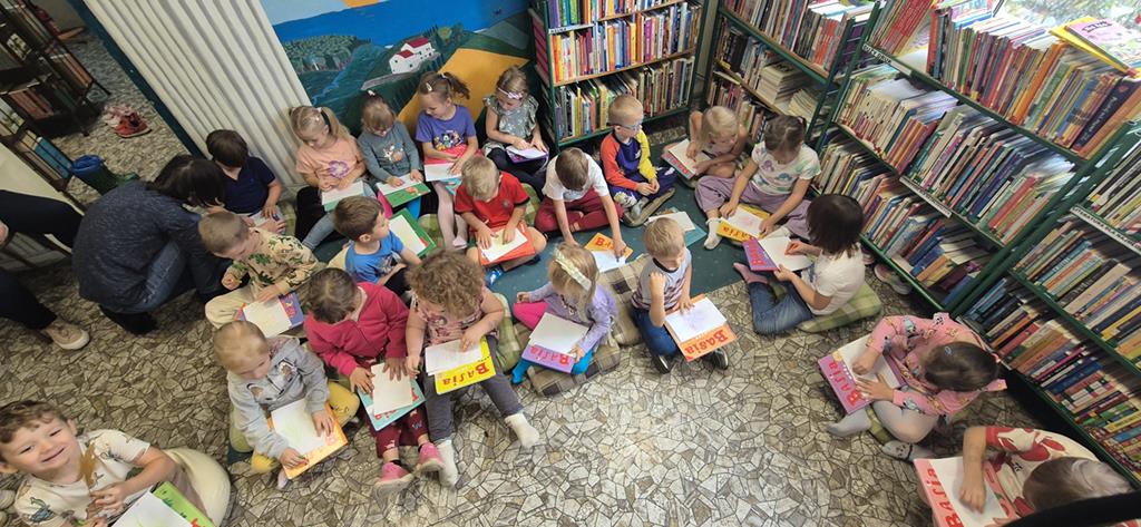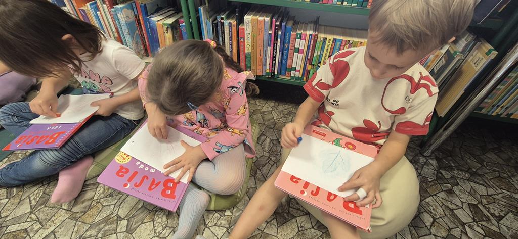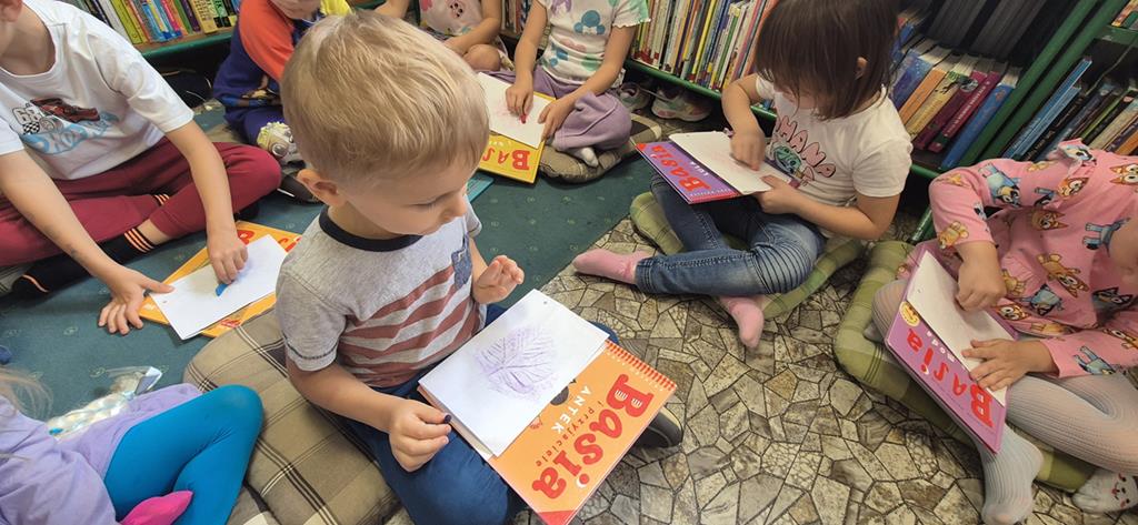 W nowym roku szkolnym wybraliśmy się na pierwszą pieszą wycieczkę do biblioteki. Dzieci poznały książkę „Złodziej liści”, a następnie wykonały zadanie przygotowane przez panią bibliotekarkę – tworzyły prace plastyczne techniką frottage, odbijając liście kredką świecową.
