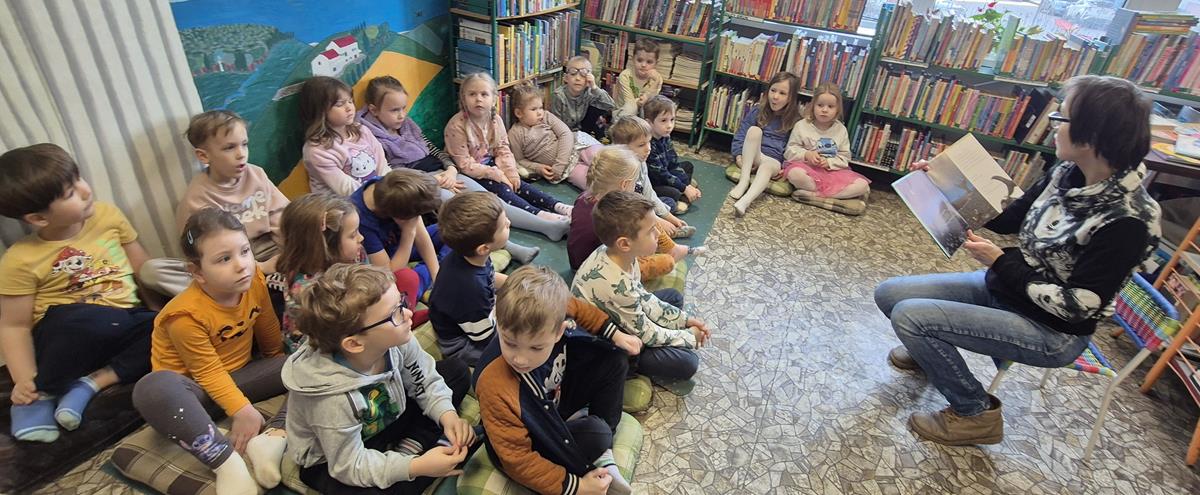 4 marcanasza grupa wybrała się na pieszą wycieczkę do Biblioteki Miejskiej. Podczas spotkania nasza ulubiona Pani bibliotekarka zapoznała dzieci z bohaterami książki „Ślimak i wieloryb”.