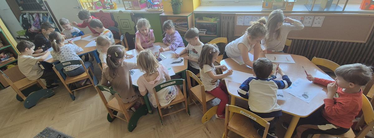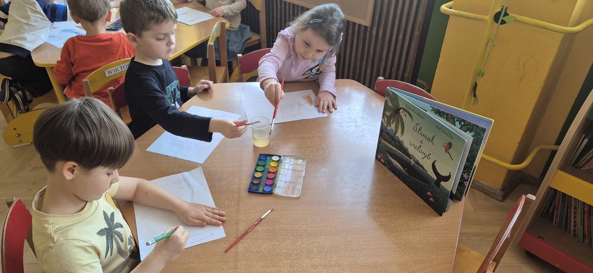 Następnego dnia w przedszkolu dzieci malowały farbami wybranego bohateraz poznanej historii. Powstały piękne prace, które zostały zaprezentowane na wystawie w bibliotece, gdzie można je podziwiać.