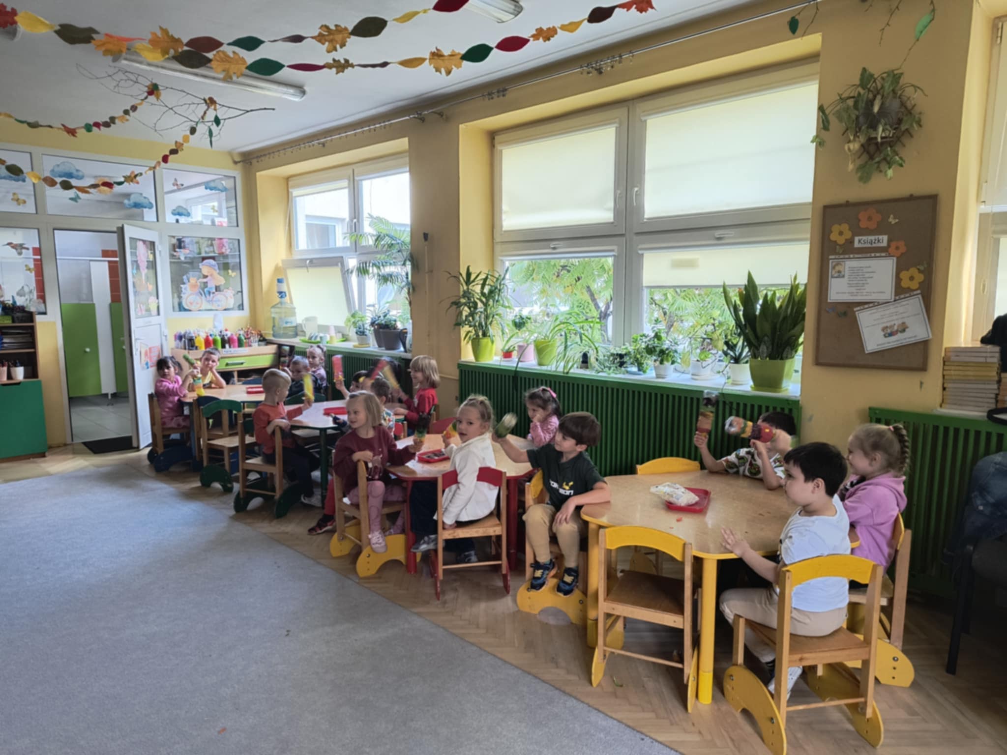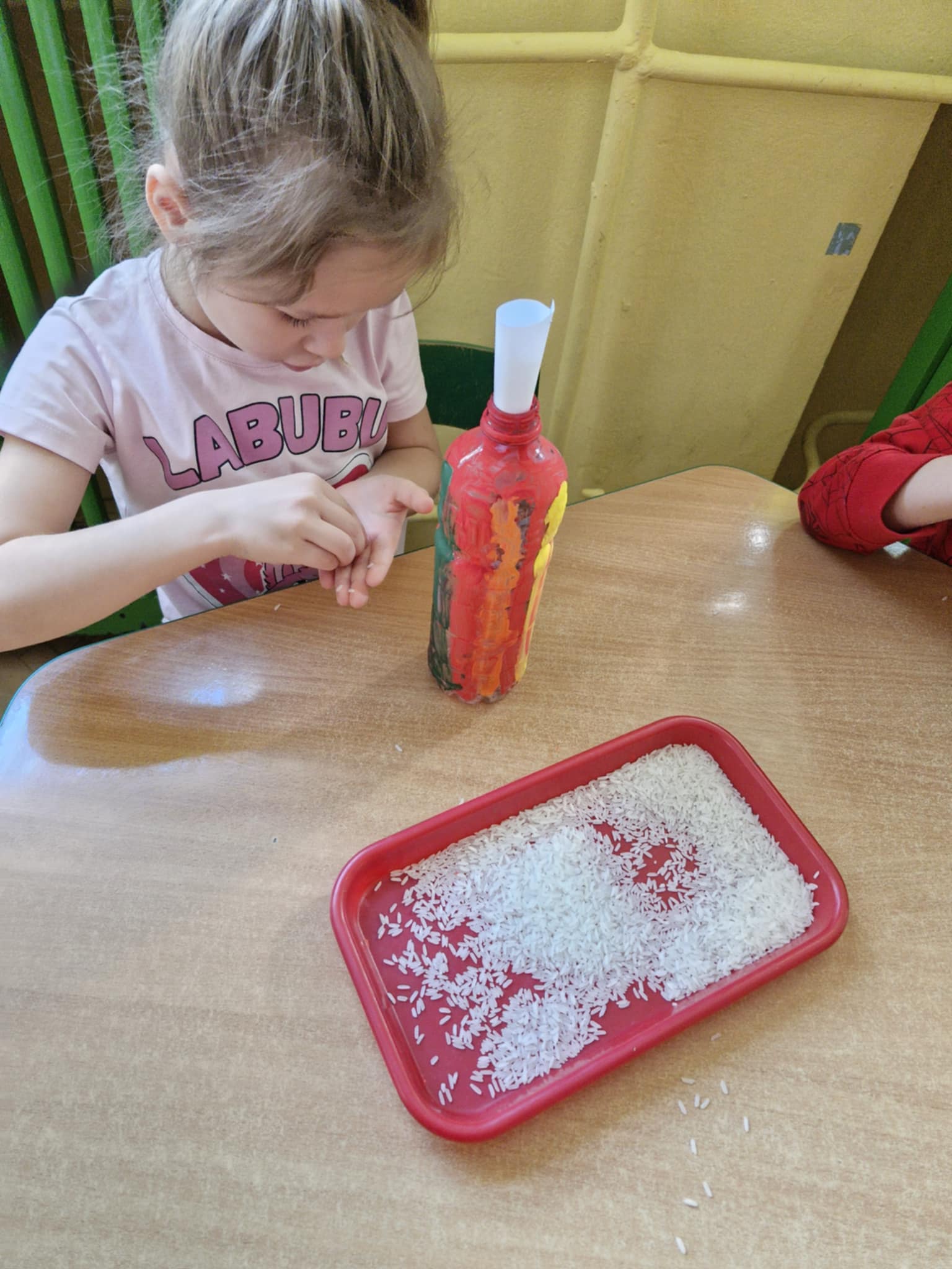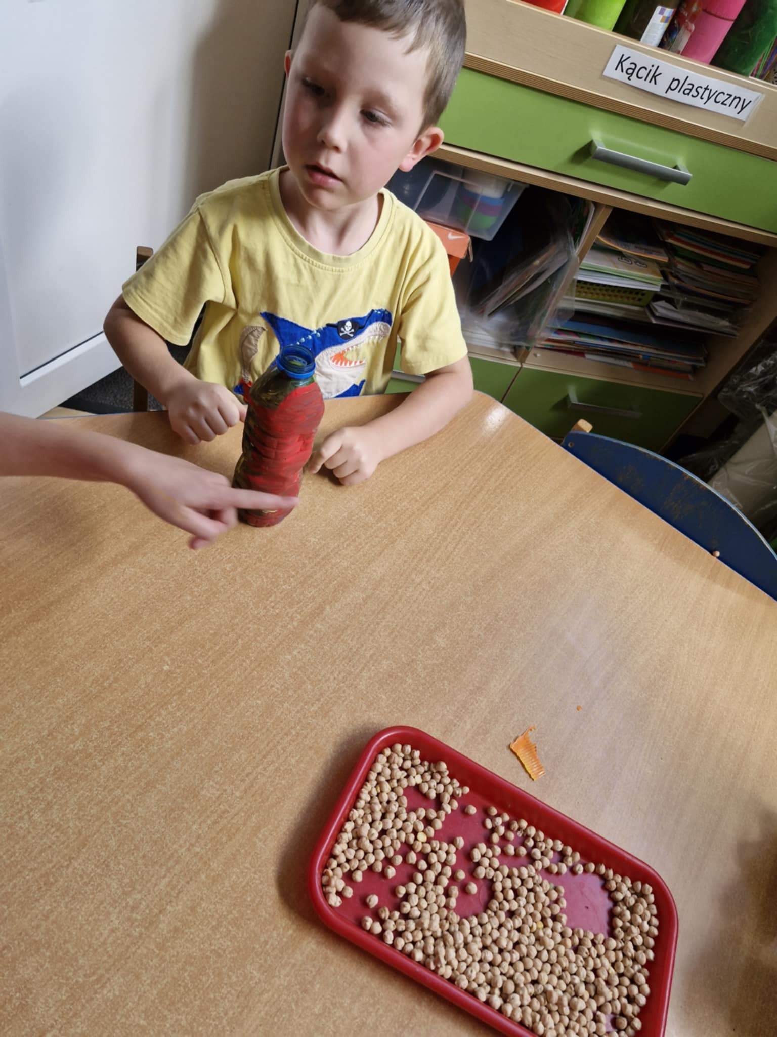 W grupie „Jeżyków” odbyły się kreatywne zajęcia muzyczno–plastyczne, podczas których dzieci wykorzystały butelki po wodzie. Najpierw pomalowały je w jesiennych barwach, a następnie do środka wsypały różne produkty spożywcze tj.ryż, kaszę, soczewicę czy mannę. W ten sposób powstały niezwykłe instrumenty perkusyjne. Przy dźwiękach melodii „La Raspa” dzieci wspólnie zagrały własnoręcznie wykonanymi grzechotkami. Zajęcia pokazały, że muzykę można tworzyć na wiele sposobów, nawet z rzeczy, które na co dzień znajdują się w kuchni. To była wspaniała lekcja kreatywności, rytmu i dobrej zabawy.