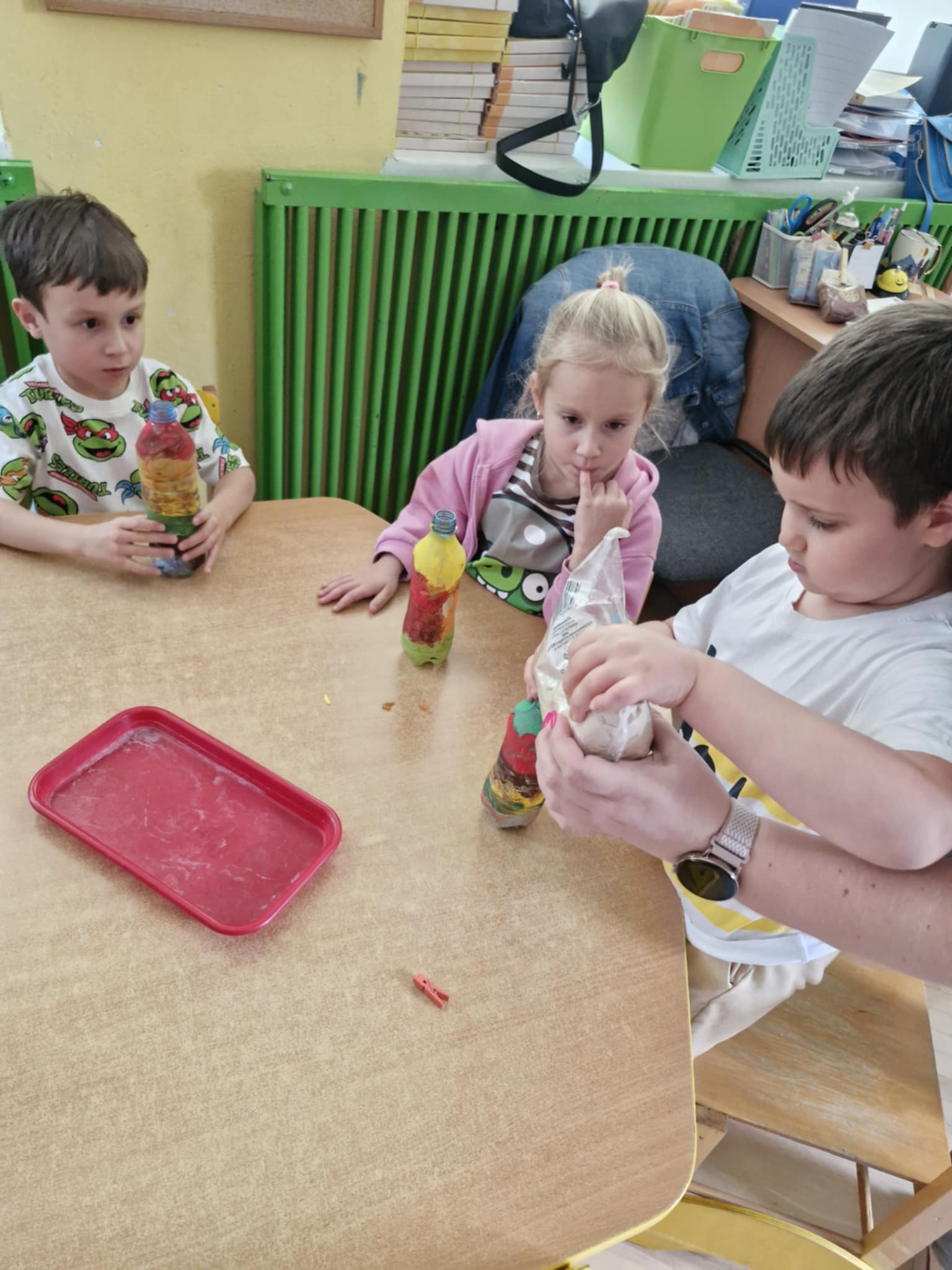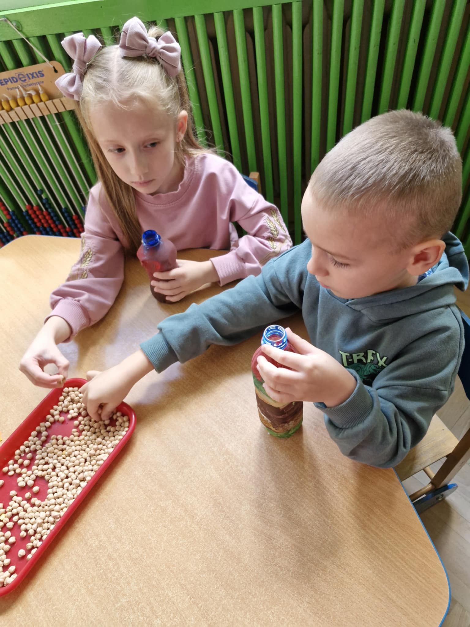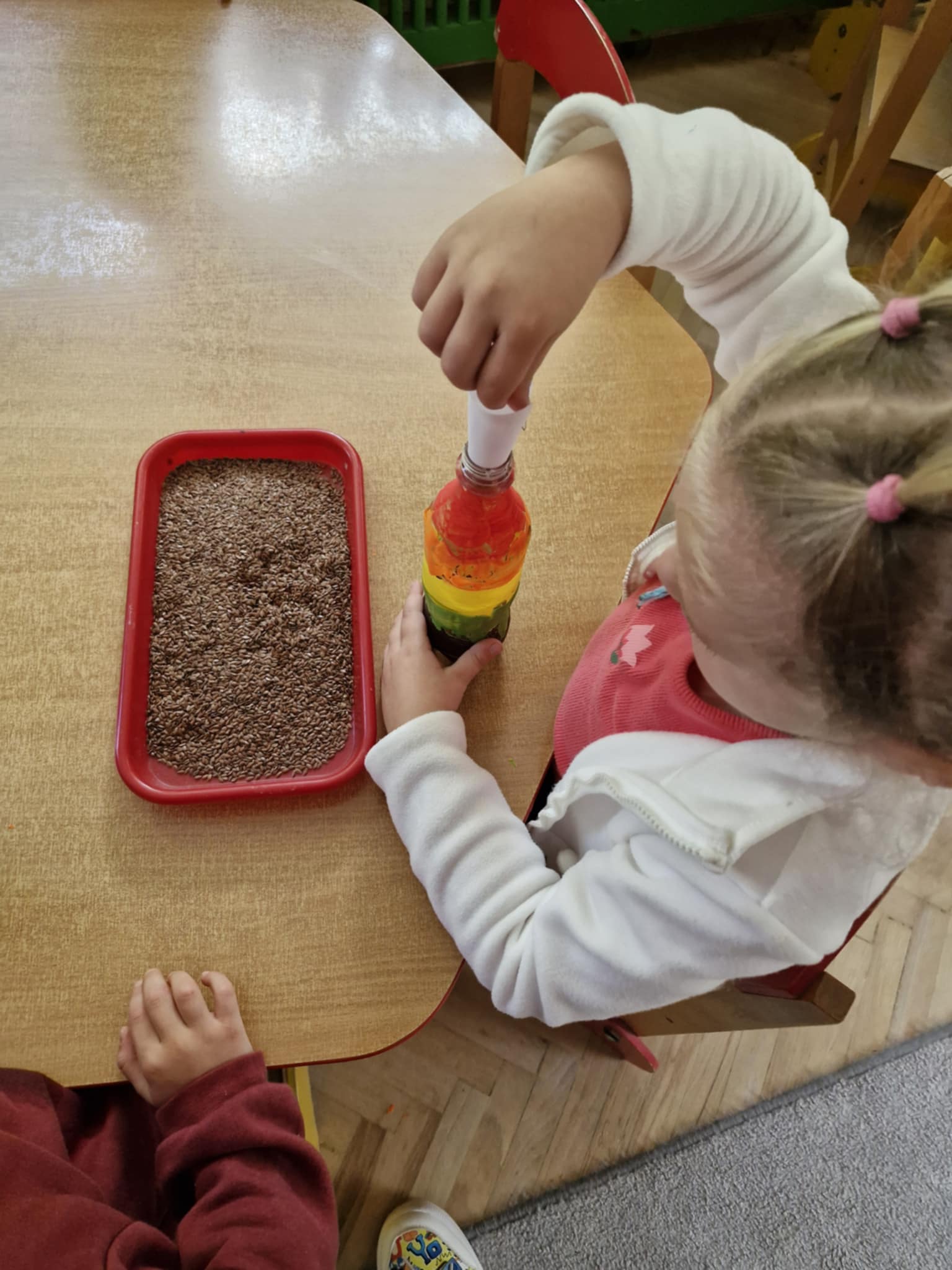 W grupie „Jeżyków” odbyły się kreatywne zajęcia muzyczno–plastyczne, podczas których dzieci wykorzystały butelki po wodzie. Najpierw pomalowały je w jesiennych barwach, a następnie do środka wsypały różne produkty spożywcze tj.ryż, kaszę, soczewicę czy mannę. W ten sposób powstały niezwykłe instrumenty perkusyjne. Przy dźwiękach melodii „La Raspa” dzieci wspólnie zagrały własnoręcznie wykonanymi grzechotkami. Zajęcia pokazały, że muzykę można tworzyć na wiele sposobów, nawet z rzeczy, które na co dzień znajdują się w kuchni. To była wspaniała lekcja kreatywności, rytmu i dobrej zabawy.