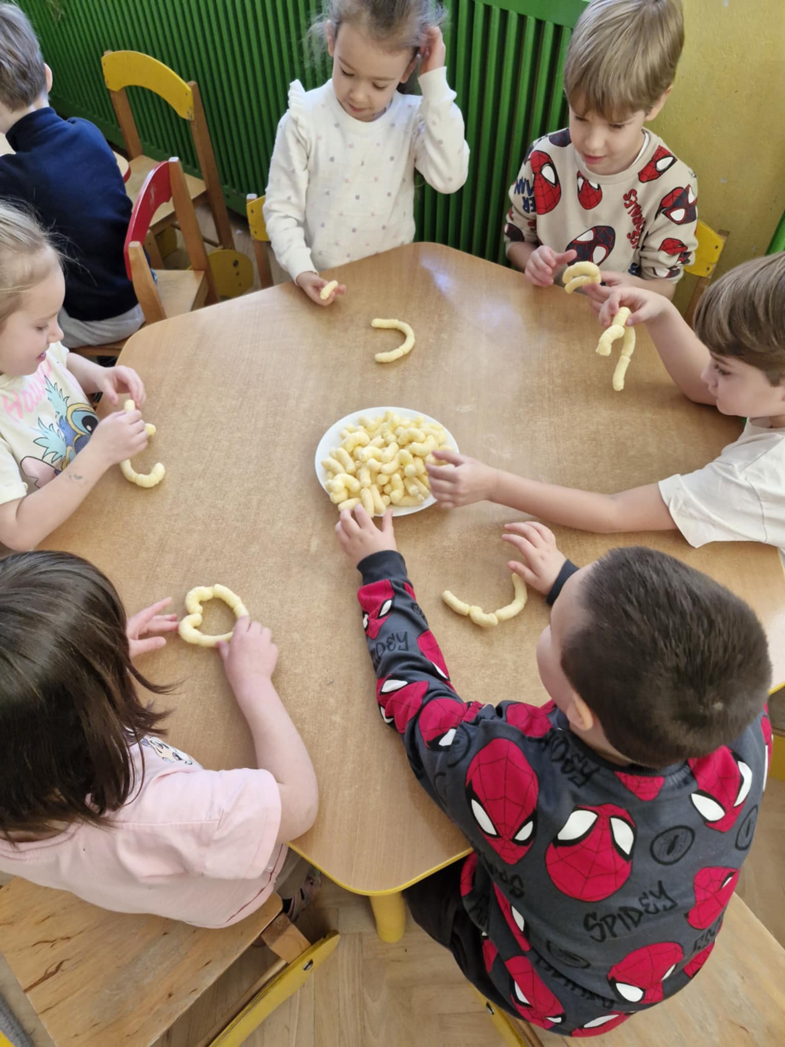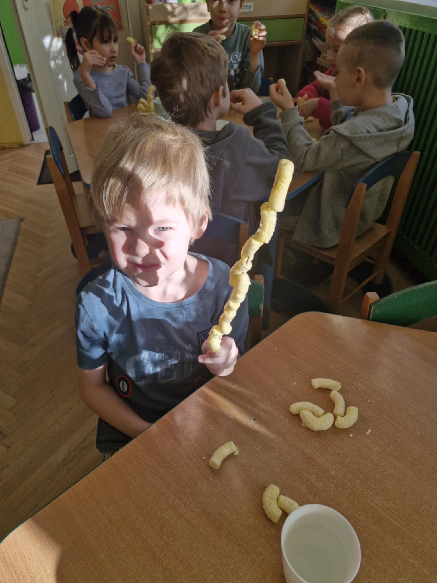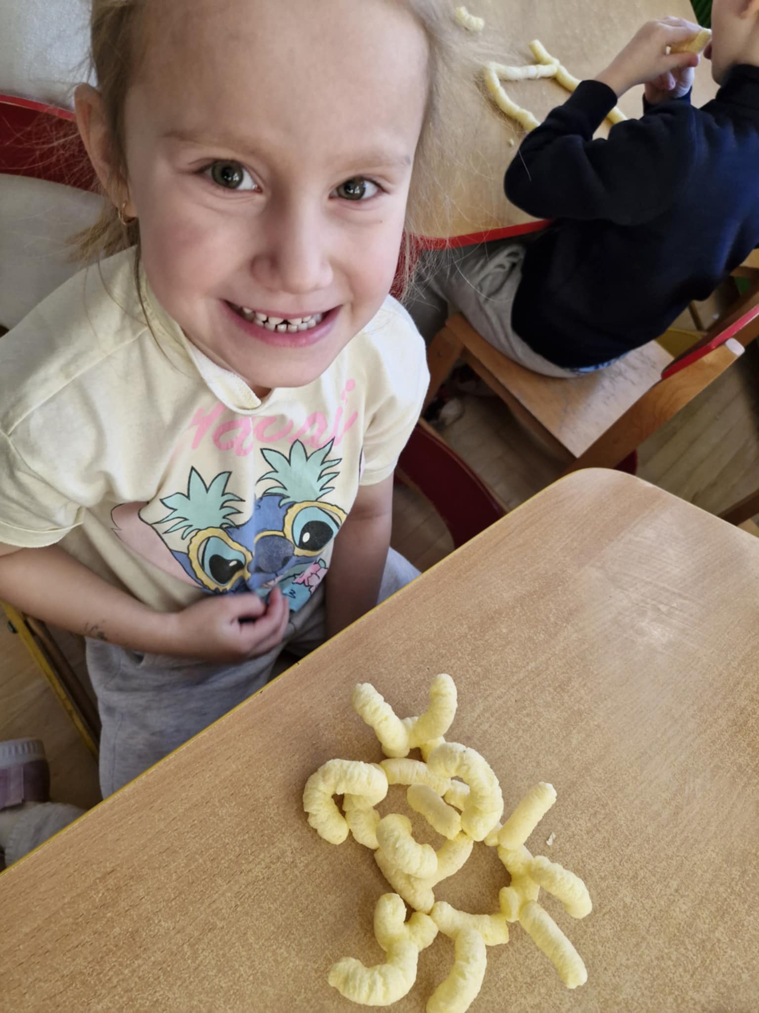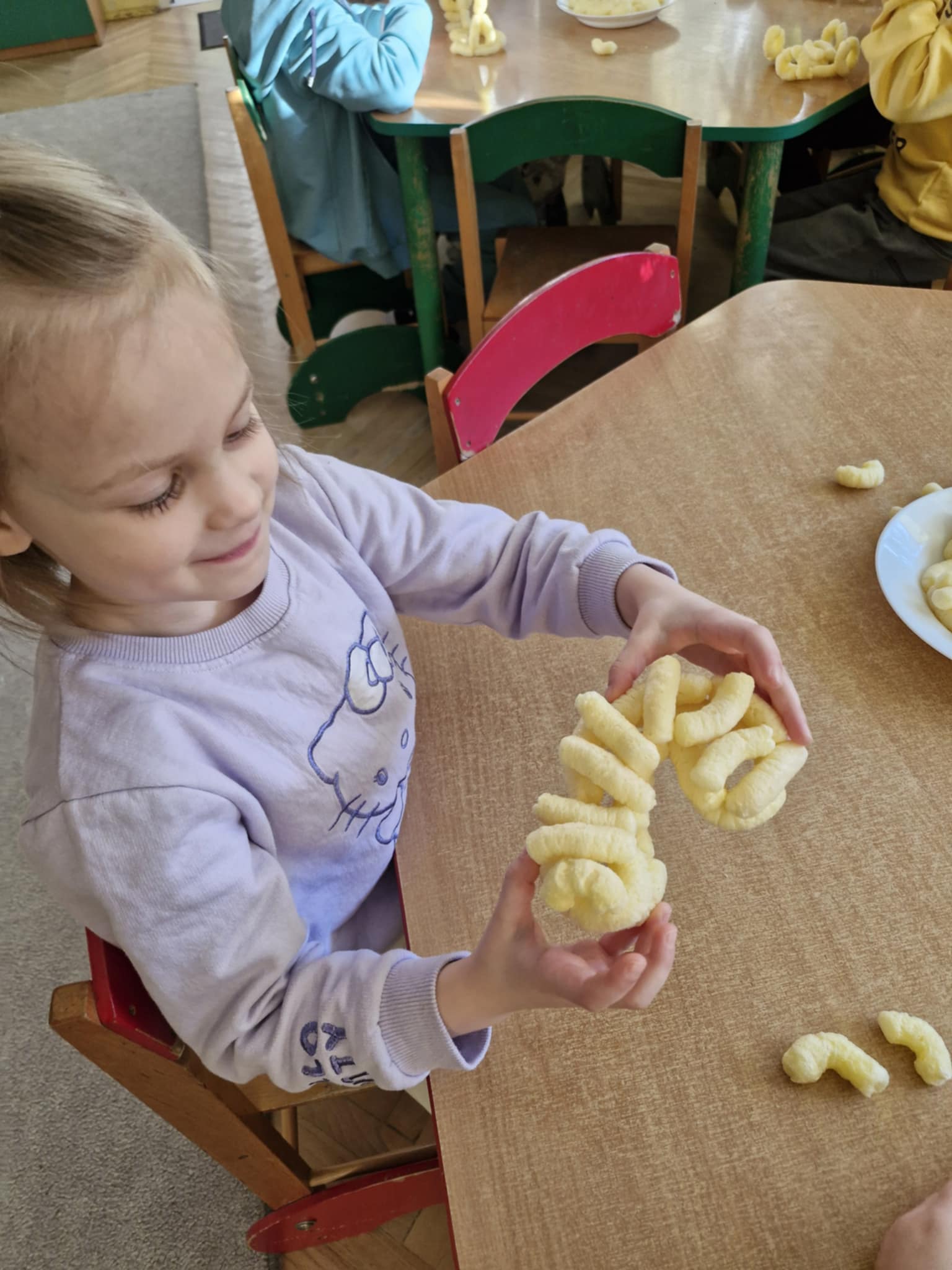 W naszej grupie odbyły się dziś zajęcia sensoryczne, podczas których dzieci tworzyły różne budowle z chrupek kukurydzianych. Było dużo radości, kreatywności i świetnej zabawy. Zajęcia sensoryczne wspierają rozwój wielu ważnych umiejętności. Pomagają rozwijać motorykę małą, koordynację ręka–oko oraz sprawność dłoni. Pobudzają kreatywność, wyobraźnię i uczą planowania działania. Dodatkowo wspierają koncentrację, cierpliwość oraz współpracę w grupie. Takie aktywności pozwalają dzieciom poznawać świat poprzez działanie, dotyk i doświadczenie, co jest bardzo ważne dla ich prawidłowego rozwoju. Zabawy było co nie miara, a radość z jedzenia swoich budowli nie do opisania.