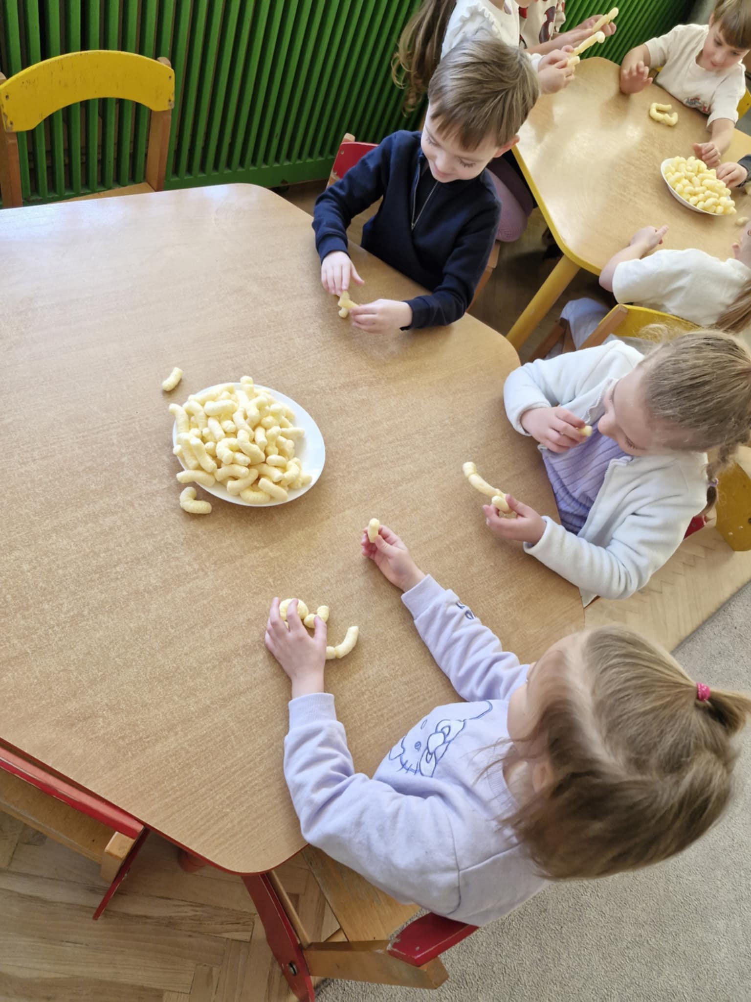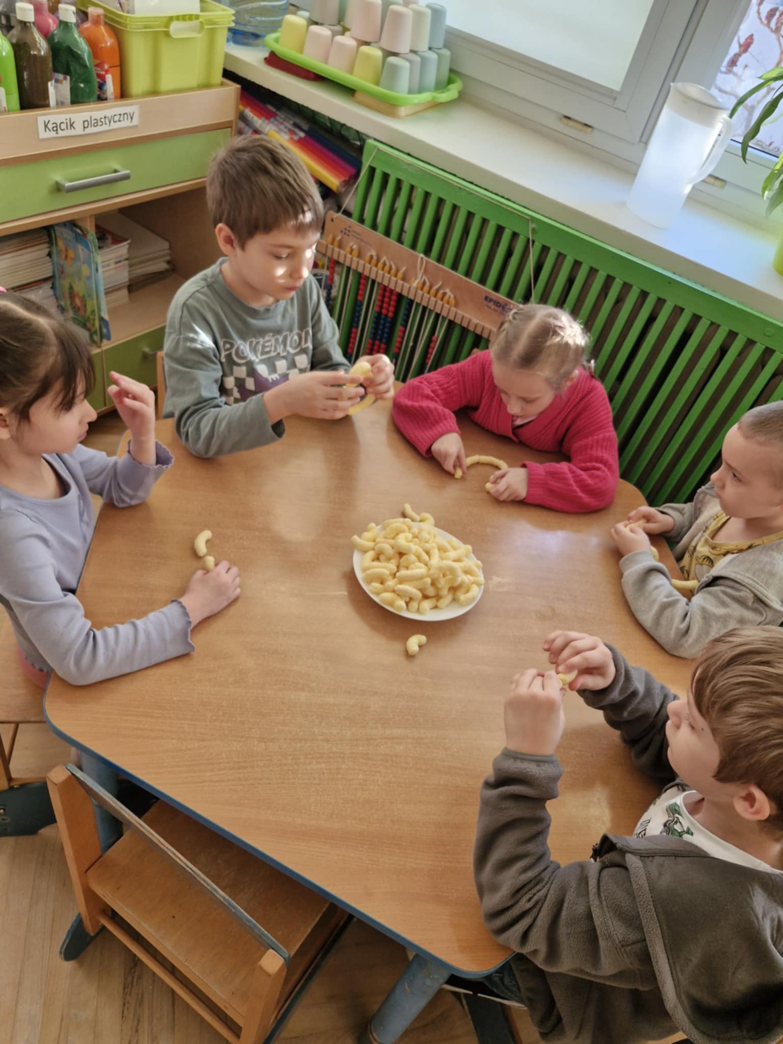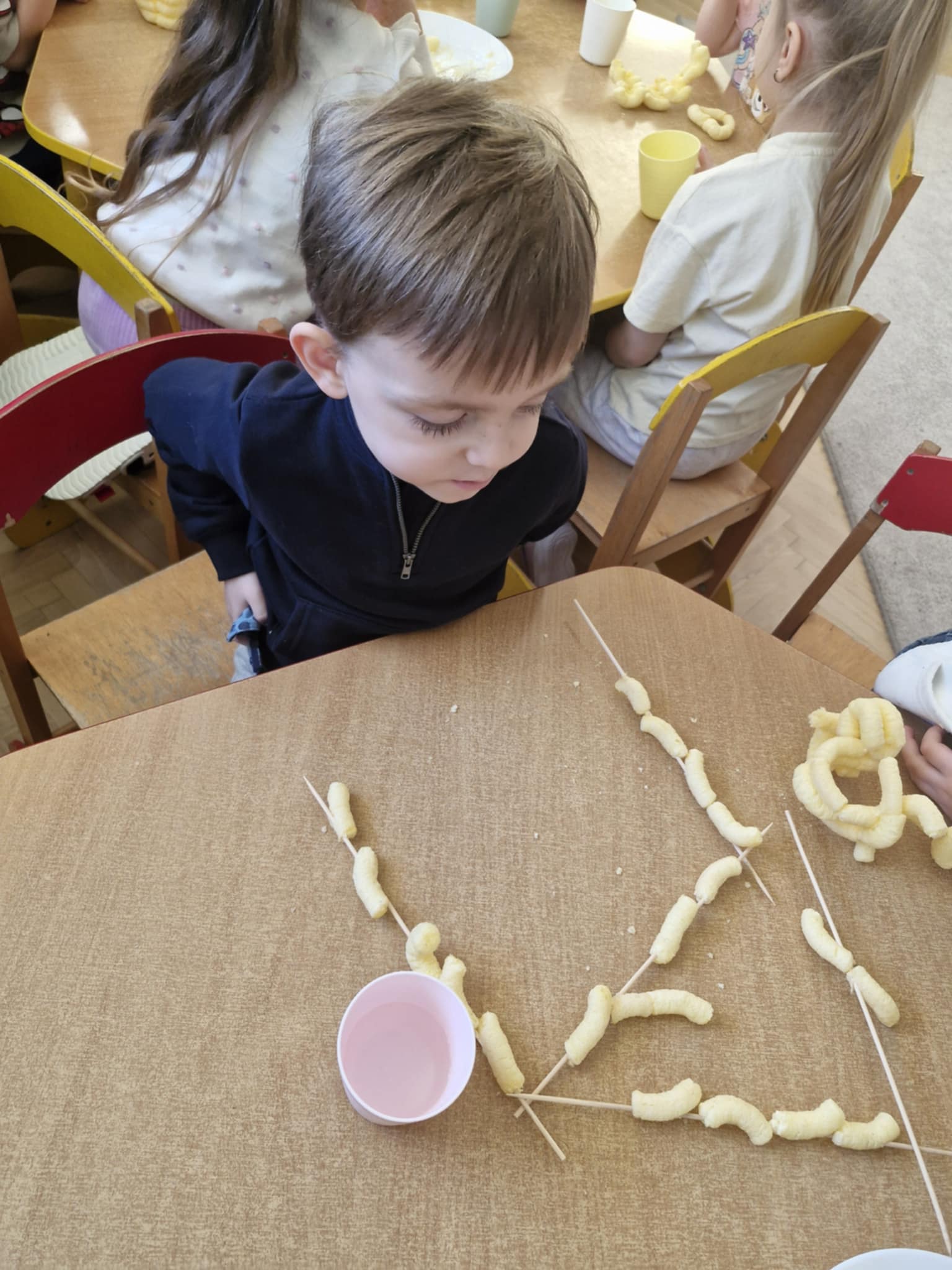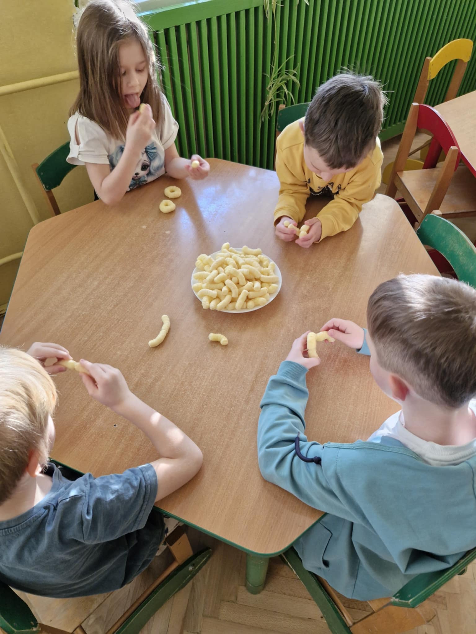 W naszej grupie odbyły się dziś zajęcia sensoryczne, podczas których dzieci tworzyły różne budowle z chrupek kukurydzianych. Było dużo radości, kreatywności i świetnej zabawy. Zajęcia sensoryczne wspierają rozwój wielu ważnych umiejętności. Pomagają rozwijać motorykę małą, koordynację ręka–oko oraz sprawność dłoni. Pobudzają kreatywność, wyobraźnię i uczą planowania działania. Dodatkowo wspierają koncentrację, cierpliwość oraz współpracę w grupie. Takie aktywności pozwalają dzieciom poznawać świat poprzez działanie, dotyk i doświadczenie, co jest bardzo ważne dla ich prawidłowego rozwoju. Zabawy było co nie miara, a radość z jedzenia swoich budowli nie do opisania.