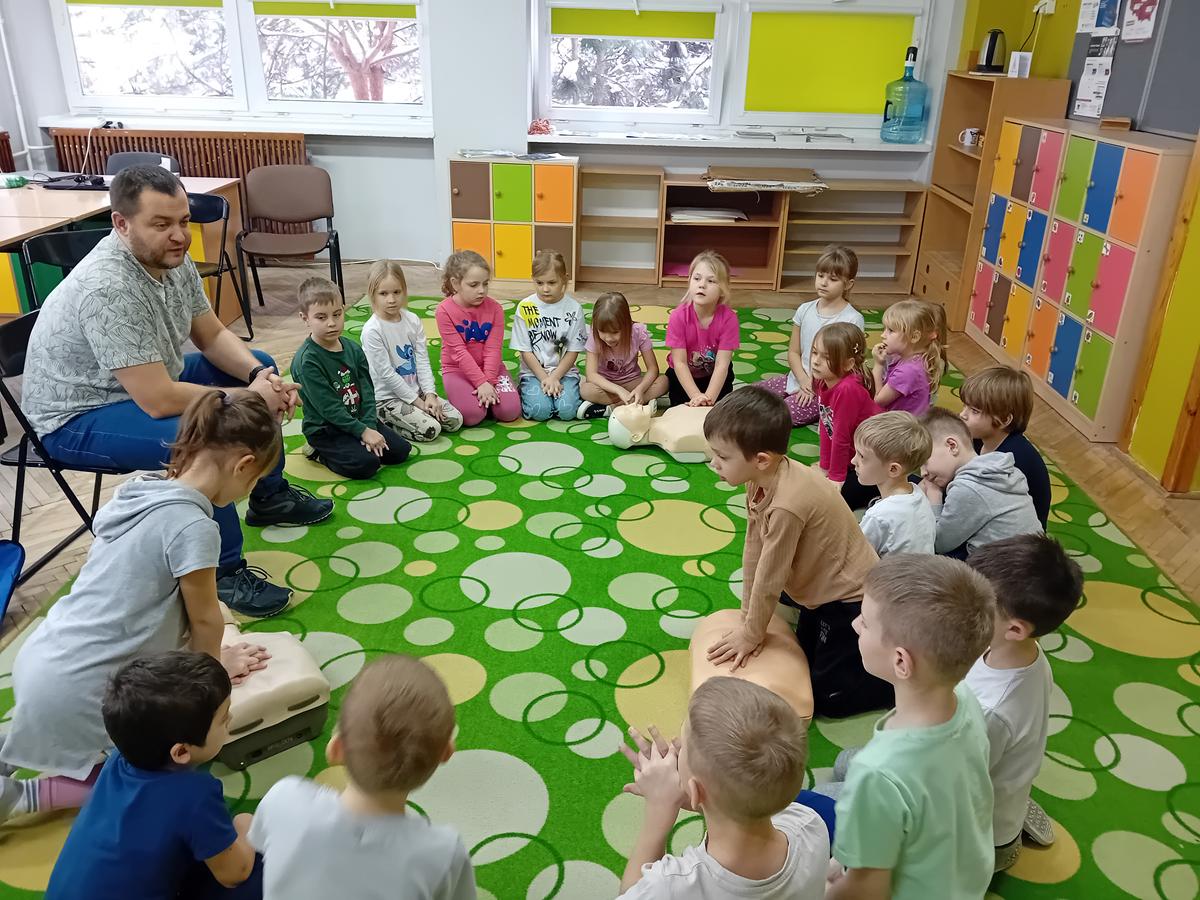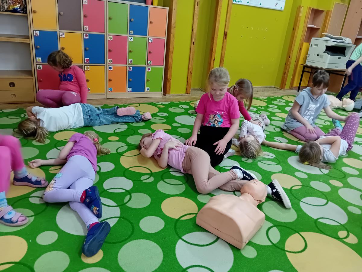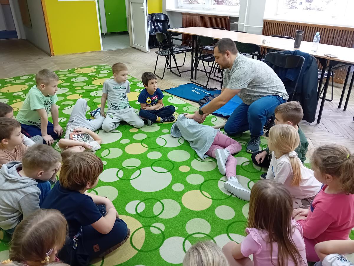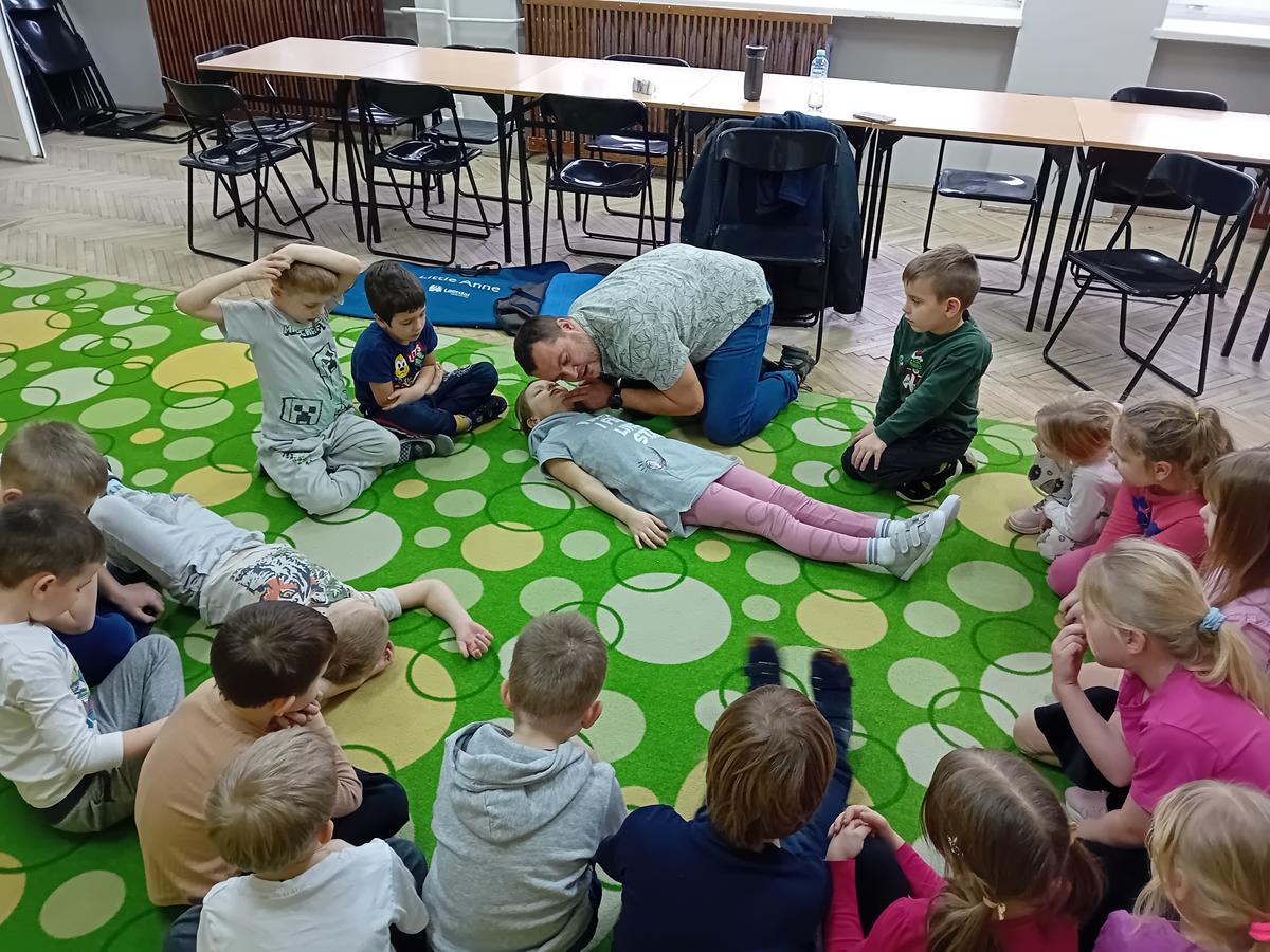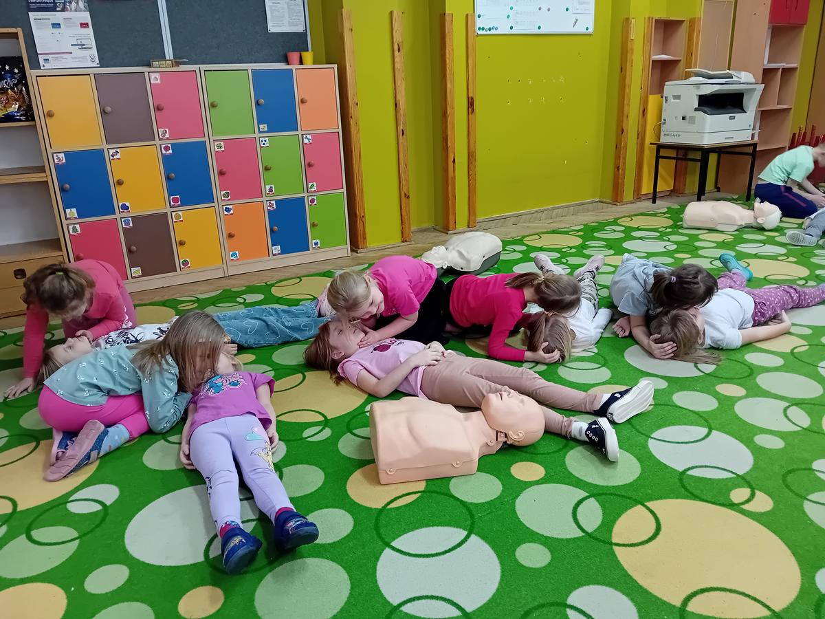 W czasie warsztatów z ratownikiem medycznym przypomnieliśmy sobie najważniejszą wiedzę dotyczącą pierwszej pomocy. Ćwiczyliśmy pozycję „boczną ustaloną”, masaż serca na fantomach oraz numery alarmowe.