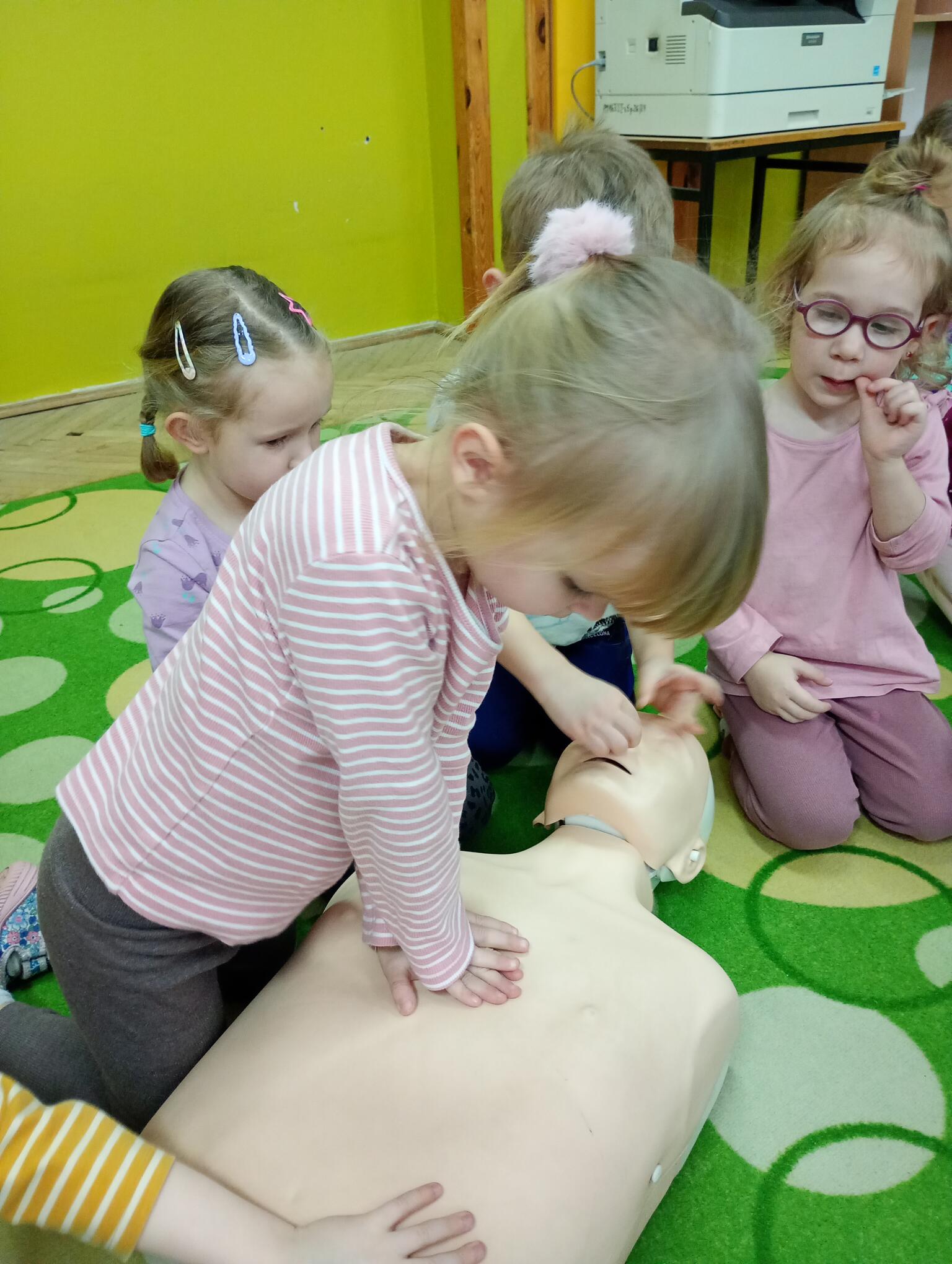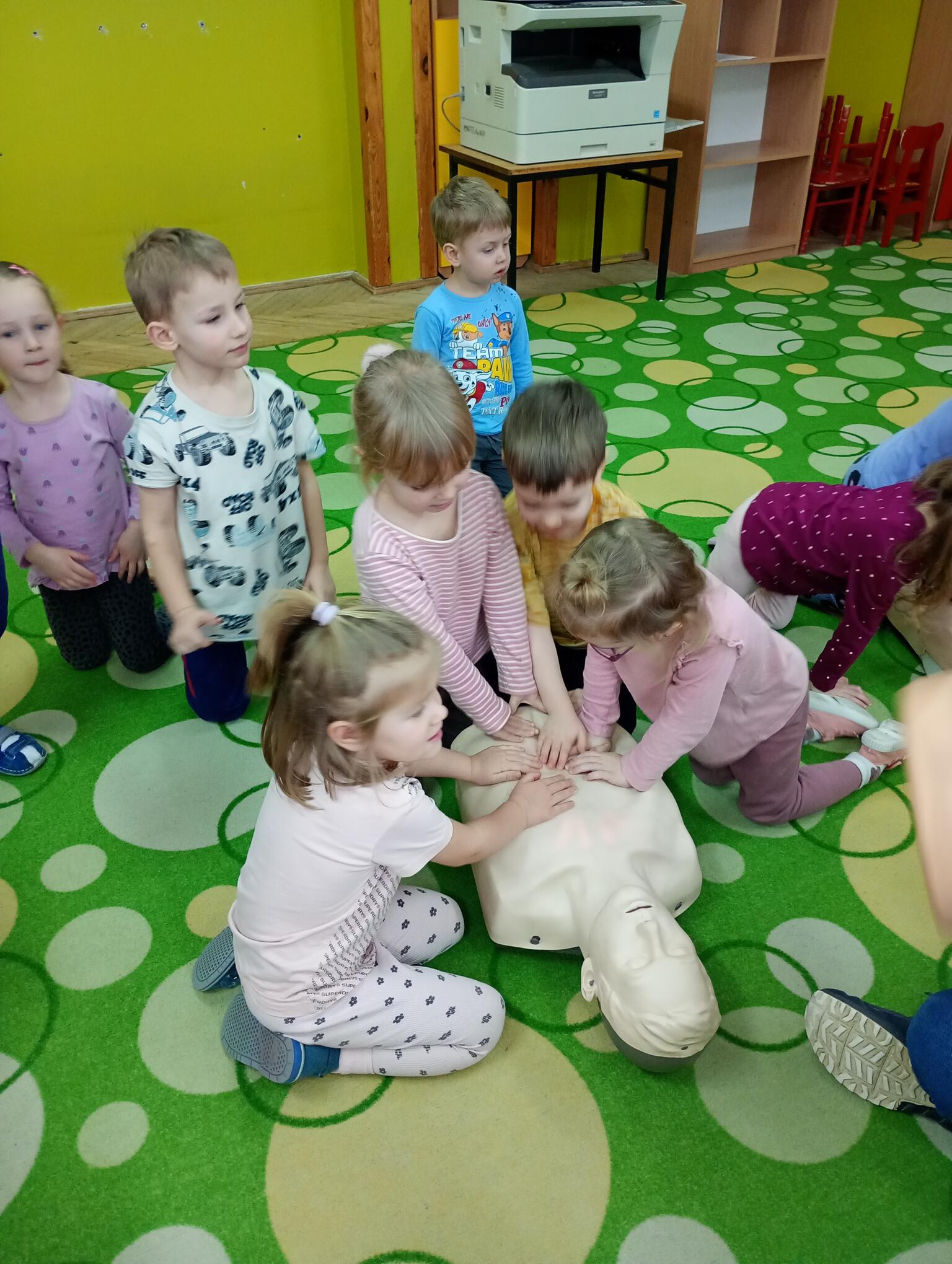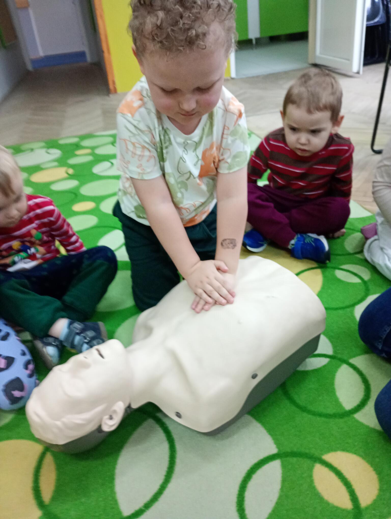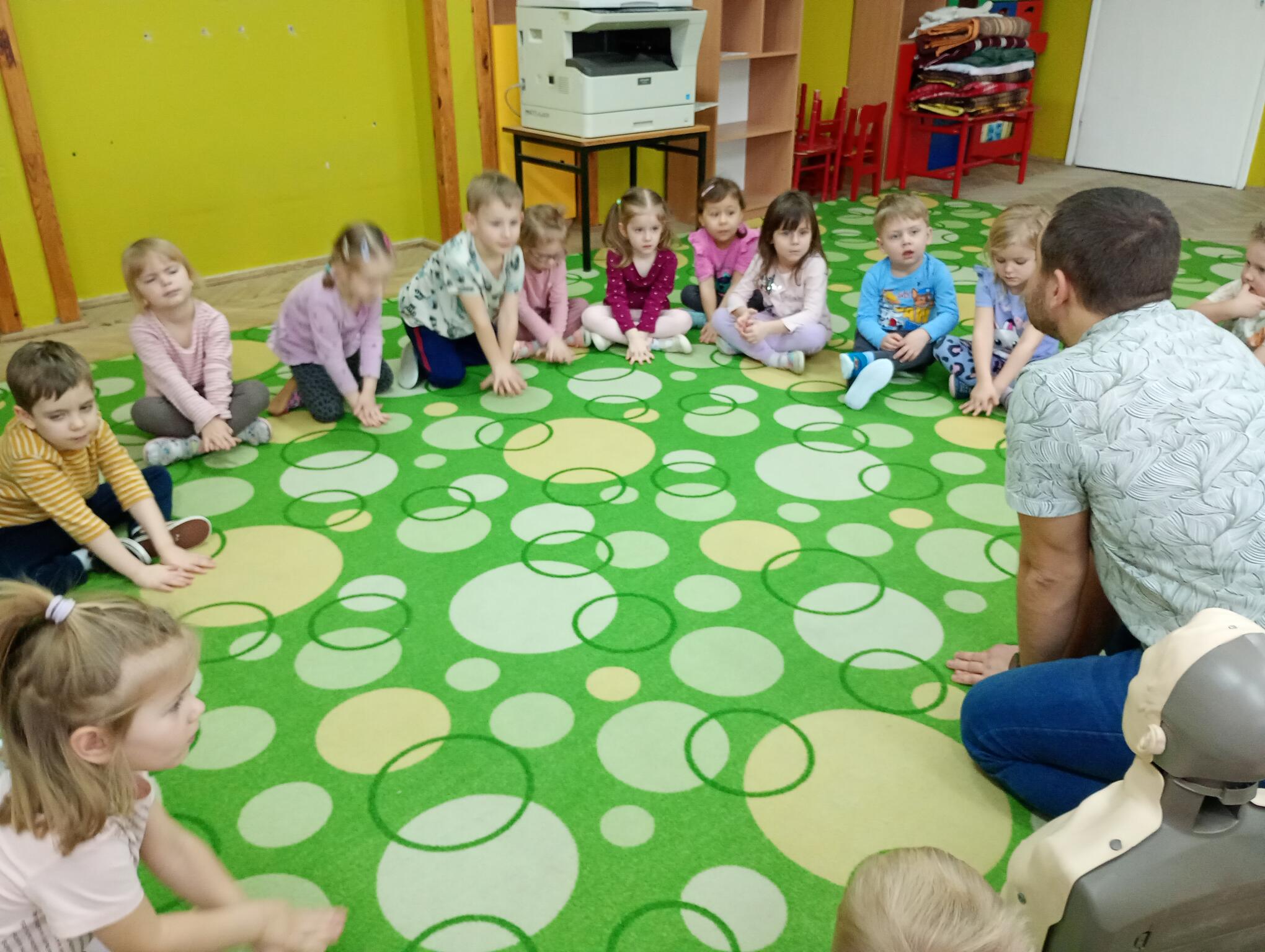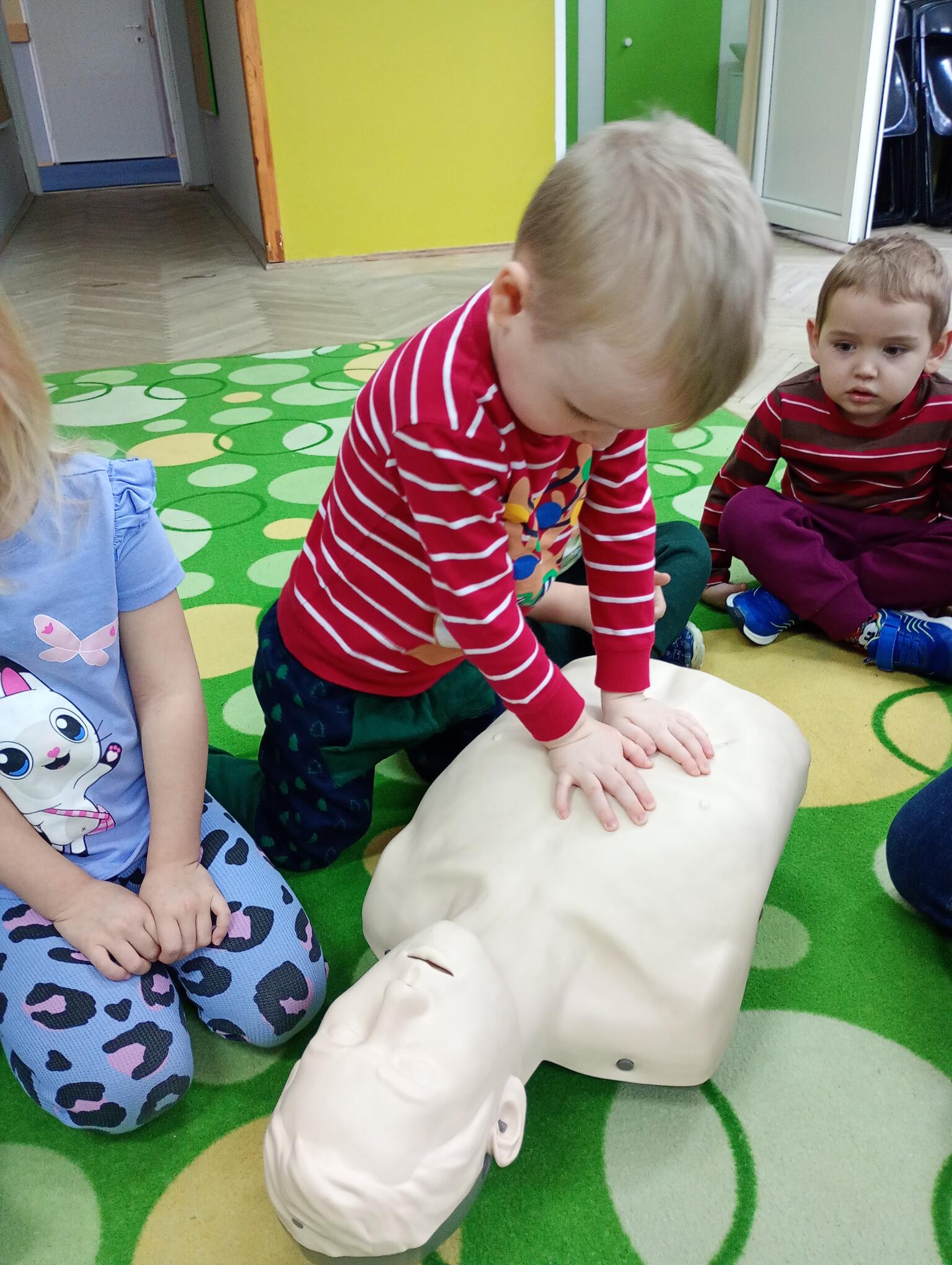 Dzisiaj grupa Puchatków brała udział w zajęciach z ratownictwa. Dzieci odwiedził sam ratownik medyczny, który w najprostszy sposób zapoznał przedszkolaków z najważniejszymi zasadami ratowania komuś życia. Maluszki poznały numer alarmowy 112, mogły spróbować przeprowadzić masaż serca na fantomach i ułożyć w pozycji bocznej „nieprzytomną” ciocię Martę.