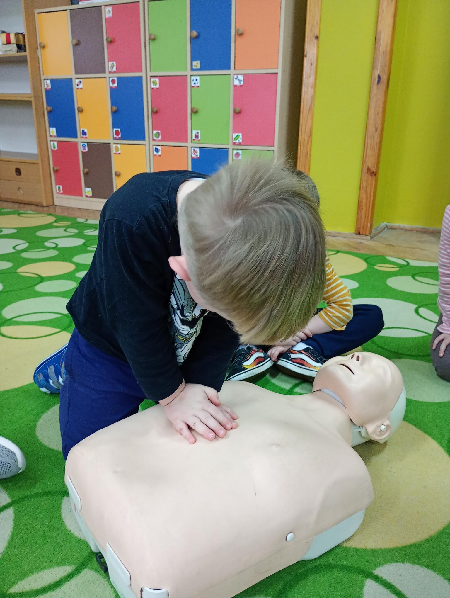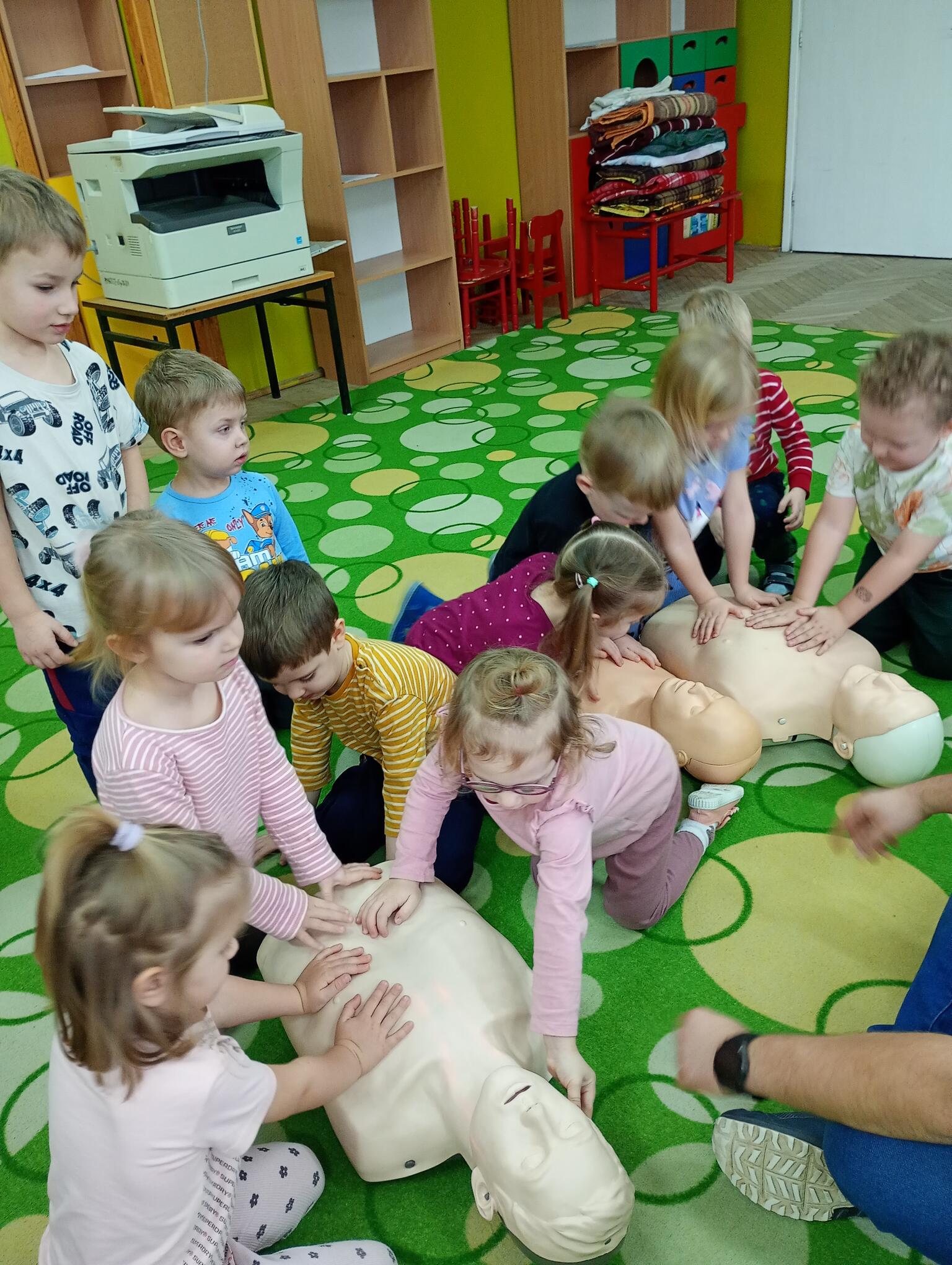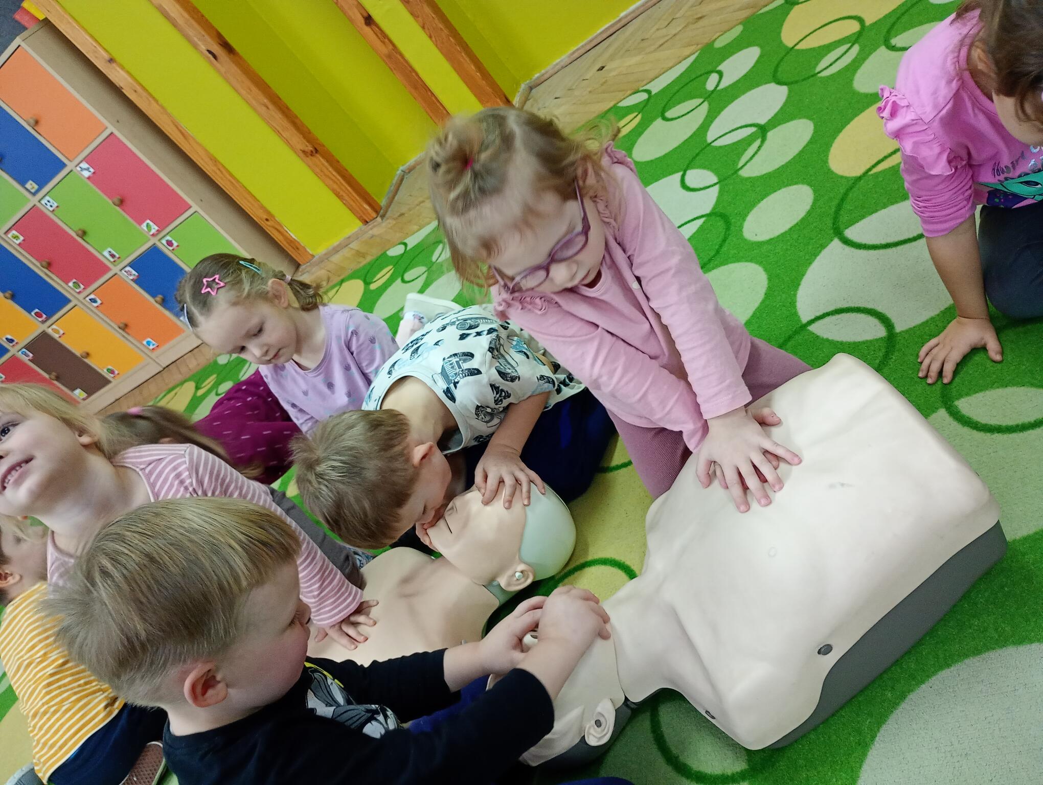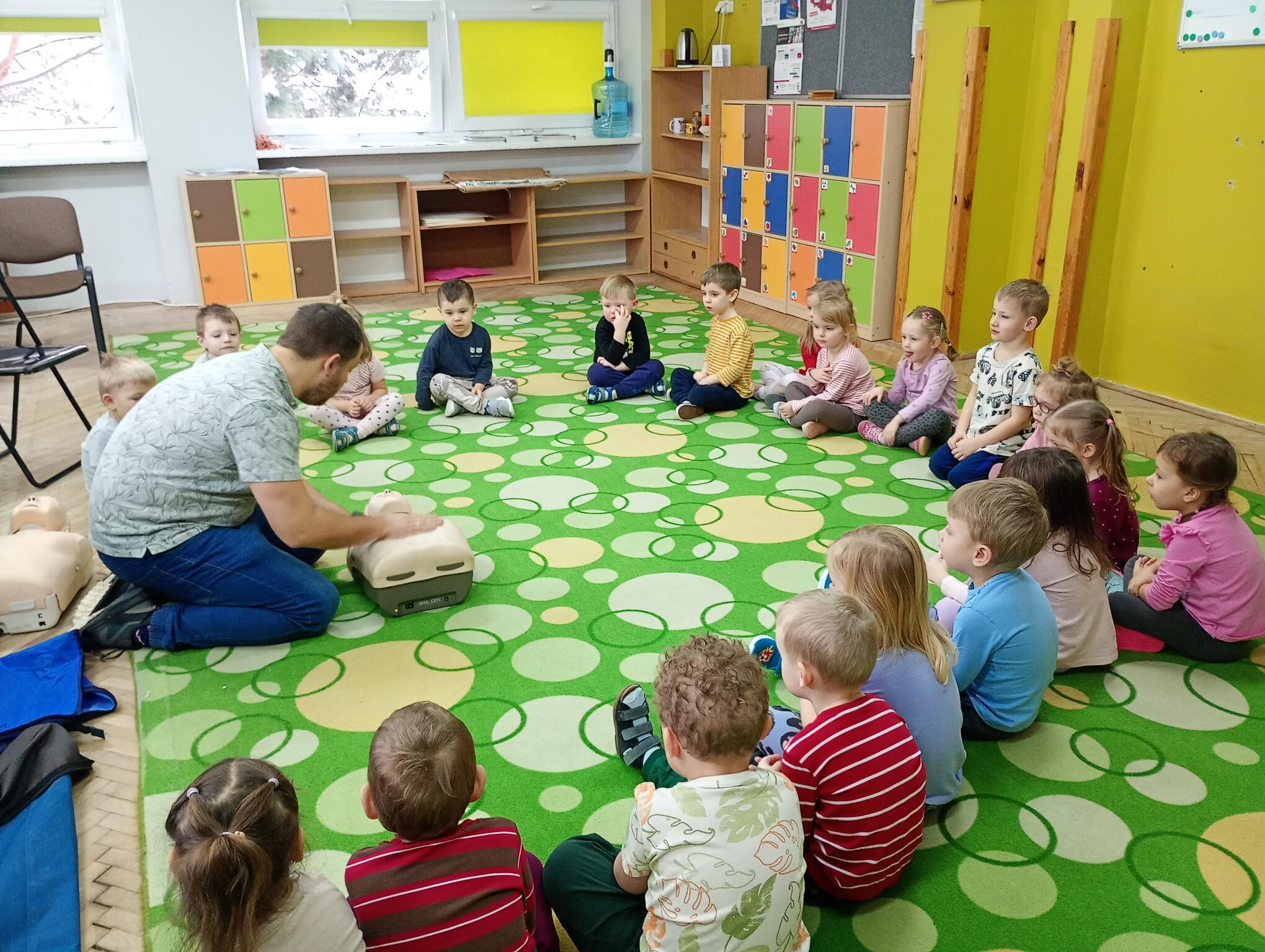 Dzisiaj grupa Puchatków brała udział w zajęciach z ratownictwa. Dzieci odwiedził sam ratownik medyczny, który w najprostszy sposób zapoznał przedszkolaków z najważniejszymi zasadami ratowania komuś życia. Maluszki poznały numer alarmowy 112, mogły spróbować przeprowadzić masaż serca na fantomach i ułożyć w pozycji bocznej „nieprzytomną” ciocię Martę.