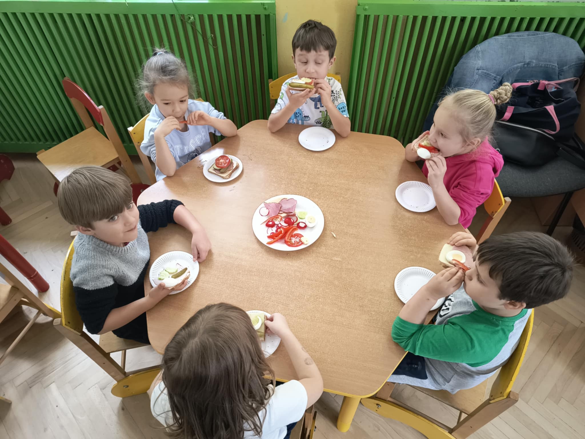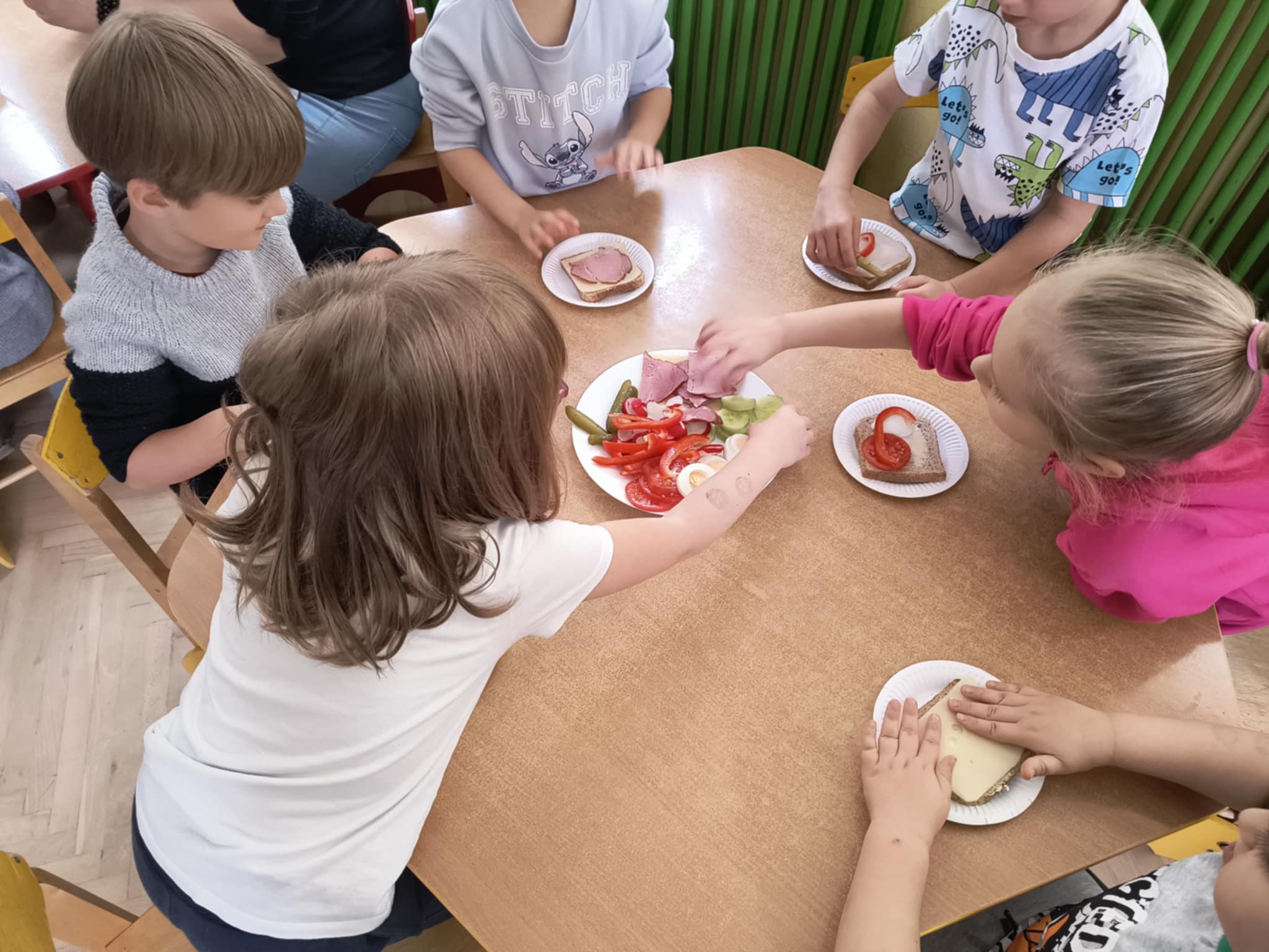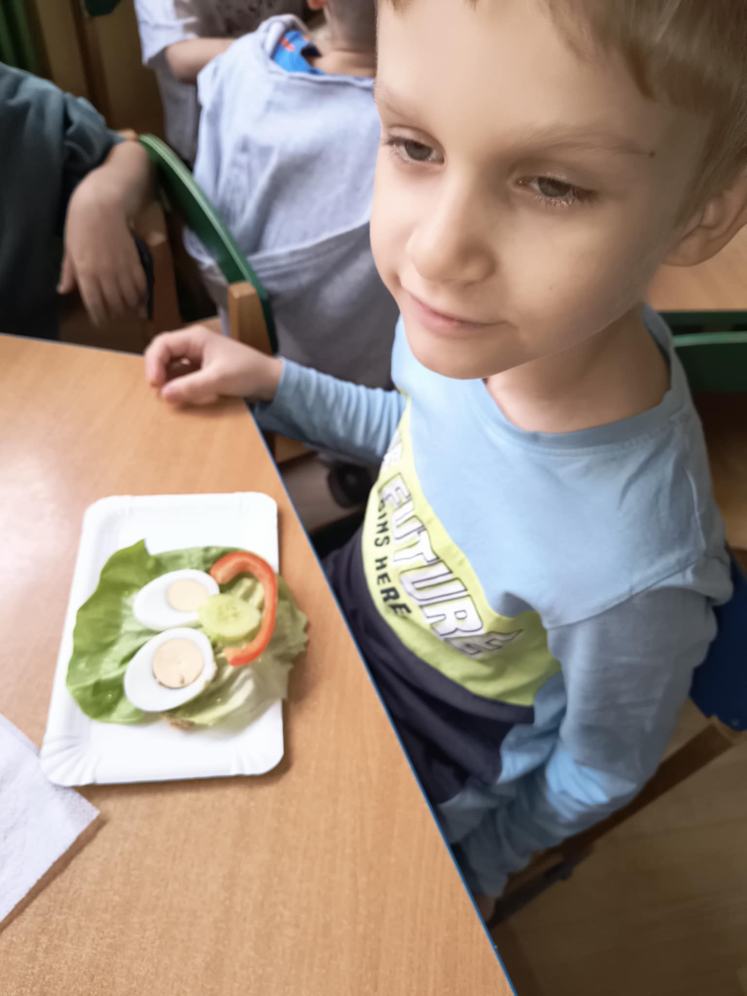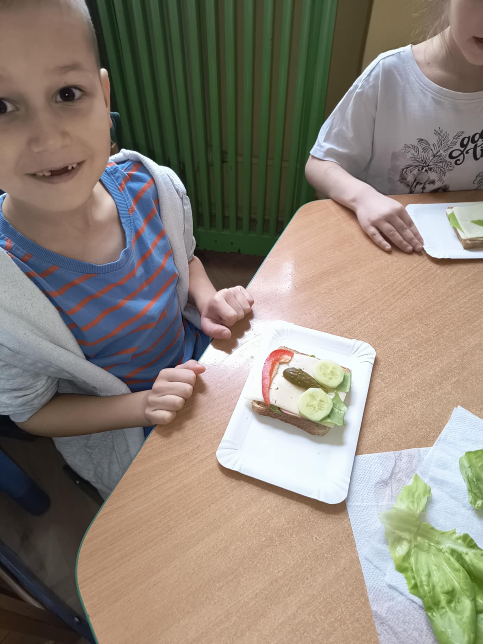 W grupie „Jeżyków” rozmawialiśmy o tym, jak ważne jest zdrowe odżywianie. Dzieci poznały piramidę zdrowego żywienia, dowiedziały się, jakie produkty warto jeść codziennie, a które tylko od czasu do czasu. Rozmawialiśmy o tym, jak jedzenie wpływa na nasze zdrowie, siłę i dobre samopoczucie. Na zakończenie zajęć wspólnie przygotowaliśmy pyszne, chrupiące kanapki pełne zdrowia – z warzywami, serem i kolorowymi dodatkami. Było smacznie, zdrowo i wesoło.