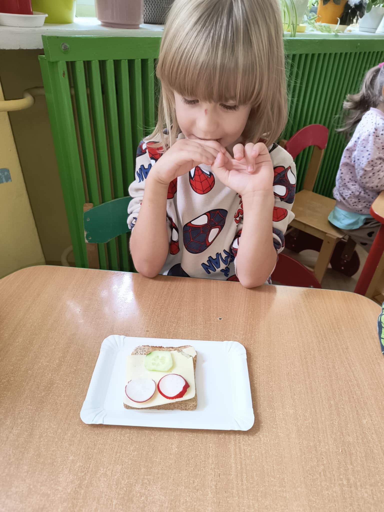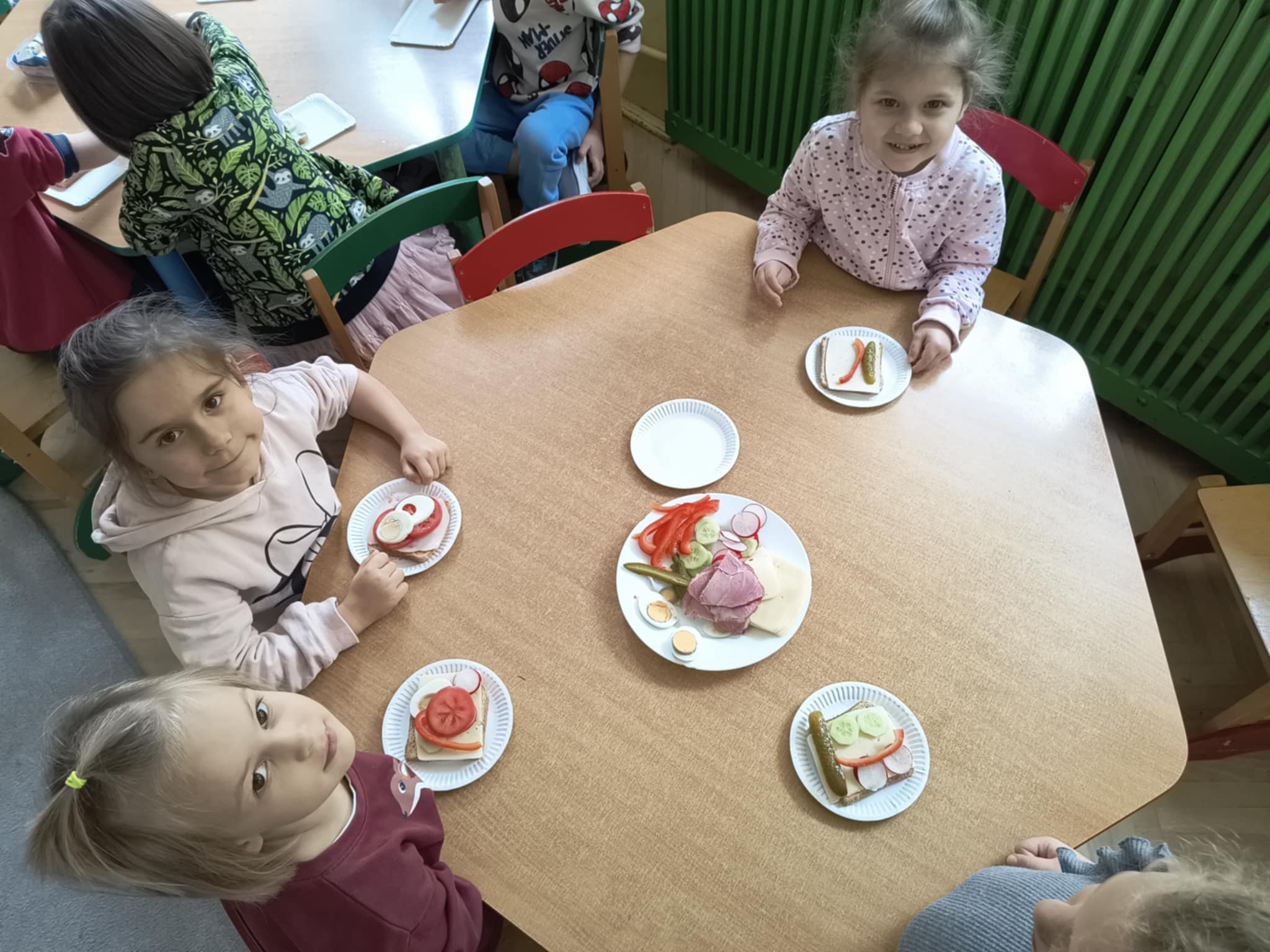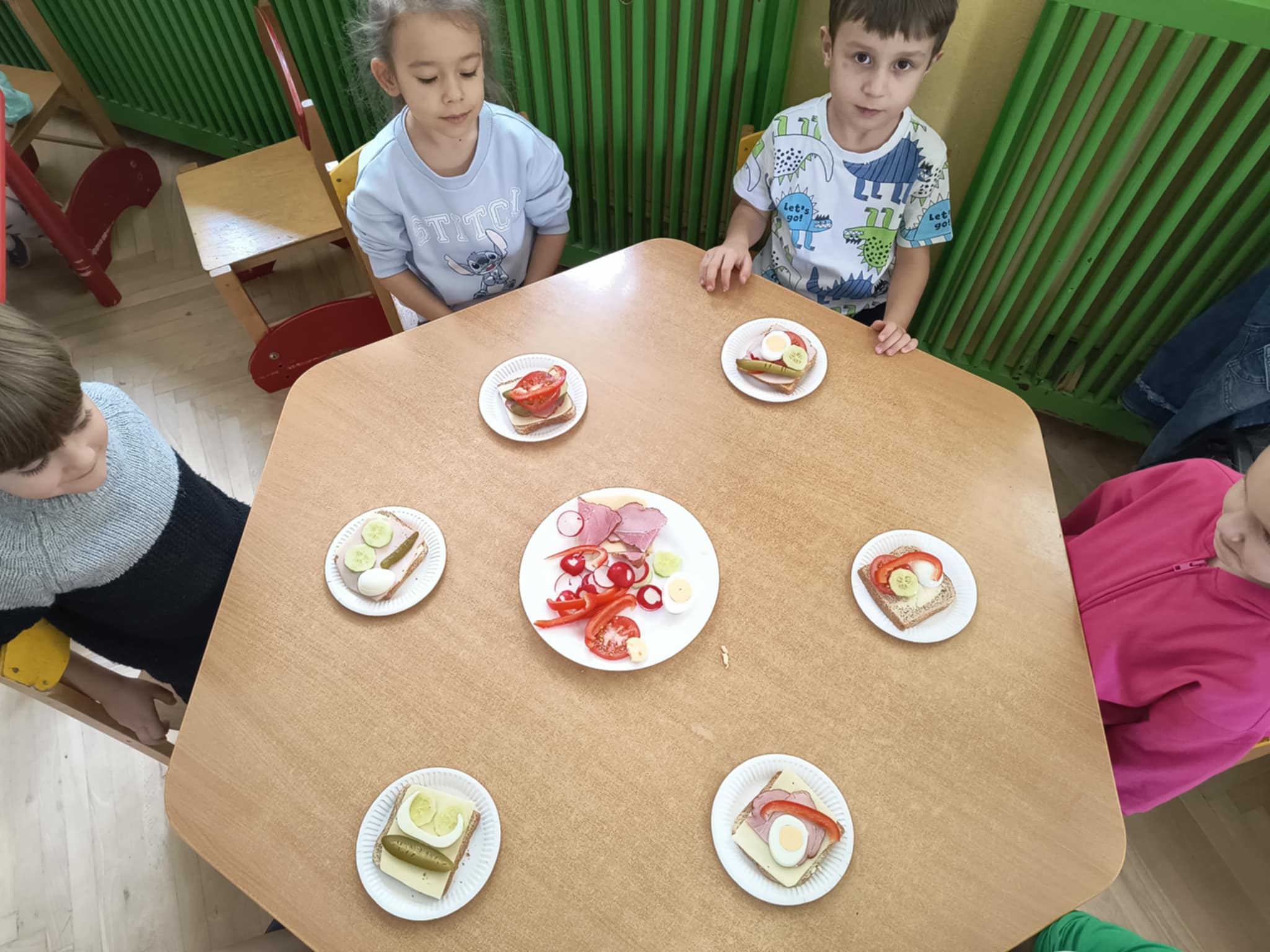 W grupie „Jeżyków” rozmawialiśmy o tym, jak ważne jest zdrowe odżywianie. Dzieci poznały piramidę zdrowego żywienia, dowiedziały się, jakie produkty warto jeść codziennie, a które tylko od czasu do czasu. Rozmawialiśmy o tym, jak jedzenie wpływa na nasze zdrowie, siłę i dobre samopoczucie. Na zakończenie zajęć wspólnie przygotowaliśmy pyszne, chrupiące kanapki pełne zdrowia – z warzywami, serem i kolorowymi dodatkami. Było smacznie, zdrowo i wesoło.