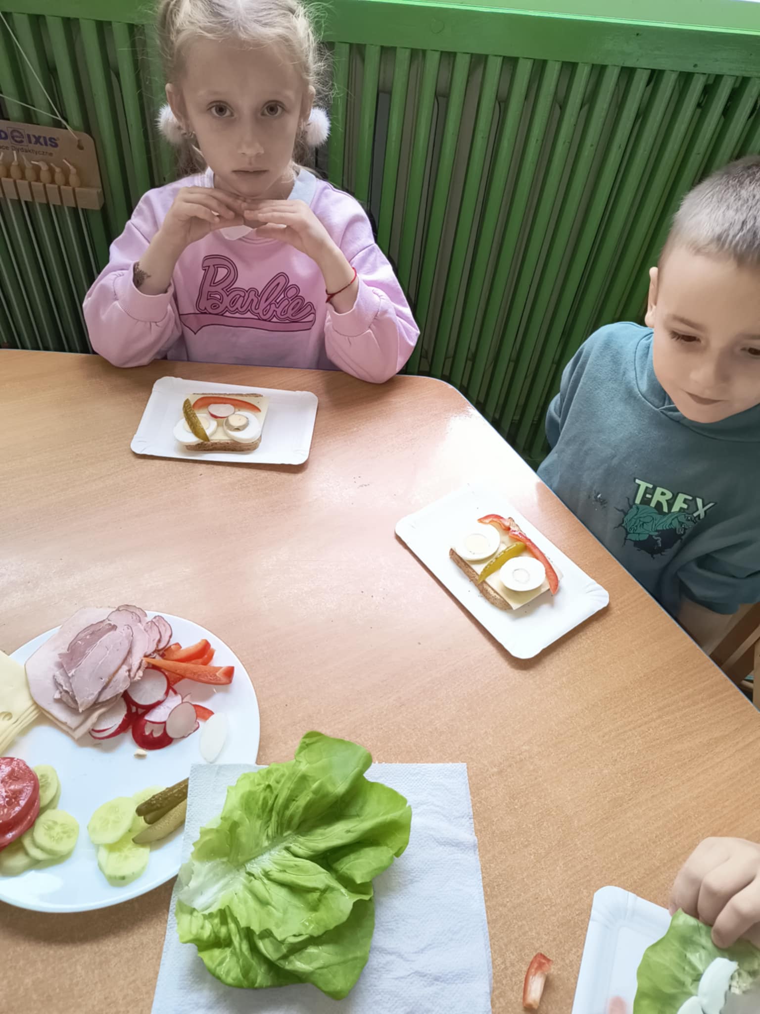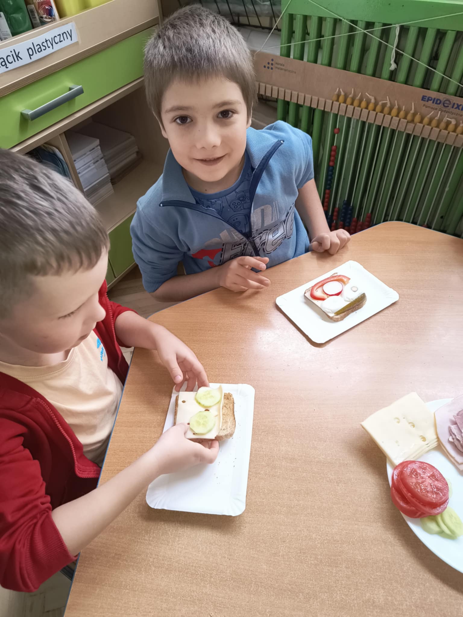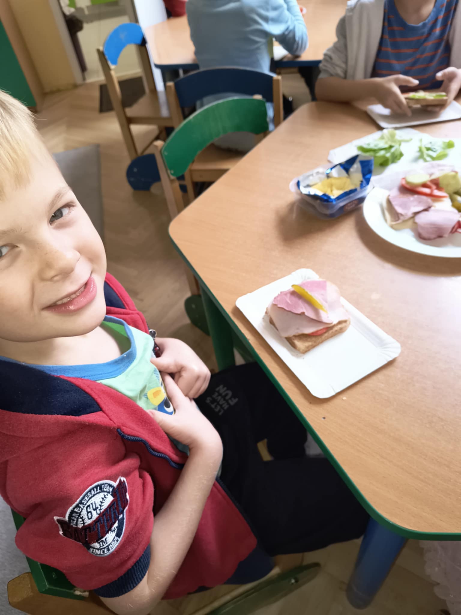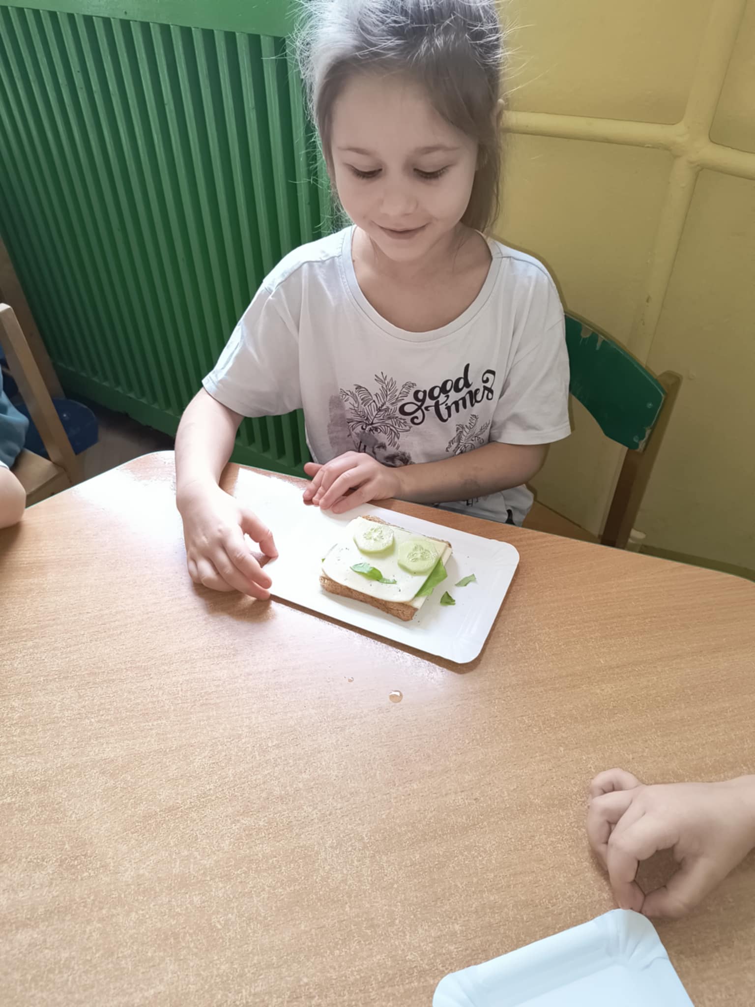 W grupie „Jeżyków” rozmawialiśmy o tym, jak ważne jest zdrowe odżywianie. Dzieci poznały piramidę zdrowego żywienia, dowiedziały się, jakie produkty warto jeść codziennie, a które tylko od czasu do czasu. Rozmawialiśmy o tym, jak jedzenie wpływa na nasze zdrowie, siłę i dobre samopoczucie. Na zakończenie zajęć wspólnie przygotowaliśmy pyszne, chrupiące kanapki pełne zdrowia – z warzywami, serem i kolorowymi dodatkami. Było smacznie, zdrowo i wesoło.